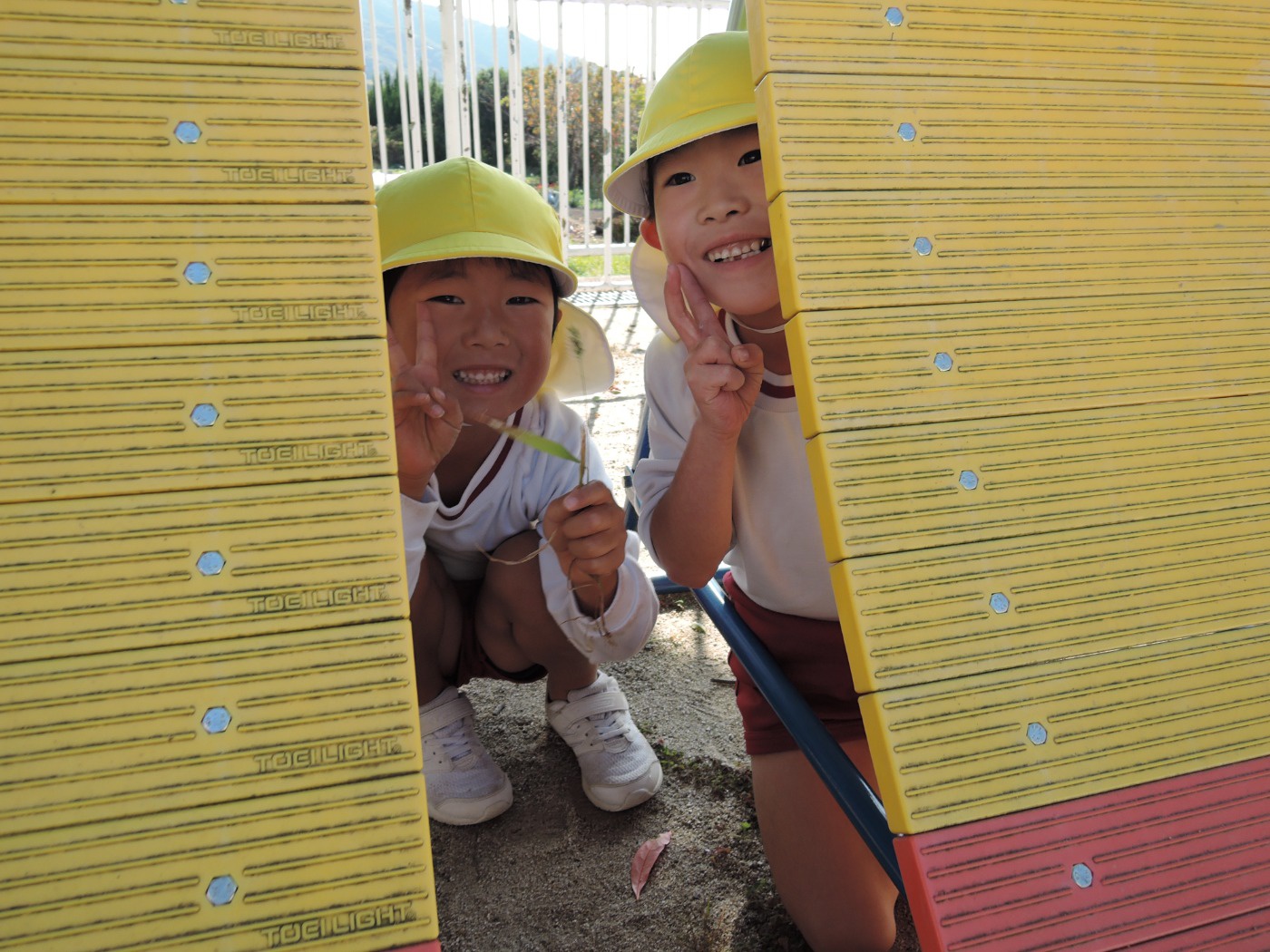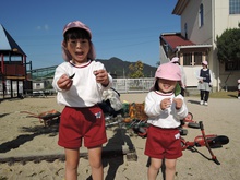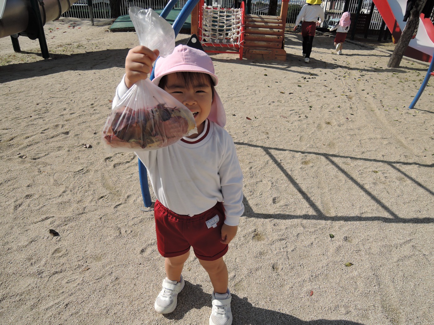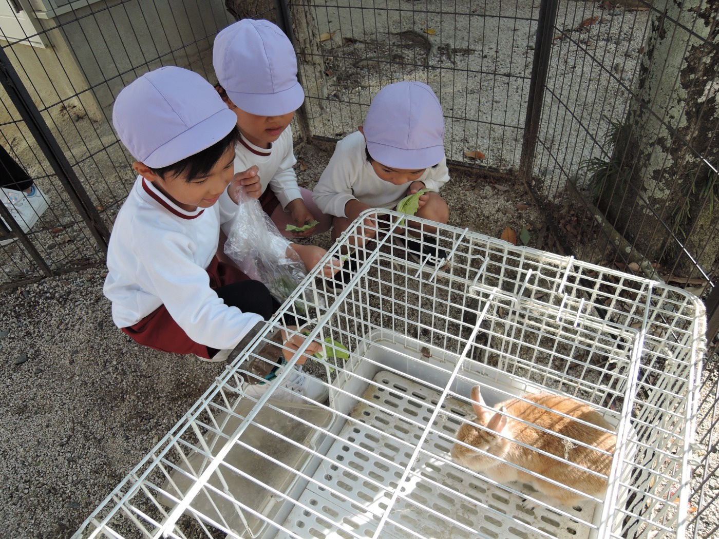 気持ちのよい秋の空気の中、園庭では自由遊び。きれいな落ち葉を集めたり、三輪車に乗ったり、木登りしたり、うさぎにキャベツの葉をあげたり・・・ 笑顔があふれます。来年度入園のいちご組の小さなお友だちも遊びに来ました。お兄ちゃん、お姉ちゃんたちに手をつないでもらって、園庭を案内してもらいます。もう少し秋が続くと嬉しいですね。