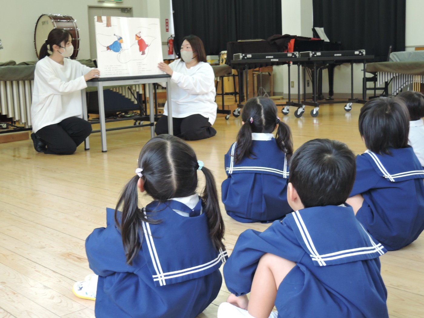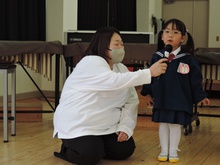 サンタさんからのお手紙が届いた次の日、小さいお友だちと大きいお友だちに分かれて、クリスマス会をしました。小さいお友だちがひよこ組のお部屋に集まって、クリスマスの絵本を読んでもらったりクイズを楽しんだりしていると、プレゼントを持ったサンタさんが登場。びっくりして泣き出したり、お口がポカンと空いたり、大喜びしたりして、いろいろな顔が入り混じっていました。ホールでは大きいお友だちが集まって、うそほんとゲームで大盛り上がり。先生からのトーンチャイムの音楽のプレゼントはとても美しかったです。クリスマスの歌を元気よく歌っていると、遠くから鈴の音。約束通り、サンタさんがプレゼントを持って来てくれました。「どうして赤い服を着ているの?」「いつもメガネをかけているのはなぜ?」子どもたちの質問にも丁寧に答えてくれたサンタさん。来年もまた来てくださいね。ホールに飾られたクリスマスのリースやお人形、とっても素敵です。お家に持って帰って飾ってくださいね。