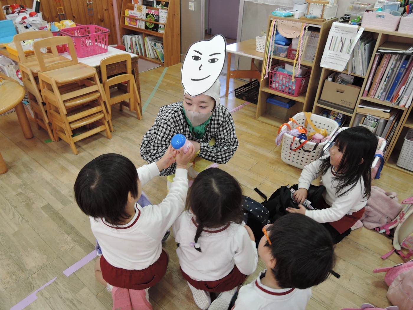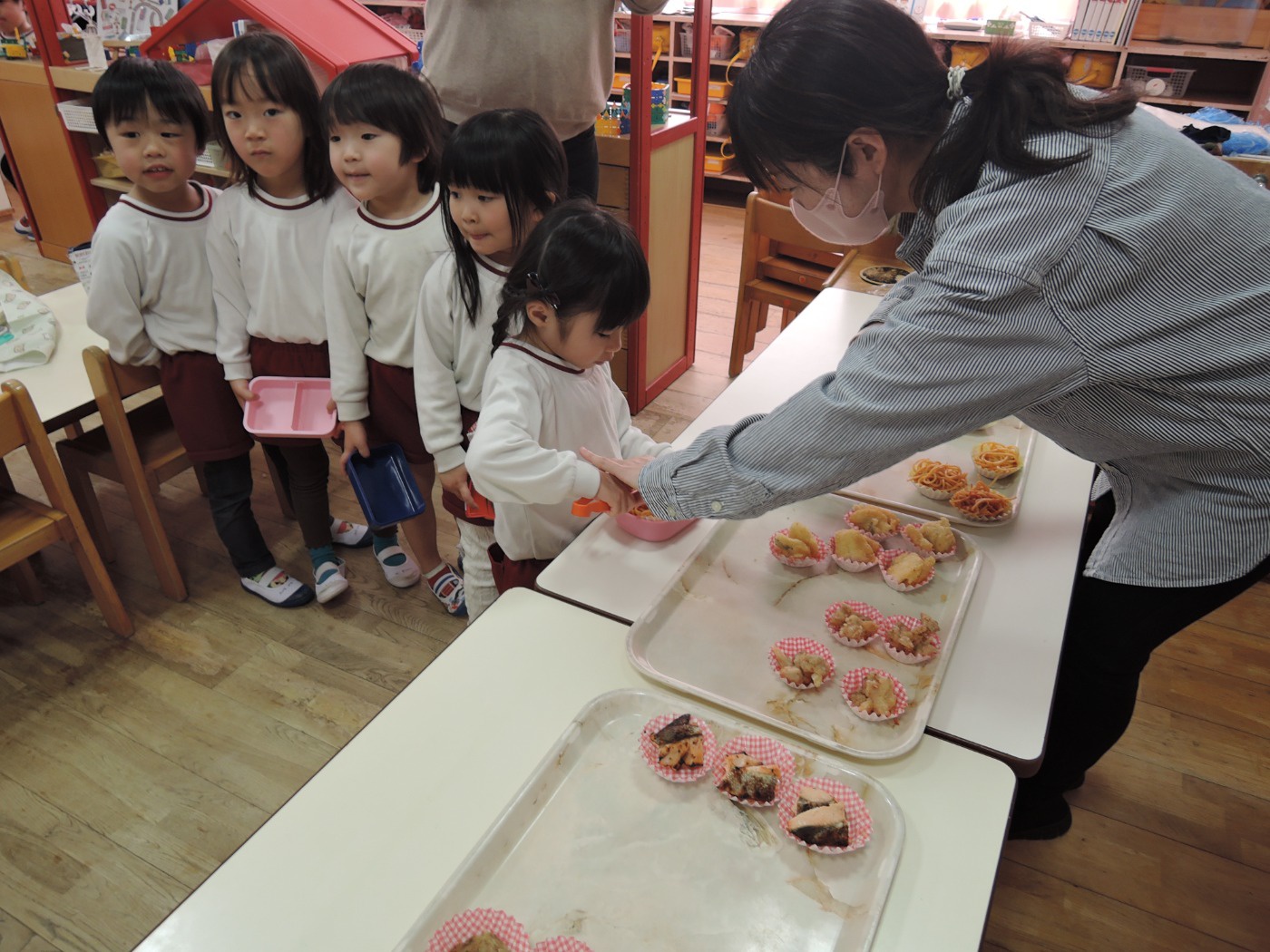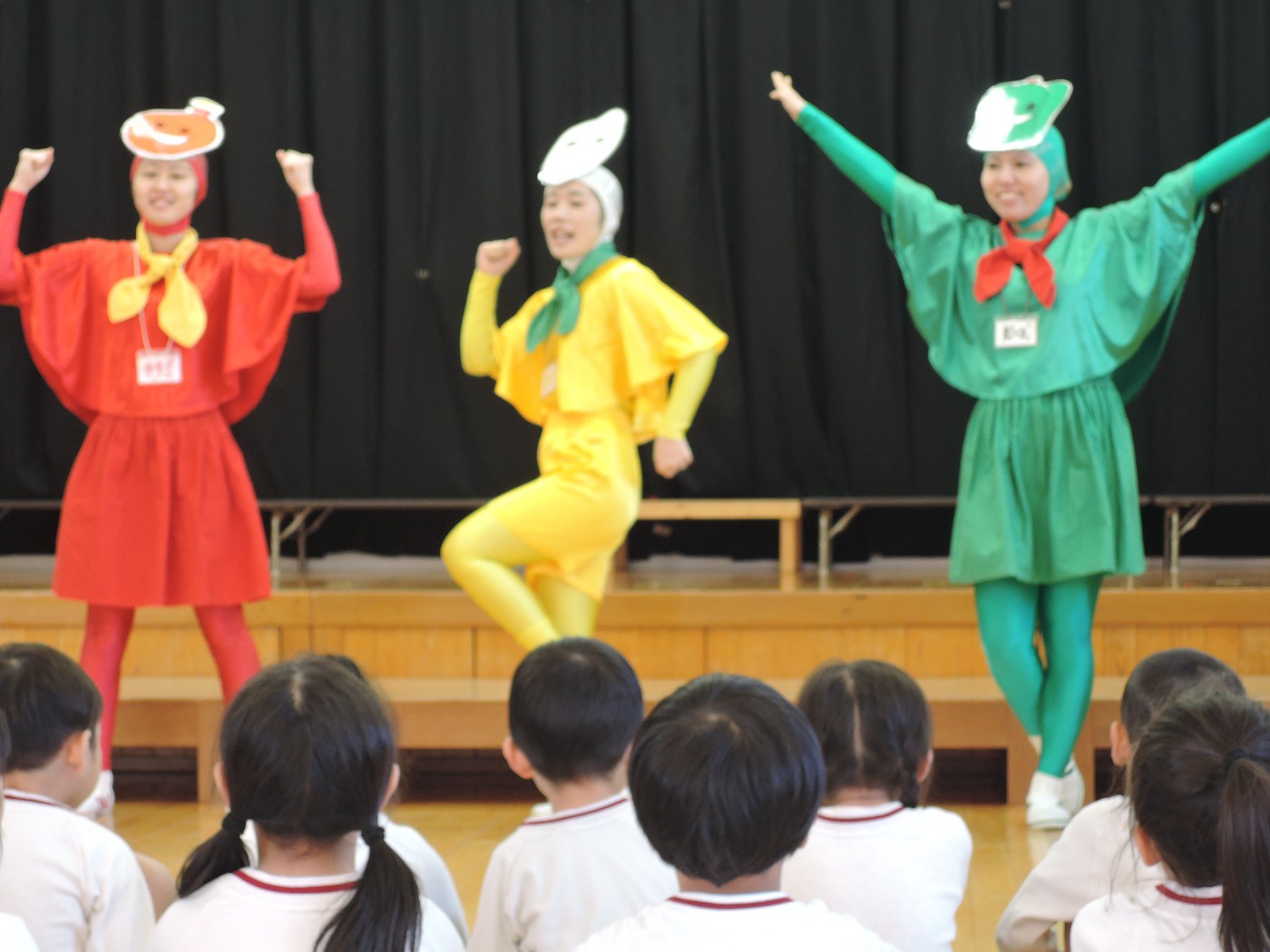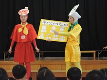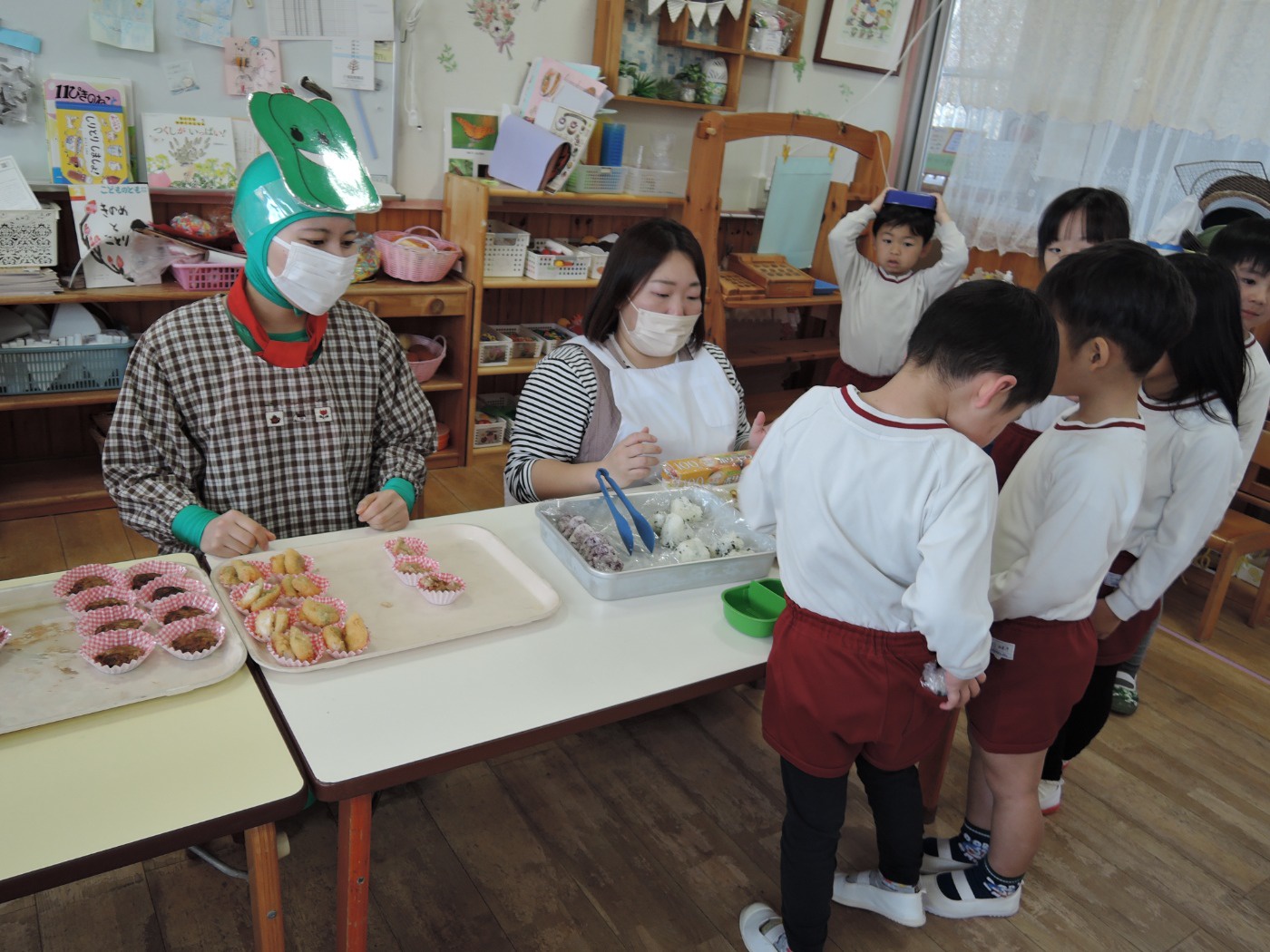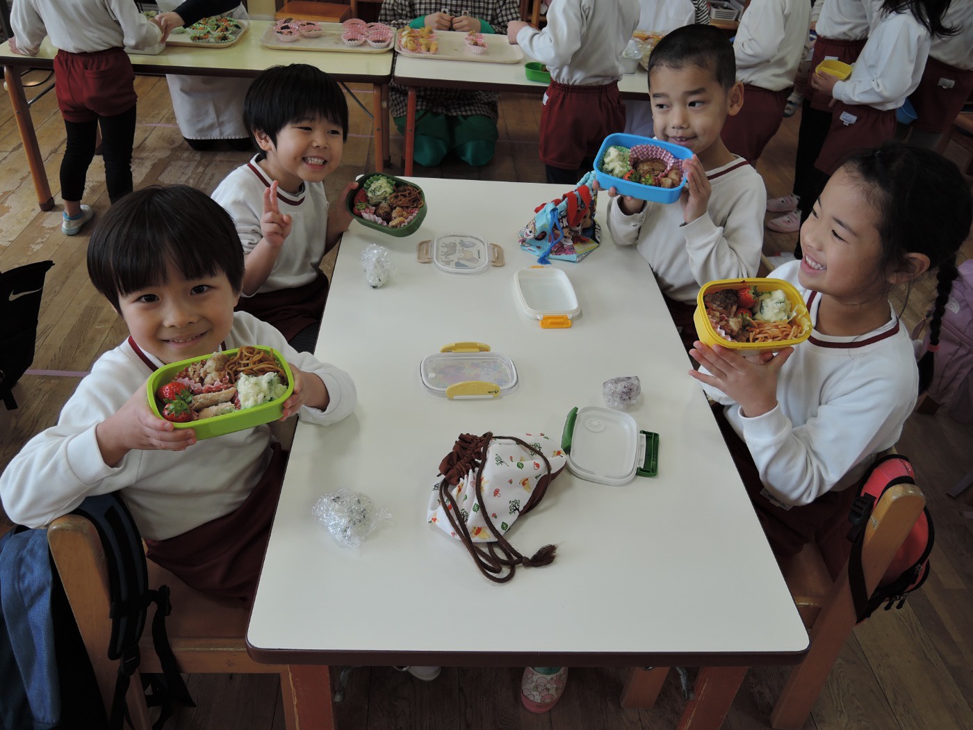 保育園のセレクト空べんとうの日、山口県立大学から「食育戦隊ゴハンジャー」が来てくださいました。栄養士の先生から『それいけ!ゴハンジャー!!』の絵本を読んでもらうと、ゴハンジャーが登場。赤・黄・緑の3つの大切な栄養素について教えてもらいました。お部屋に戻って、持ってきたおべんとう箱に赤・黄・緑の中からそれぞれ2つずつ選んで、上手に詰めていきました。ゴハンジャーもお手伝いをしてくれました。豪華なおべんとうの完成です。これからもバランスよくいっぱい食べて大きくなってね。