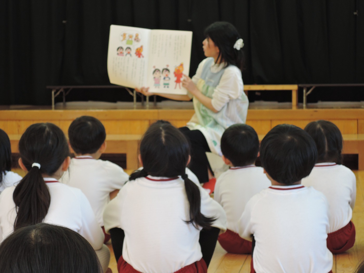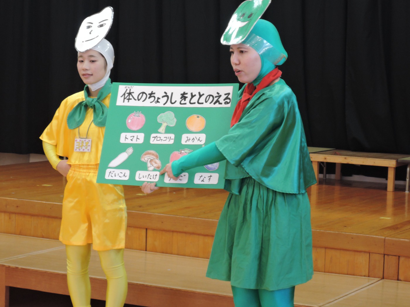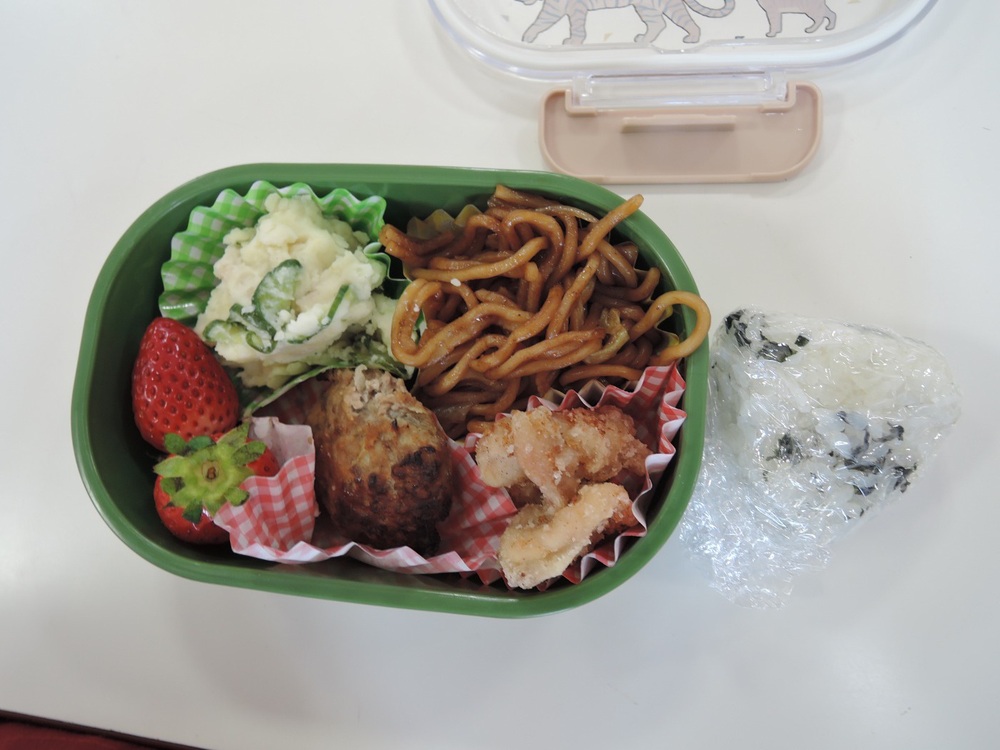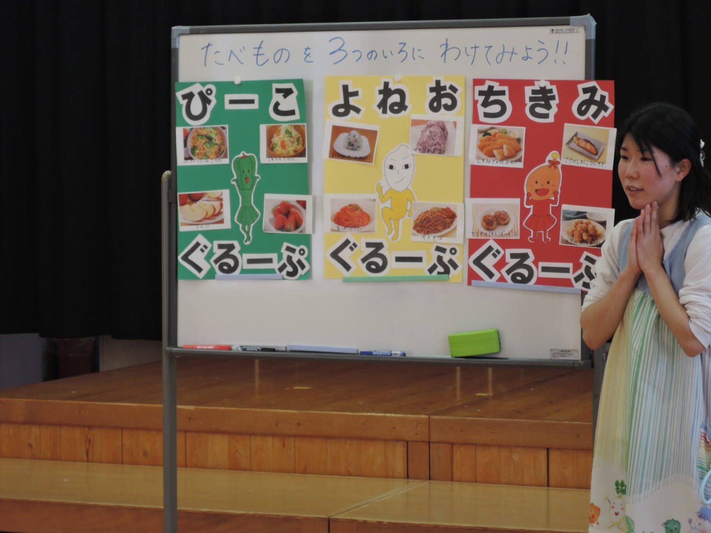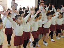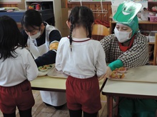 保育園のセレクト空べんとうの日、山口県立大学から「食育戦隊ゴハンジャー」が来てくださいました。栄養士の先生から『それいけ!ゴハンジャー!!』の絵本を読んでもらうと、ゴハンジャーが登場。赤・黄・緑の3つの大切な栄養素について教えてもらいました。お部屋に戻って、持ってきたおべんとう箱に赤・黄・緑の中からそれぞれ2つずつ選んで、上手に詰めていきました。ゴハンジャーもお手伝いをしてくれました。豪華なおべんとうの完成です。これからもバランスよくいっぱい食べて大きくなってね。