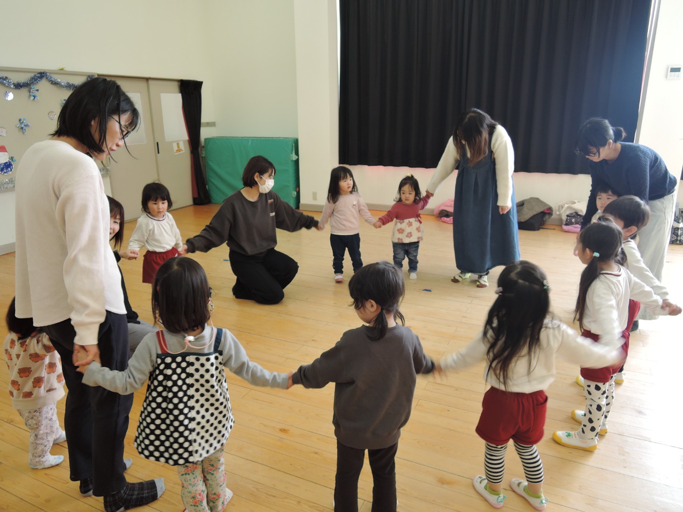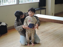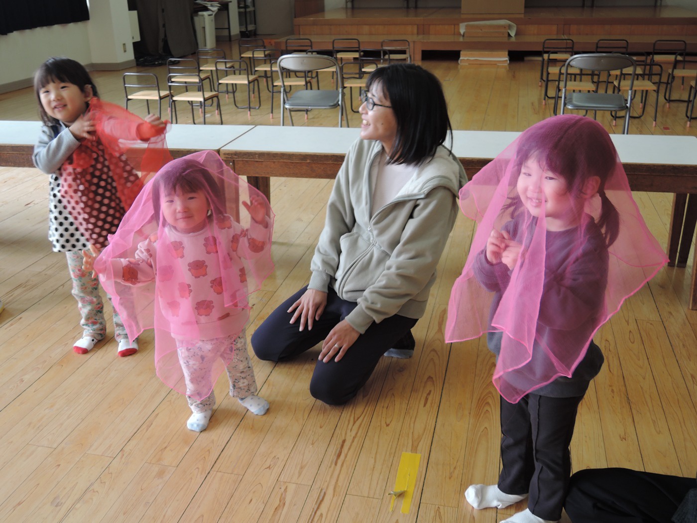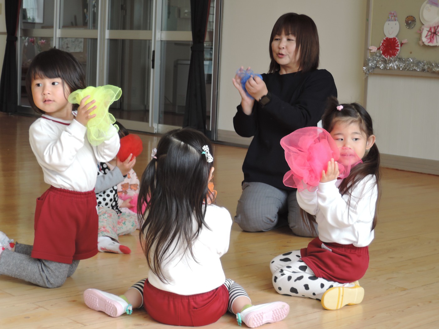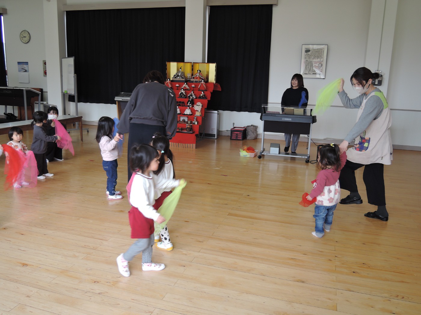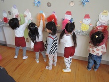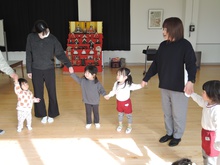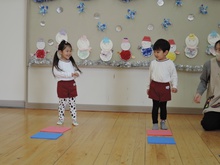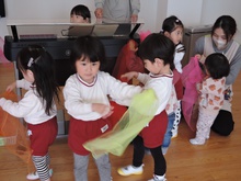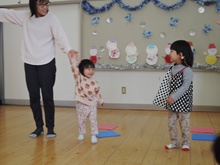 4月入園のいちご組の小さいお友だちと年々少のアイリス組が、一緒にリトミック教室に参加しました。みんなで輪になり、始めのごあいさつ。先生のエレクトーンの音に合わせて、体を揺らしたり止まったりしました。カラーのスカーフが登場すると、一気に笑顔が増えました。頭に被って「いないいないばあっ!」スカーフのお花を咲かせたり、チョウチョになって飛びまわったりしました。終わりも輪になってごあいさつ。いよいよ4月から入園のいちご組さん。みんな待っています。