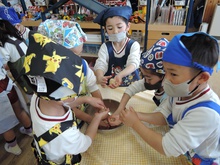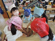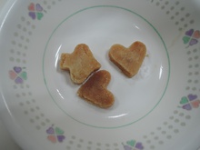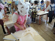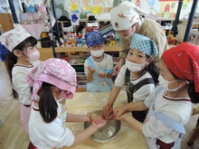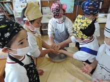 年長組最後のクッキングは「みそクッキー」! 材料(米粉、きび砂糖、豆乳、油、みそ)を計りにのせて、ピッタリの数字でストップさせるのに苦戦しました。次に材料をこねて生地を作りました。感触がよく、どのグループからも歓声があがりました。生地を広げて好きな形に型抜きするのが一番大変でした。形がくずれて何度もやり直していました。根気強い年長さんです。やっとの思いで完成!後はオーブンで焼いて出来上がりです。美味しくいただきました。ごちそうさまでした。またお家でも作ってみてね。