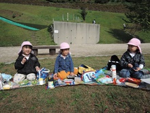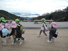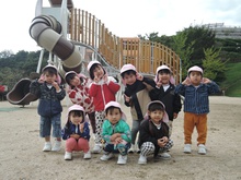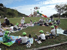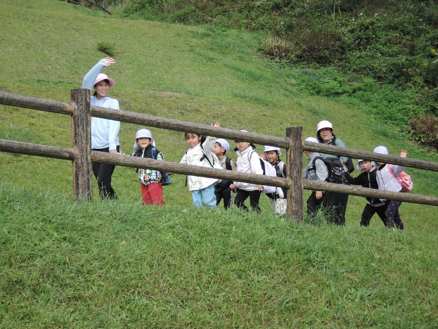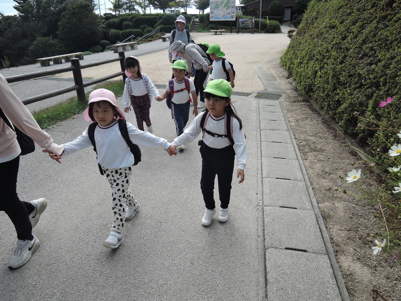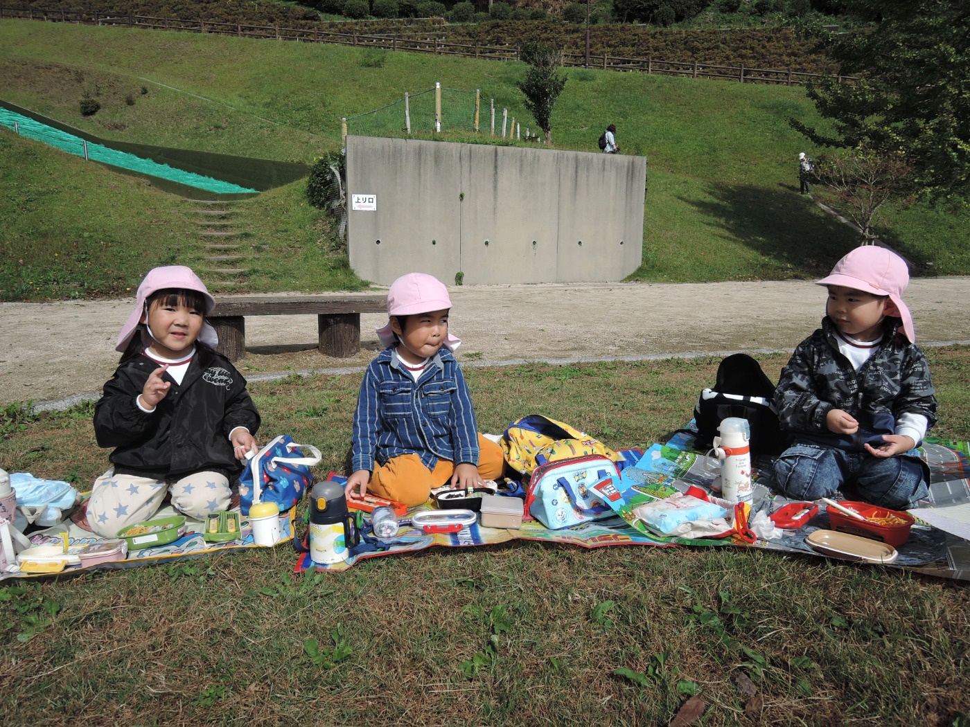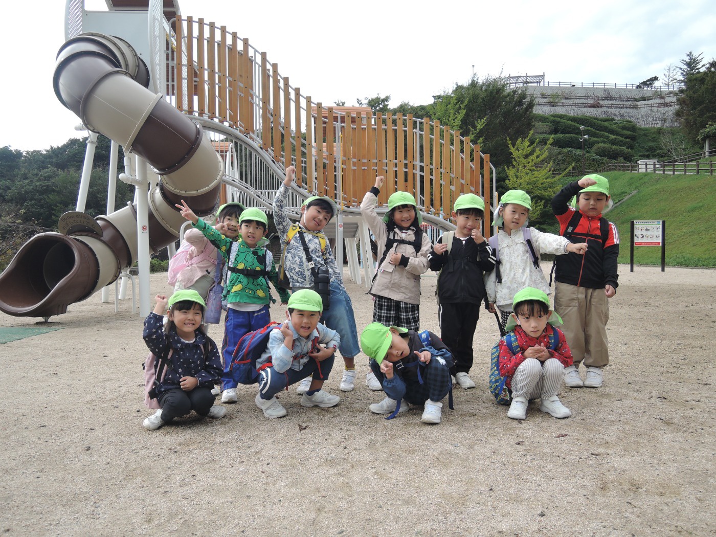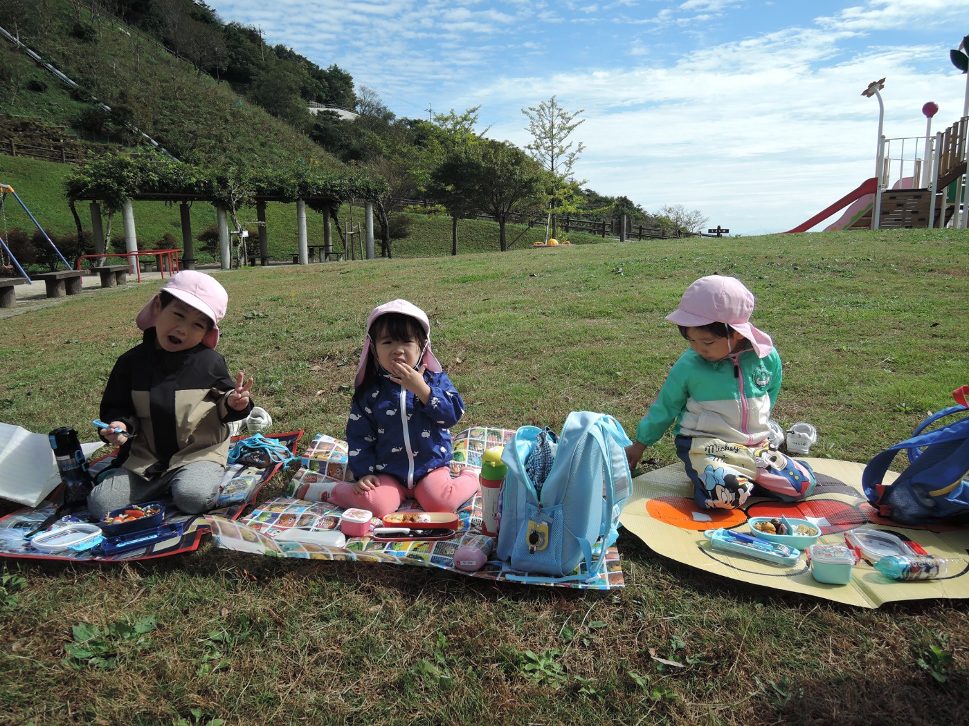 幼稚園のみんなでバスに乗って、大平山山頂公園に遠足へ出かけました。バスを降りると風が強く、寒く感じたのですが、お友だちと手をつないで歩いているうちに、気持ちの良い空気に変わっていきました。年長のゆり組さんは、年少のアイリス組さんの手を引いて、公園までの少し長い道を歩いてくれました。公園には新しい遊具も加わり、思いきり楽しみました。どんぐり拾いも盛り上がっていました。たくさん遊んでお腹はぺこぺこ。芝生の上で輪になって、みんなでお弁当を食べました。お家の人の手作りお弁当が嬉しくて、おしゃべりにも花が咲いていました。コスモスの花もきれいに咲いていましたね。