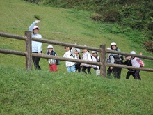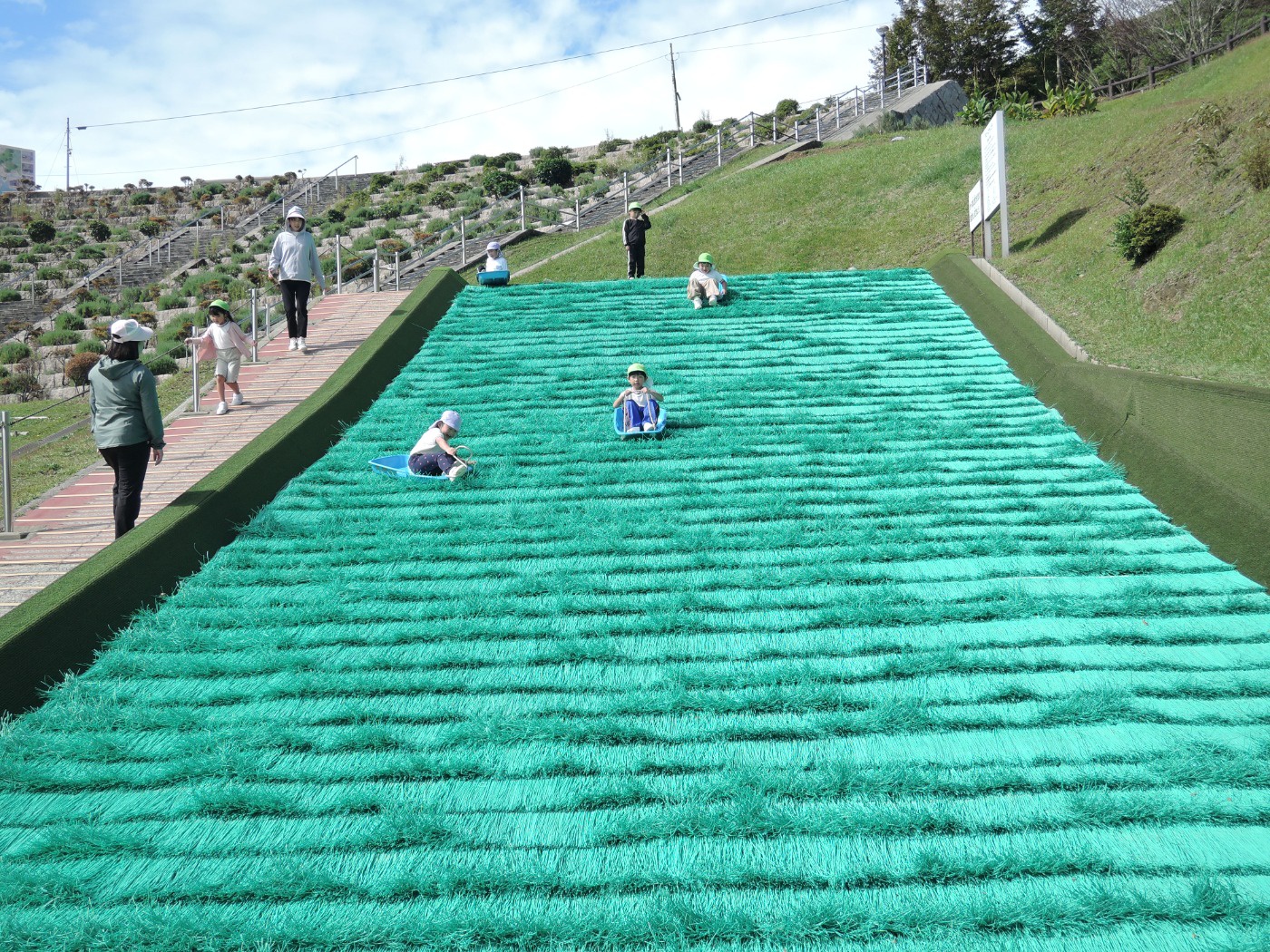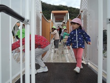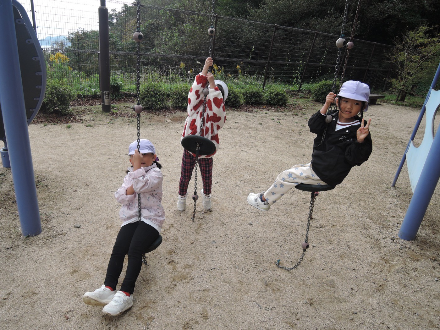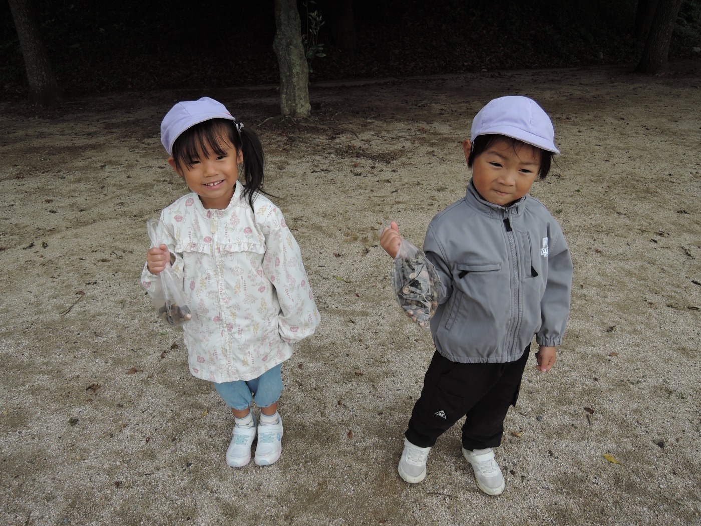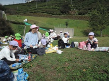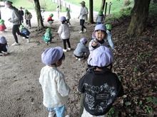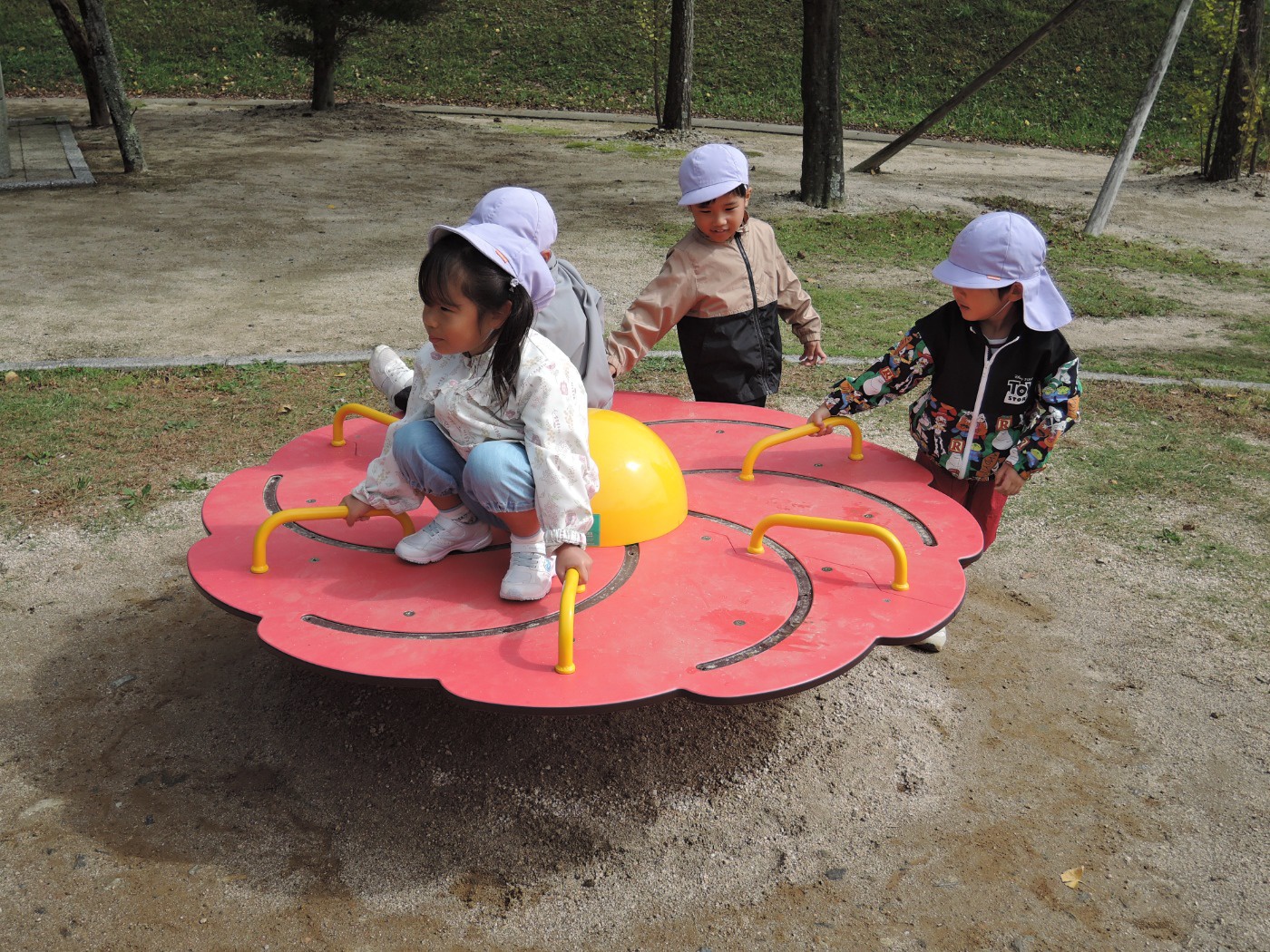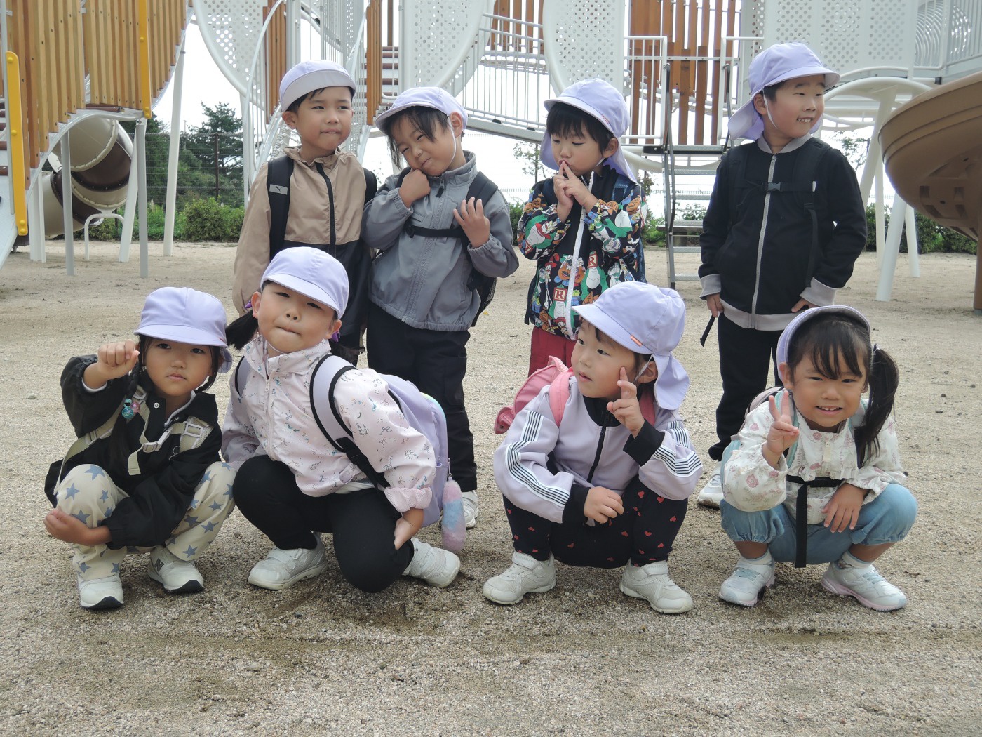 幼稚園のみんなでバスに乗って、大平山山頂公園に遠足へ出かけました。バスを降りると風が強く、寒く感じたのですが、お友だちと手をつないで歩いているうちに、気持ちの良い空気に変わっていきました。年長のゆり組さんは、年少のアイリス組さんの手を引いて、公園までの少し長い道を歩いてくれました。公園には新しい遊具も加わり、思いきり楽しみました。どんぐり拾いも盛り上がっていました。たくさん遊んでお腹はぺこぺこ。芝生の上で輪になって、みんなでお弁当を食べました。お家の人の手作りお弁当が嬉しくて、おしゃべりにも花が咲いていました。コスモスの花もきれいに咲いていましたね。