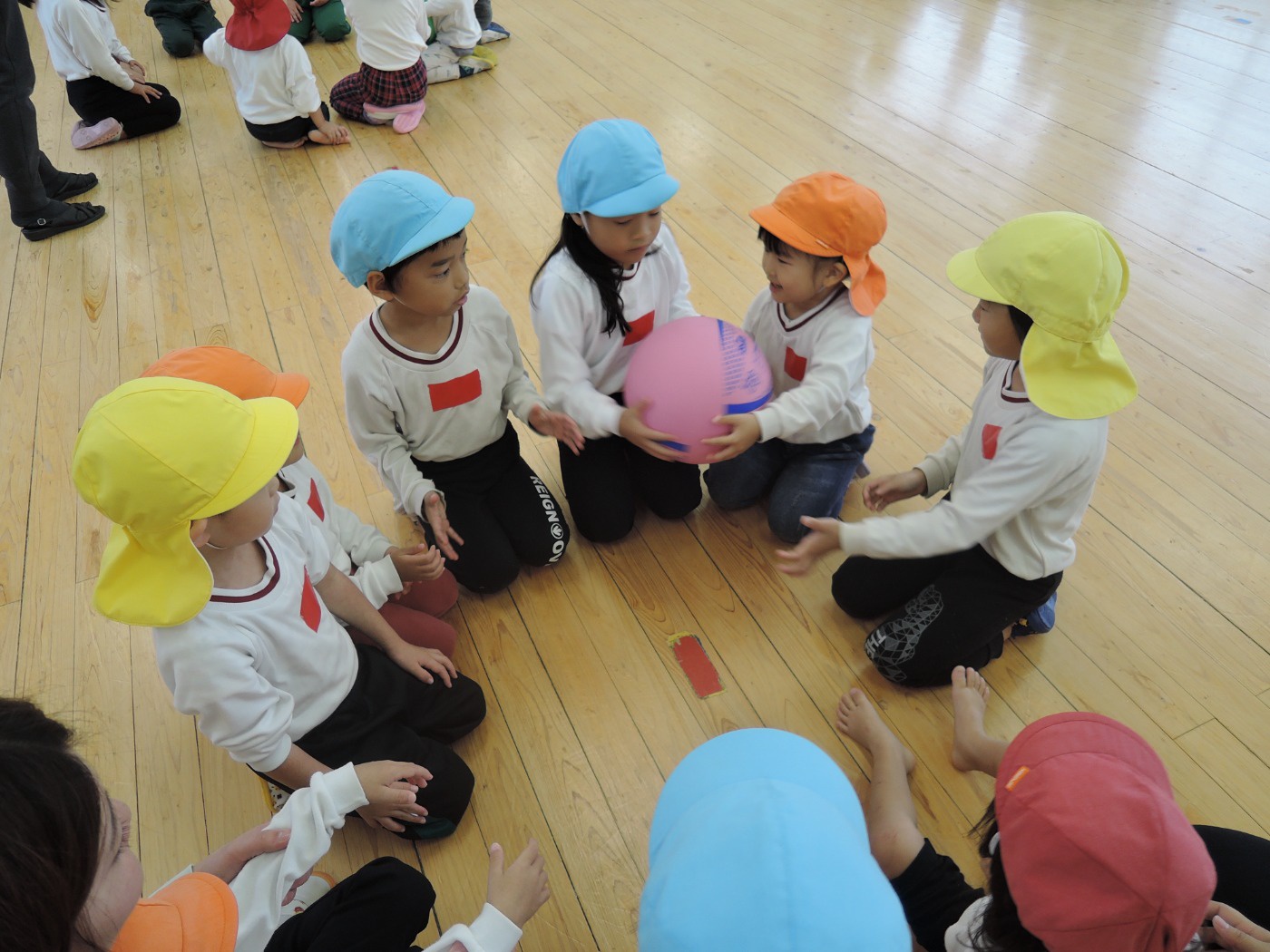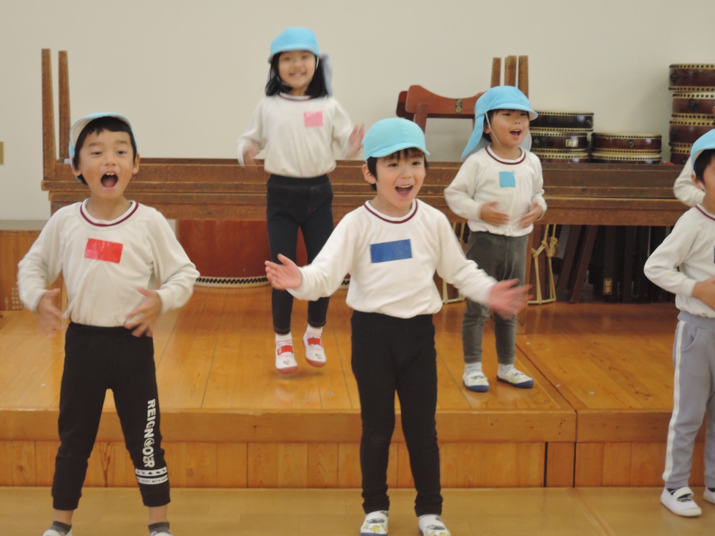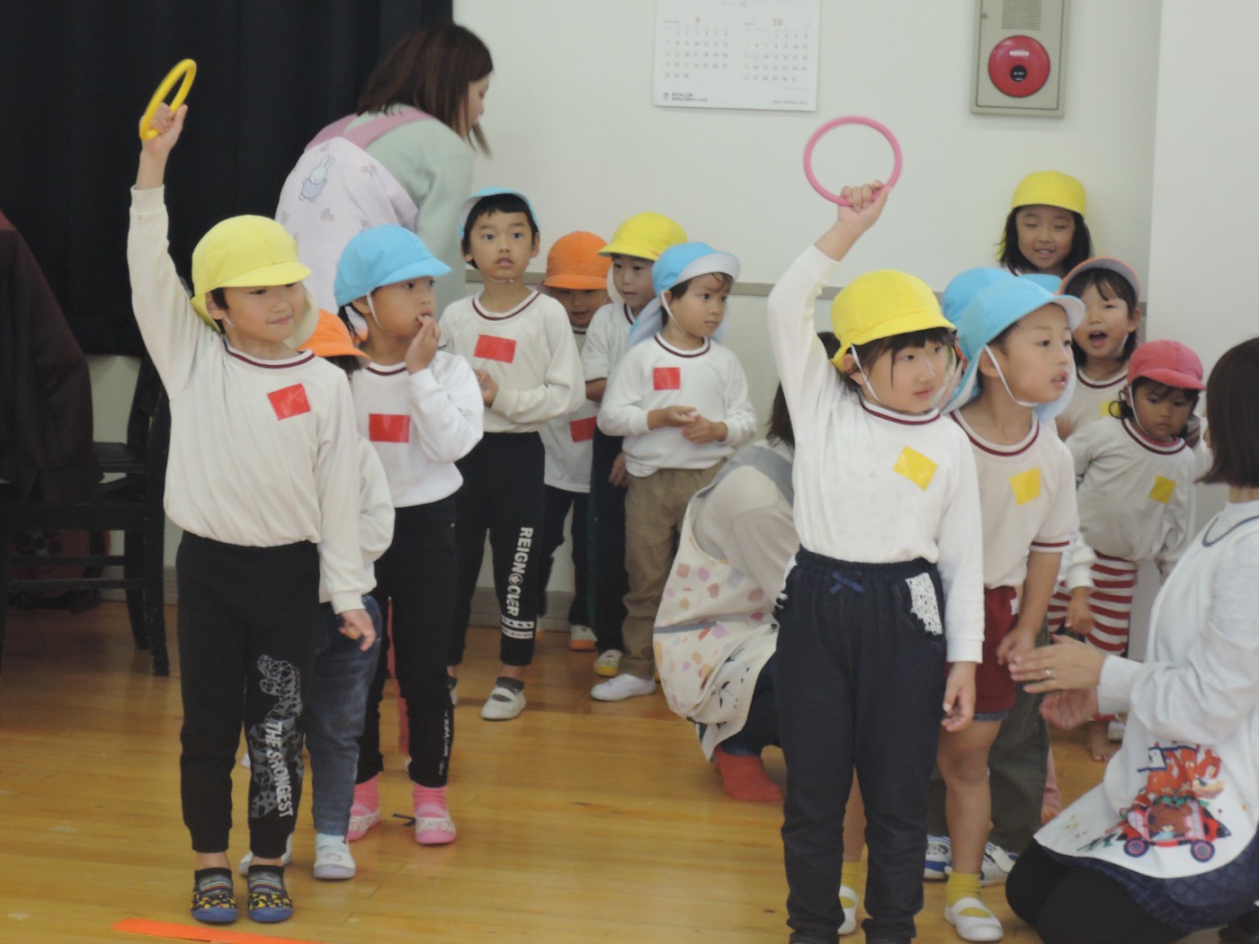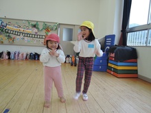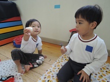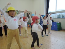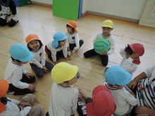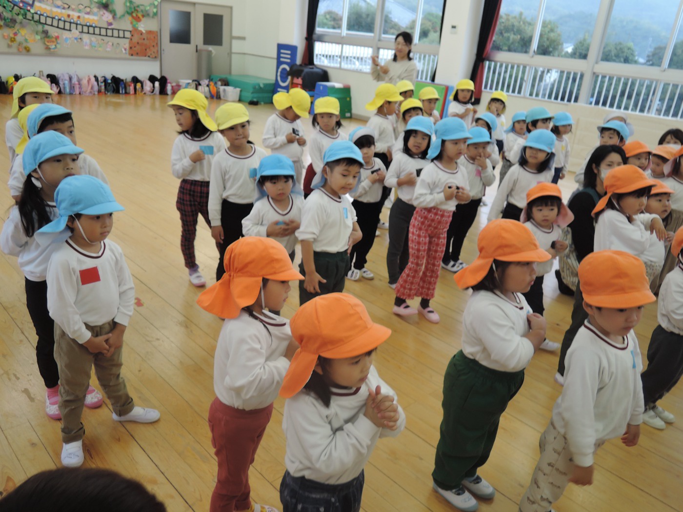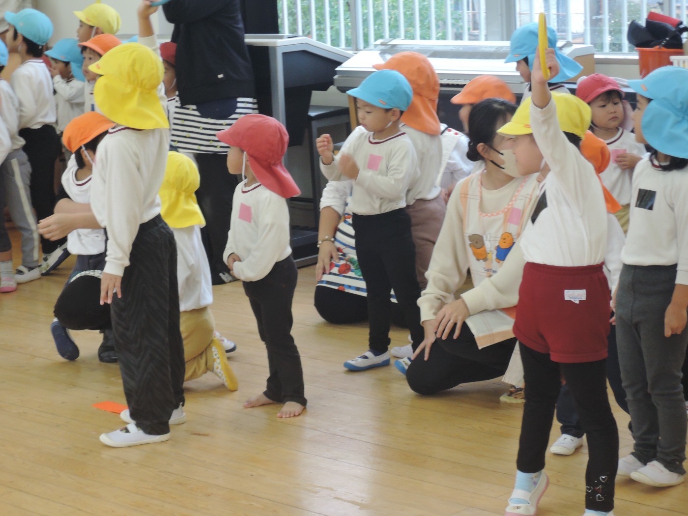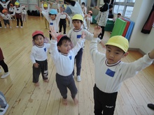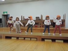大平山に遠足に行く日、すずらん組さんが大きな「てるてる坊主」を作っていたのに、雨が降ってしまいました。でも大丈夫。みんなでホールに集まって、お楽しみ会をすることになりました。年々少組から年長組のお友だち、胸にカラーテープを貼っています。同じ色のお友だちが仲間です。まず、年少組が運動会で踊った「スタート ソング」を全員で踊って身体を温めました。ステージのカンナさんのお手本を見ながら、ノリノリで踊りました。次は、お待ちかねのゲームです。同じ色の仲間が集まって輪になって、ボールリレーが始まりました。小さいお友だちはのんびりムードですが、年中・年長さんは、勝ちたくて猛スピード。ゲームで盛り上がった後は、「のりのり おむすびくん」を踊りました。運動会では、お家の人に「ギュー」してもらいましたが、今日はグループのお兄さん・お姉さんが「ギュー」してくれて嬉しかったですね。色別リレーは、先生達も本気で参戦。最後は「へんしん!にんじゃじゃん」を踊りました。さつき組全員ステージに上がり、忍者になりきり熱演。おなかぺこぺこで、お弁当はとびきり美味しかったことでしょう。お天気のいい日に、大平山に行きましょう。