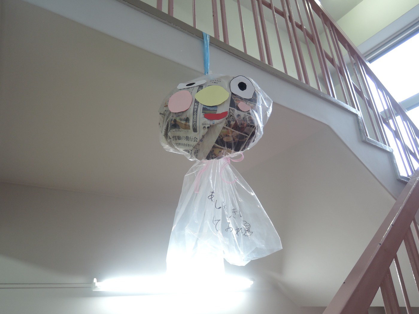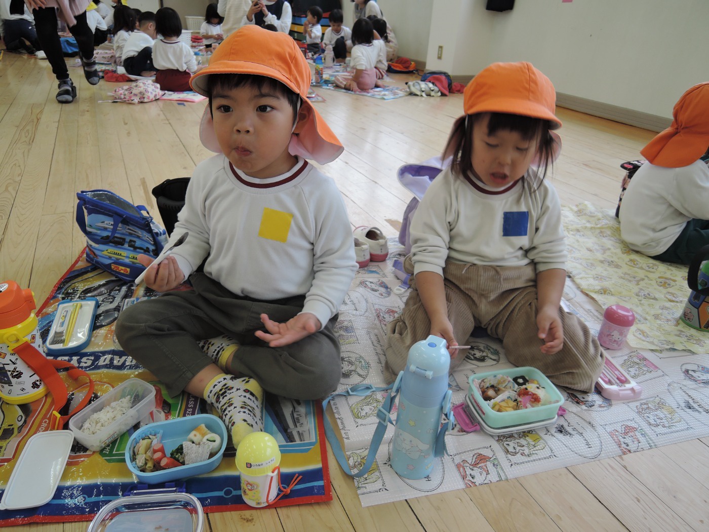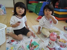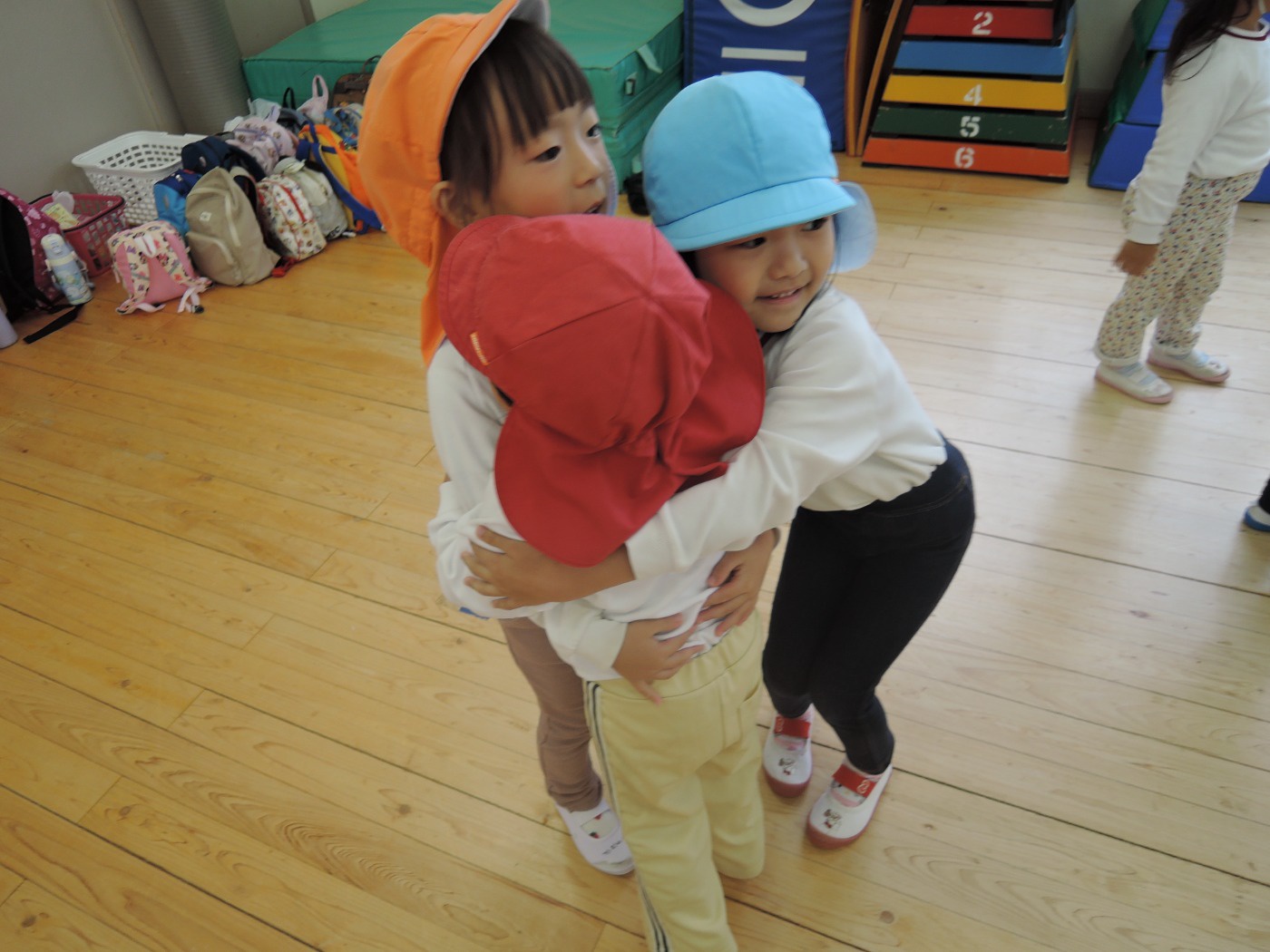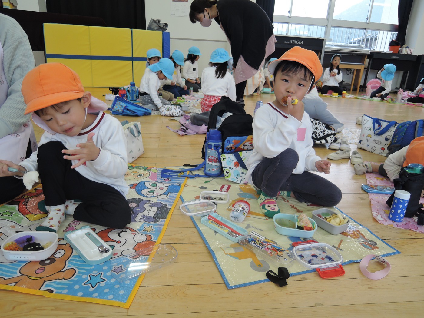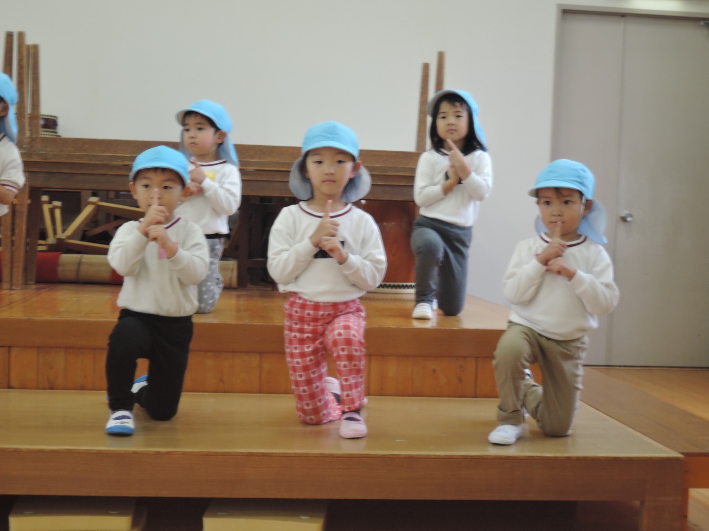 大平山に遠足に行く日、すずらん組さんが大きな「てるてる坊主」を作っていたのに、雨が降ってしまいました。でも大丈夫。みんなでホールに集まって、お楽しみ会をすることになりました。年々少組から年長組のお友だち、胸にカラーテープを貼っています。同じ色のお友だちが仲間です。まず、年少組が運動会で踊った「スタート ソング」を全員で踊って身体を温めました。ステージのカンナさんのお手本を見ながら、ノリノリで踊りました。次は、お待ちかねのゲームです。同じ色の仲間が集まって輪になって、ボールリレーが始まりました。小さいお友だちはのんびりムードですが、年中・年長さんは、勝ちたくて猛スピード。ゲームで盛り上がった後は、「のりのり おむすびくん」を踊りました。運動会では、お家の人に「ギュー」してもらいましたが、今日はグループのお兄さん・お姉さんが「ギュー」してくれて嬉しかったですね。色別リレーは、先生達も本気で参戦。最後は「へんしん!にんじゃじゃん」を踊りました。さつき組全員ステージに上がり、忍者になりきり熱演。おなかぺこぺこで、お弁当はとびきり美味しかったことでしょう。お天気のいい日に、大平山に行きましょう。