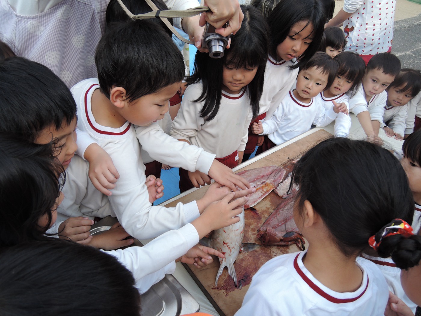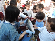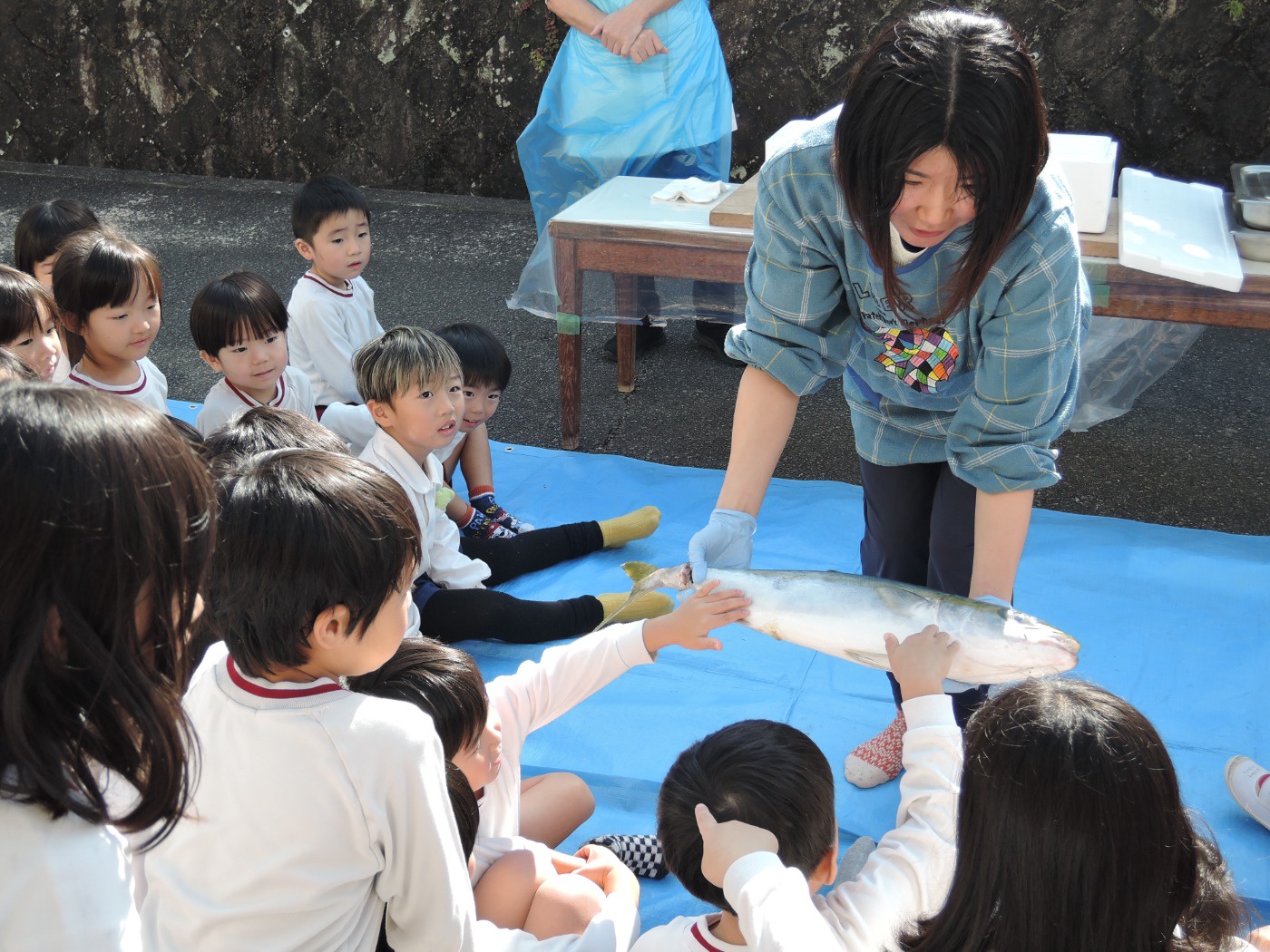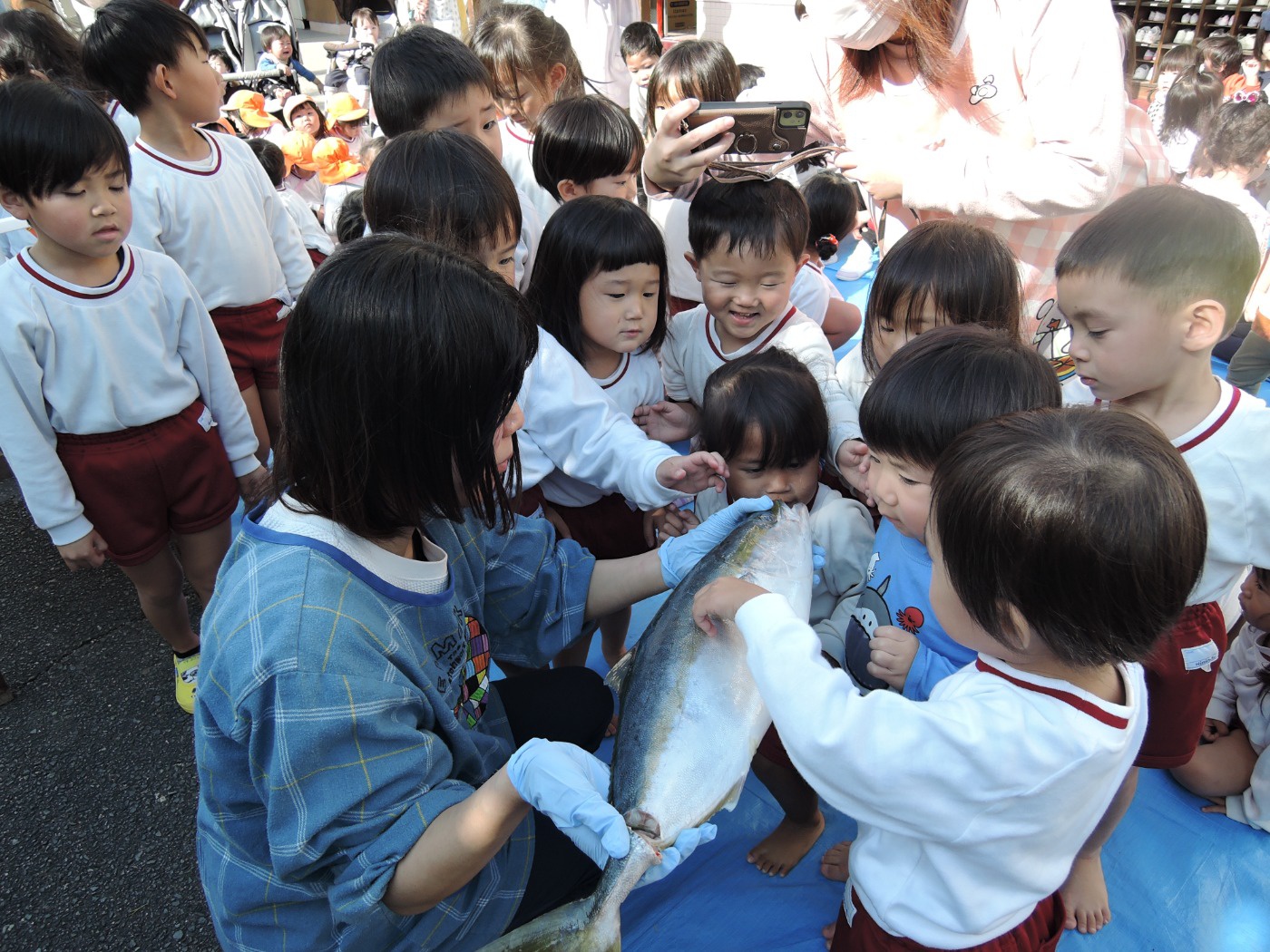 給食の先生が大きなハマチを持って来てくれました。こんなに大きなお魚を見たのは初めてのお友だちも多かったかも知れません。近くで見て触ってみると「ぬるぬるする」「ピカピカしてる」「色がきれい」たくさんのつぶやきが聞こえてきました。いよいよハマチの解体ショーが始まりました。頭を落として3枚におろす包丁さばきの見事なこと。海で泳いでいたお魚をどのようにして調理していくのか、目の前で見せてもらいました。お魚の命をいただくことに感謝して、いつも美味しい給食を作ってくださる先生方に感謝して、心を込めて「いただきます」のあいさつができるといいですね。