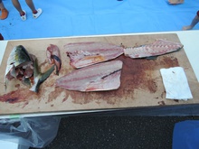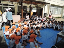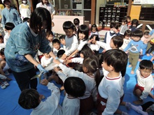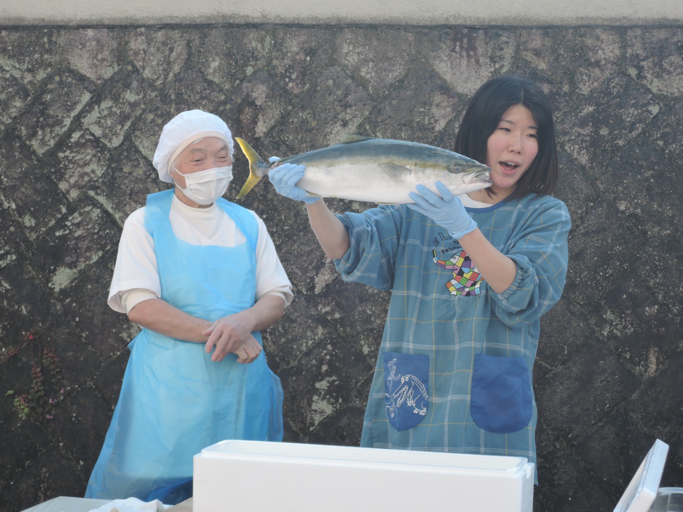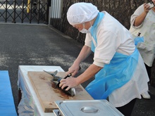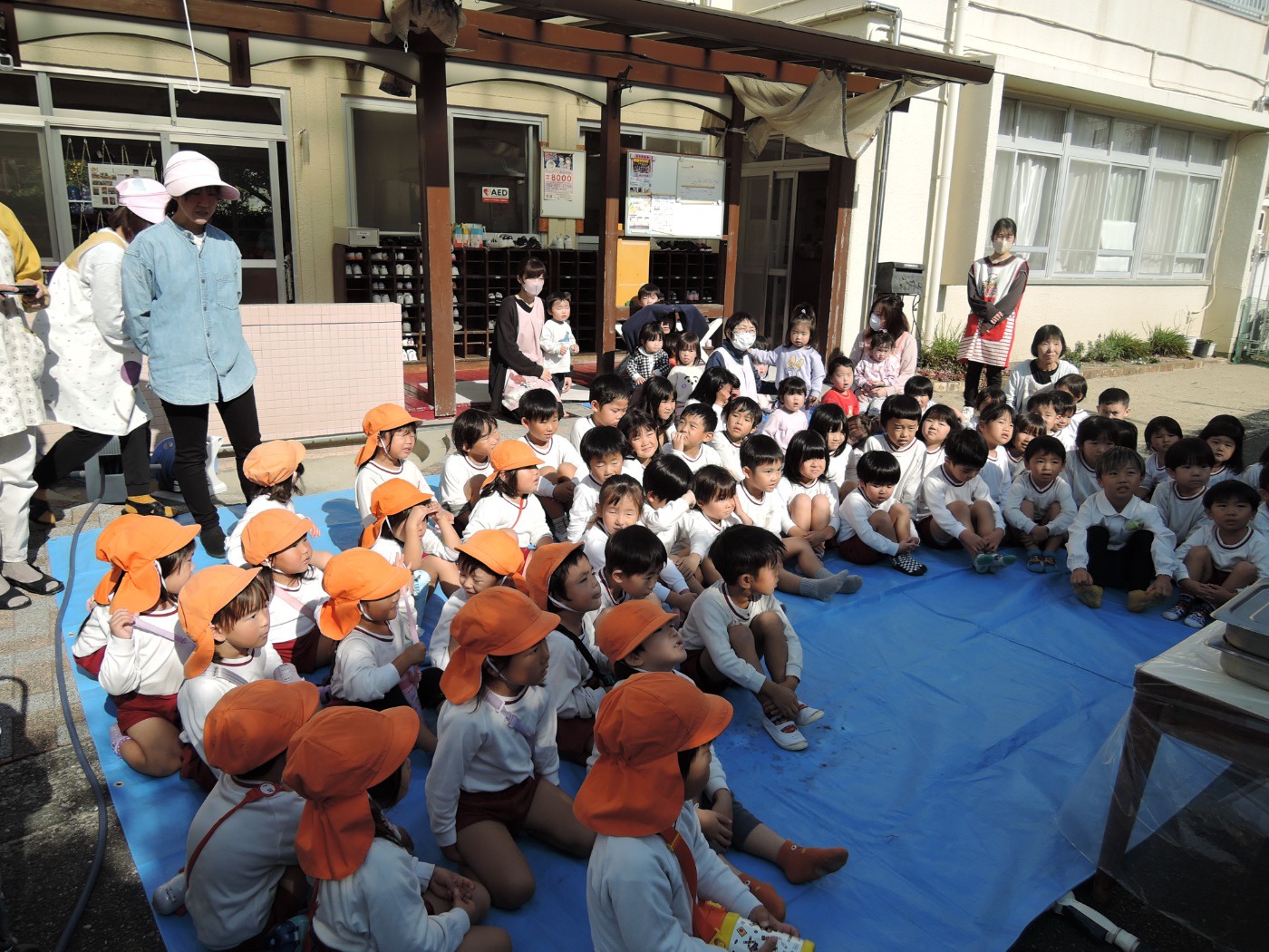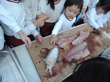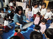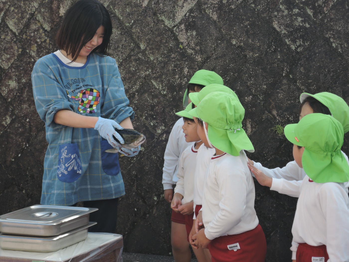 給食の先生が大きなハマチを持って来てくれました。こんなに大きなお魚を見たのは初めてのお友だちも多かったかも知れません。近くで見て触ってみると「ぬるぬるする」「ピカピカしてる」「色がきれい」たくさんのつぶやきが聞こえてきました。いよいよハマチの解体ショーが始まりました。頭を落として3枚におろす包丁さばきの見事なこと。海で泳いでいたお魚をどのようにして調理していくのか、目の前で見せてもらいました。お魚の命をいただくことに感謝して、いつも美味しい給食を作ってくださる先生方に感謝して、心を込めて「いただきます」のあいさつができるといいですね。
