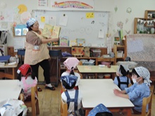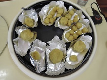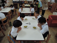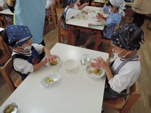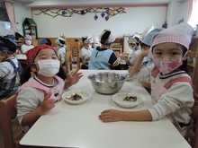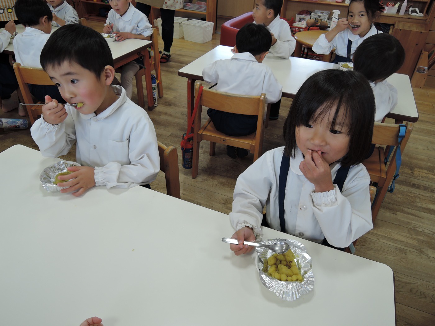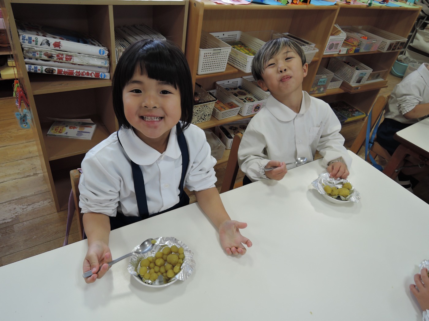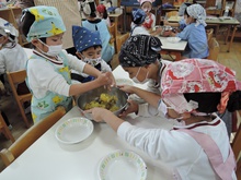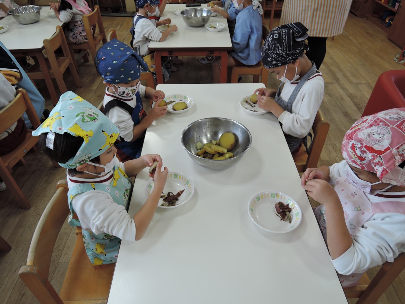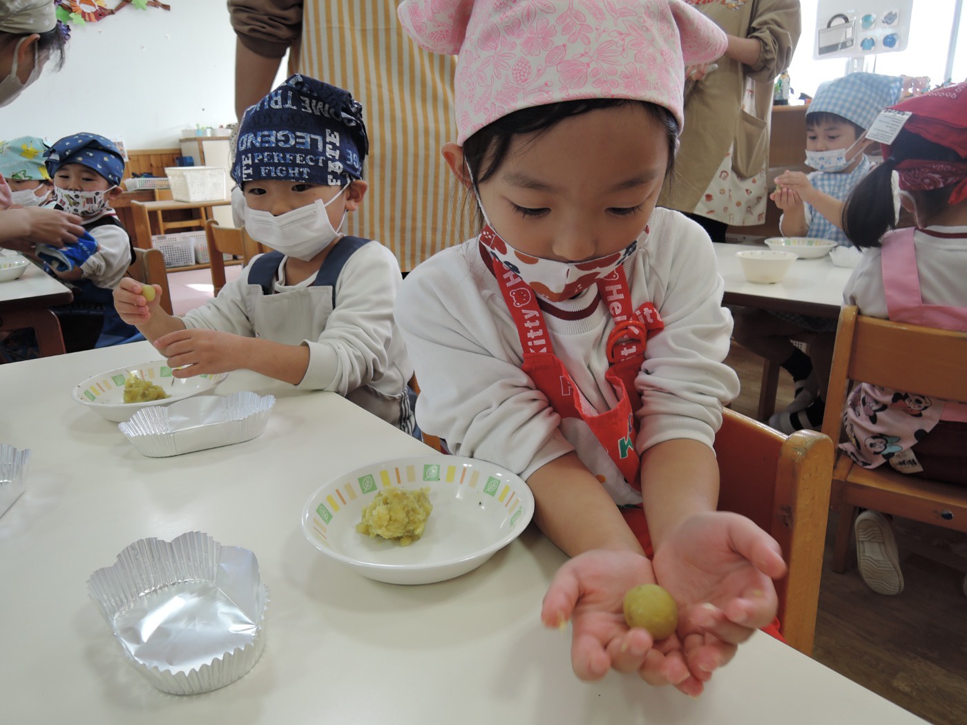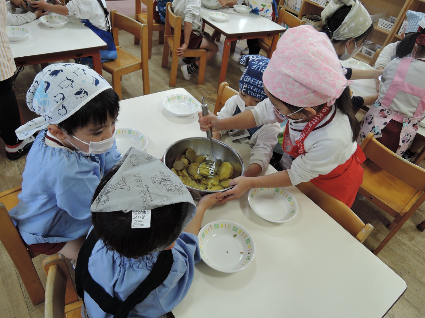 さつき組のお気に入りの本「すいっと ぽてっと」を先生に何度も読んでもらって、自分たちも「すいっと ぽてっと」が作りたくなりました。にこにこ畑で掘ったサツマイモを使って、クッキングが始まりました。もう一度先生に本を読んでもらって、作り方を確認します。まず、ふかしてあるサツマイモの皮を丁寧に取ります。次に、サツマイモをつぶします。どのグループもチームワークばっちり。バターと砂糖をいれてよく混ぜます。おいしそうな匂いがしてきました。自分の好きな大きさに丸めて、ホットプレートで焼けば出来上がり。手作りおやつに大満足のさつき組さん。お腹いっぱいで幸せですね。