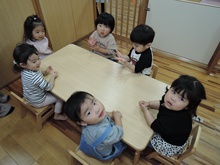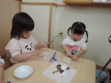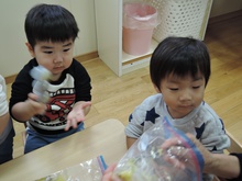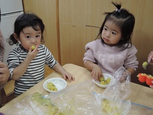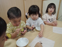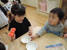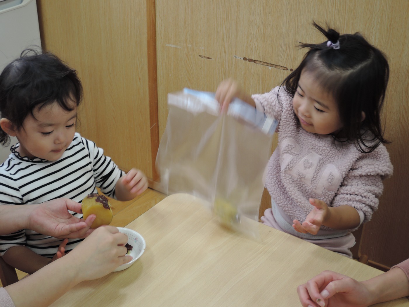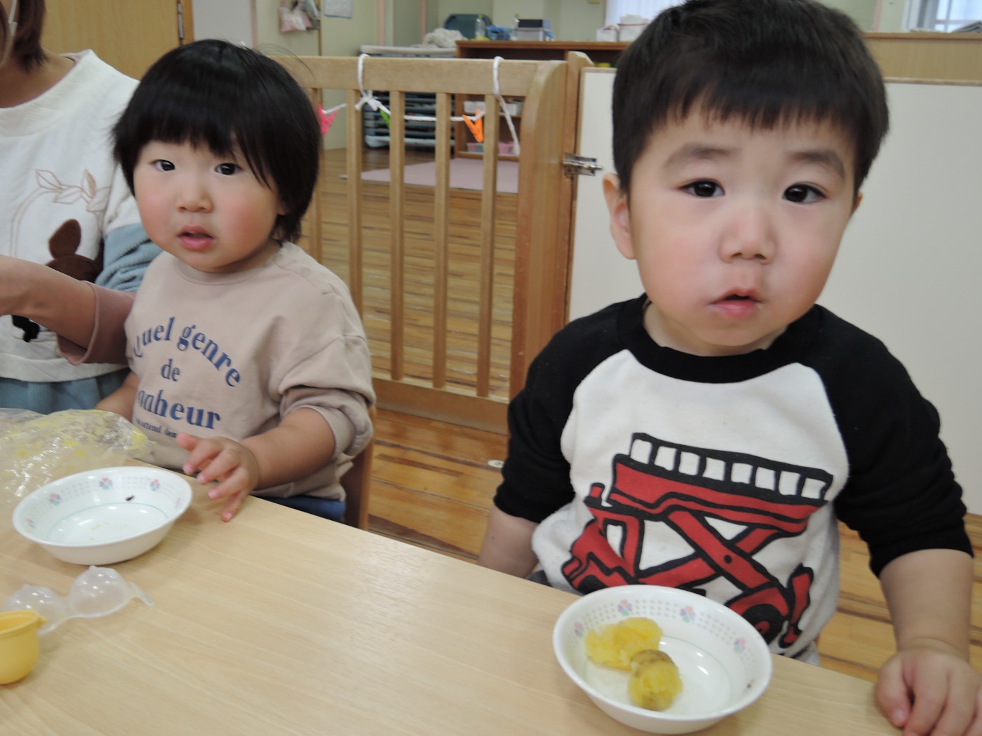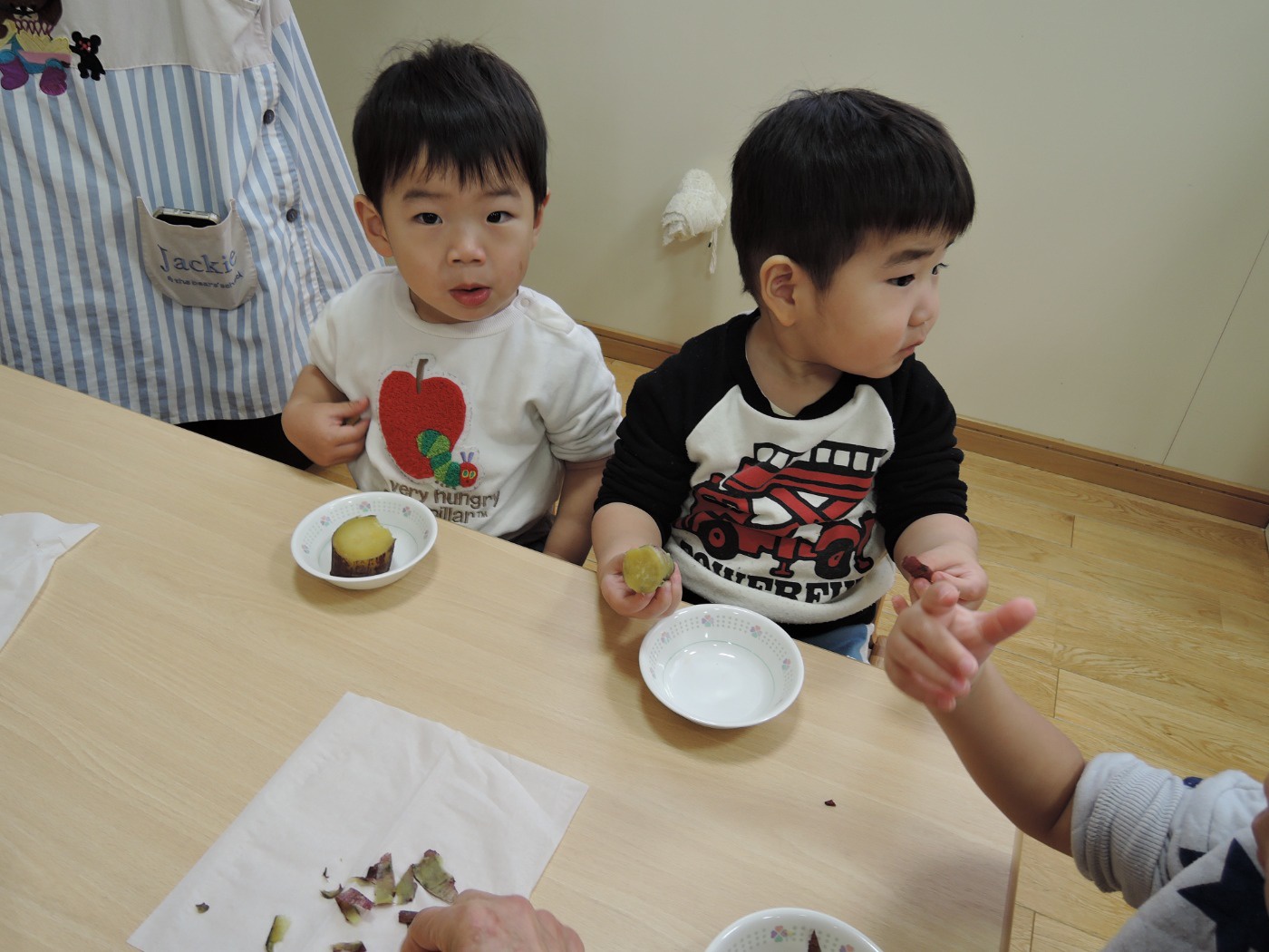 お部屋で手をしっかりと消毒したれんげ組さん。「何が始まるんだろう」ふかして輪切りにしたさつまいもを給食の先生が持って来てくれました。「皮が上手にむけるかな」先生のお話を聞いて早速、皮むきに挑戦。初めは、手に皮がつくのがいやな様子でしたが、だんだんコツをつかんで、スルッとむけるようになりました。きれいにむけると、待ちきれずにお口の中にパクリ。「まだだよー」 次は、袋の中でおいもをつぶします。ぺったんこになると、かわいい容器のなかにおいもを入れてもらって、ふりふりふり。まん丸のスウィートポテトが3つ出来上がり。仕上げにごまをかけて完成です。美味しいお顔のれんげ組さん。また、クッキングがしたいですね。