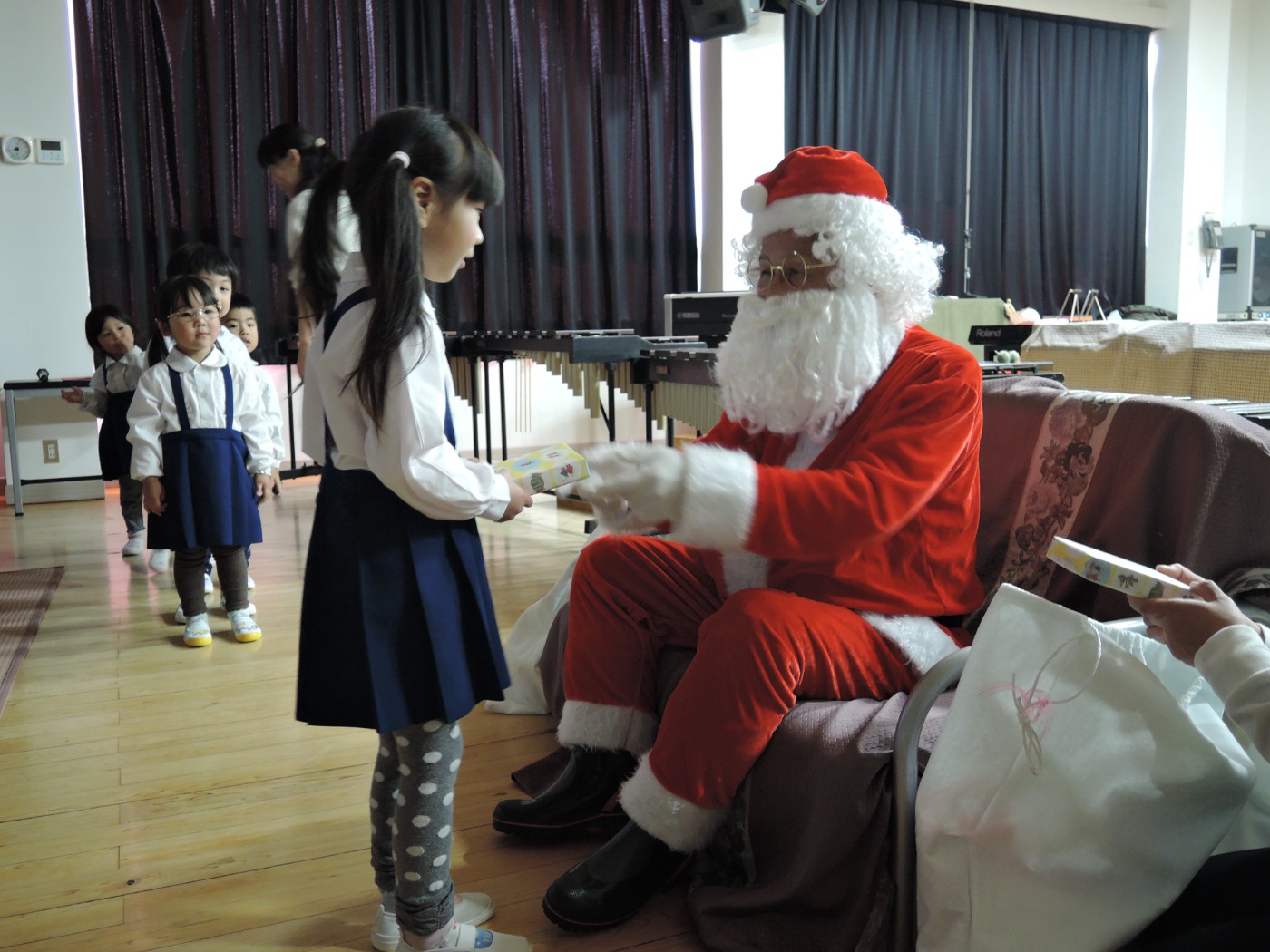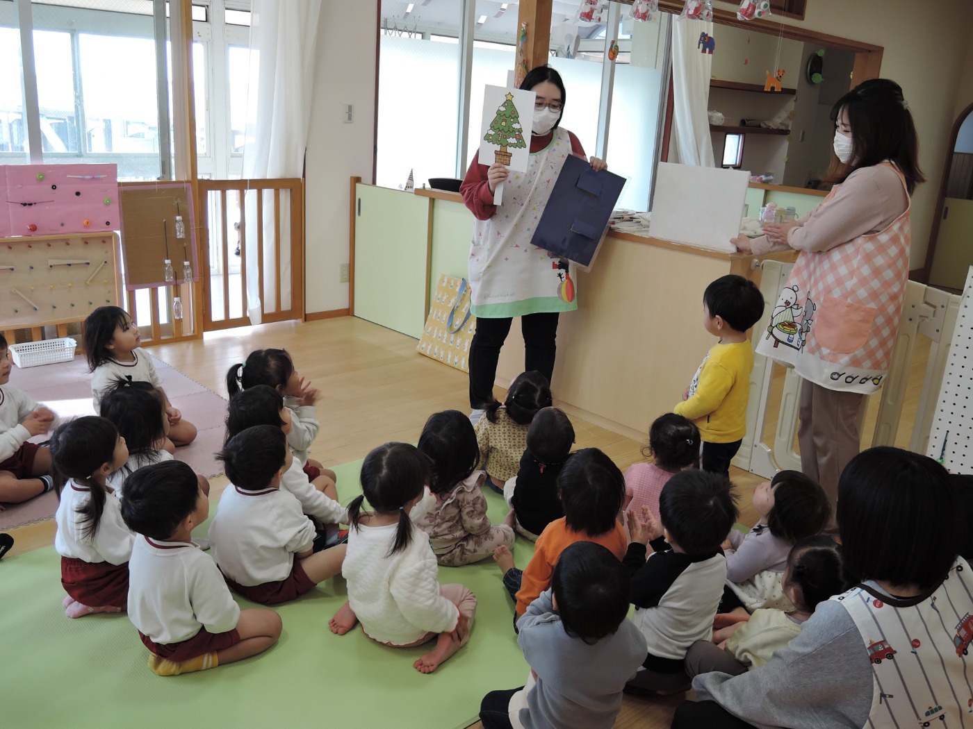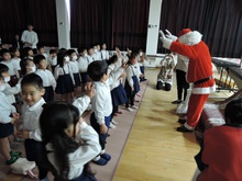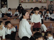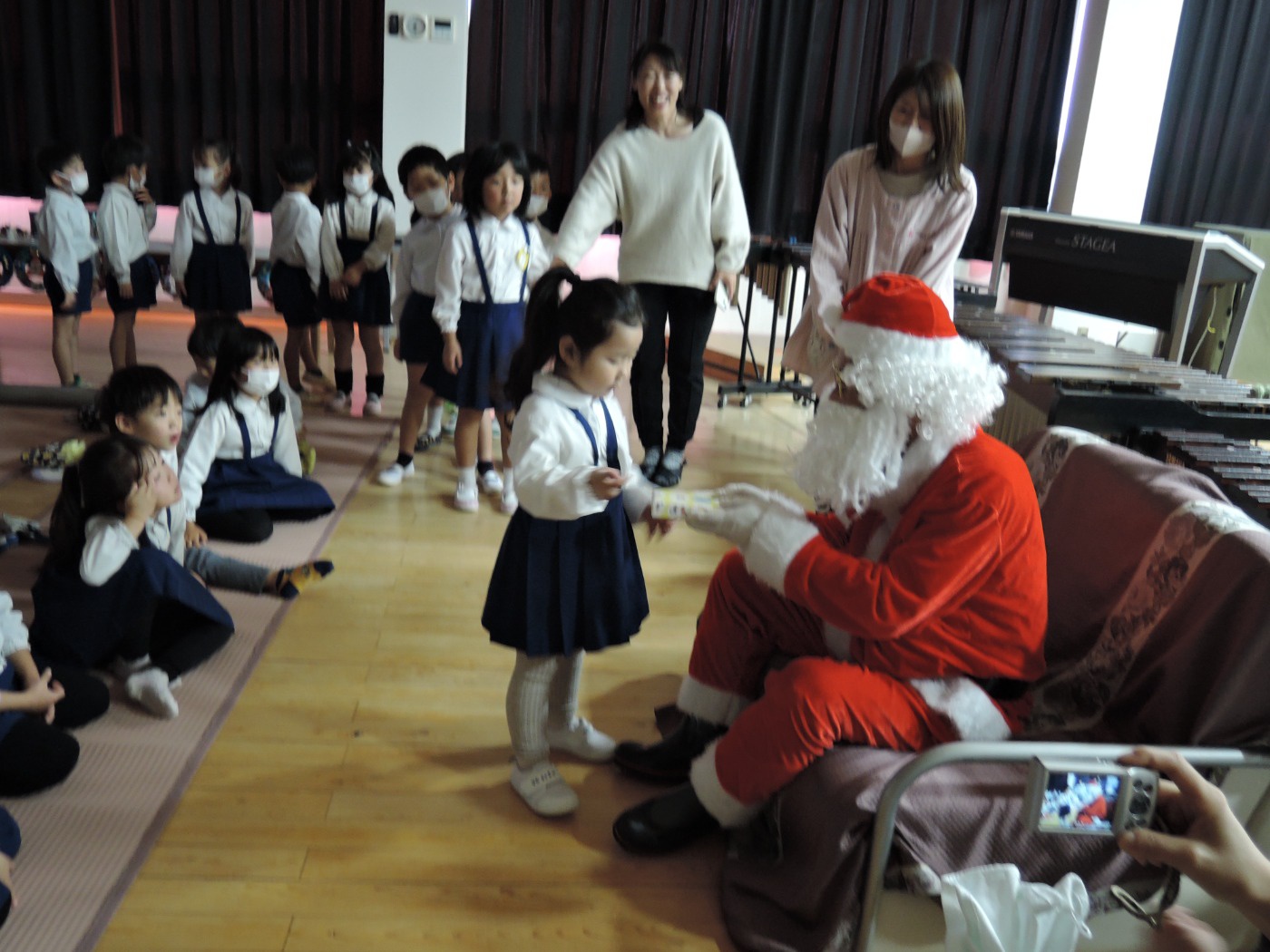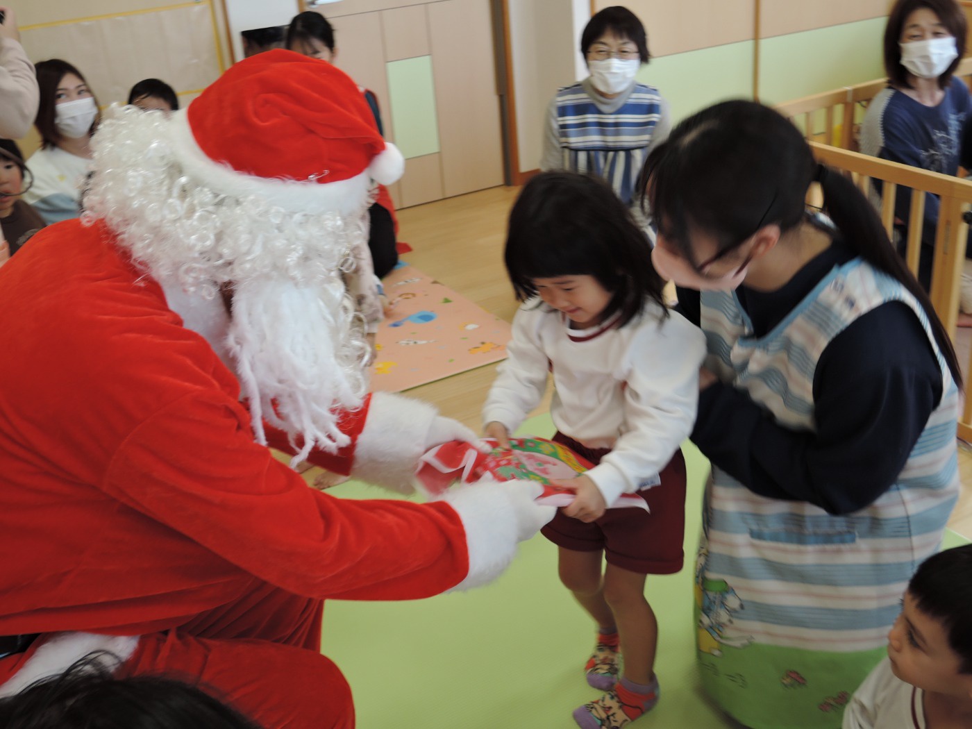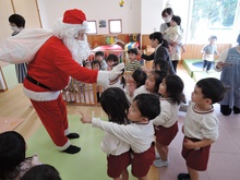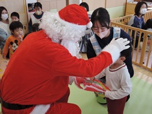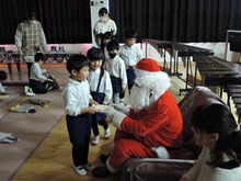 サンタさんからのお手紙が届いた次の日、小さいお友だちと大きいお友だちに分かれて、クリスマス会をしました。小さいお友だちがひよこ組のお部屋に集まって、クリスマスの絵本を読んでもらったりクイズを楽しんだりしていると、プレゼントを持ったサンタさんが登場。びっくりして泣き出したり、お口がポカンと空いたり、大喜びしたりして、いろいろな顔が入り混じっていました。ホールでは大きいお友だちが集まって、うそほんとゲームで大盛り上がり。先生からのトーンチャイムの音楽のプレゼントはとても美しかったです。クリスマスの歌を元気よく歌っていると、遠くから鈴の音。約束通り、サンタさんがプレゼントを持って来てくれました。「どうして赤い服を着ているの?」「いつもメガネをかけているのはなぜ?」子どもたちの質問にも丁寧に答えてくれたサンタさん。来年もまた来てくださいね。ホールに飾られたクリスマスのリースやお人形、とっても素敵です。お家に持って帰って飾ってくださいね。
