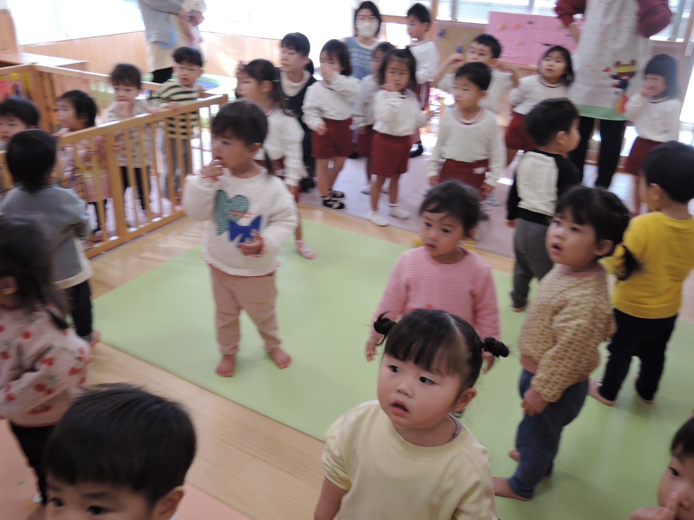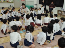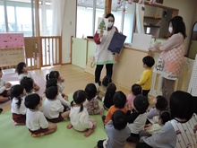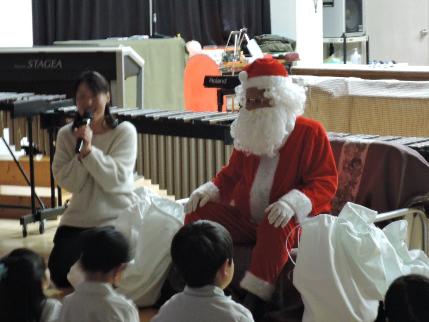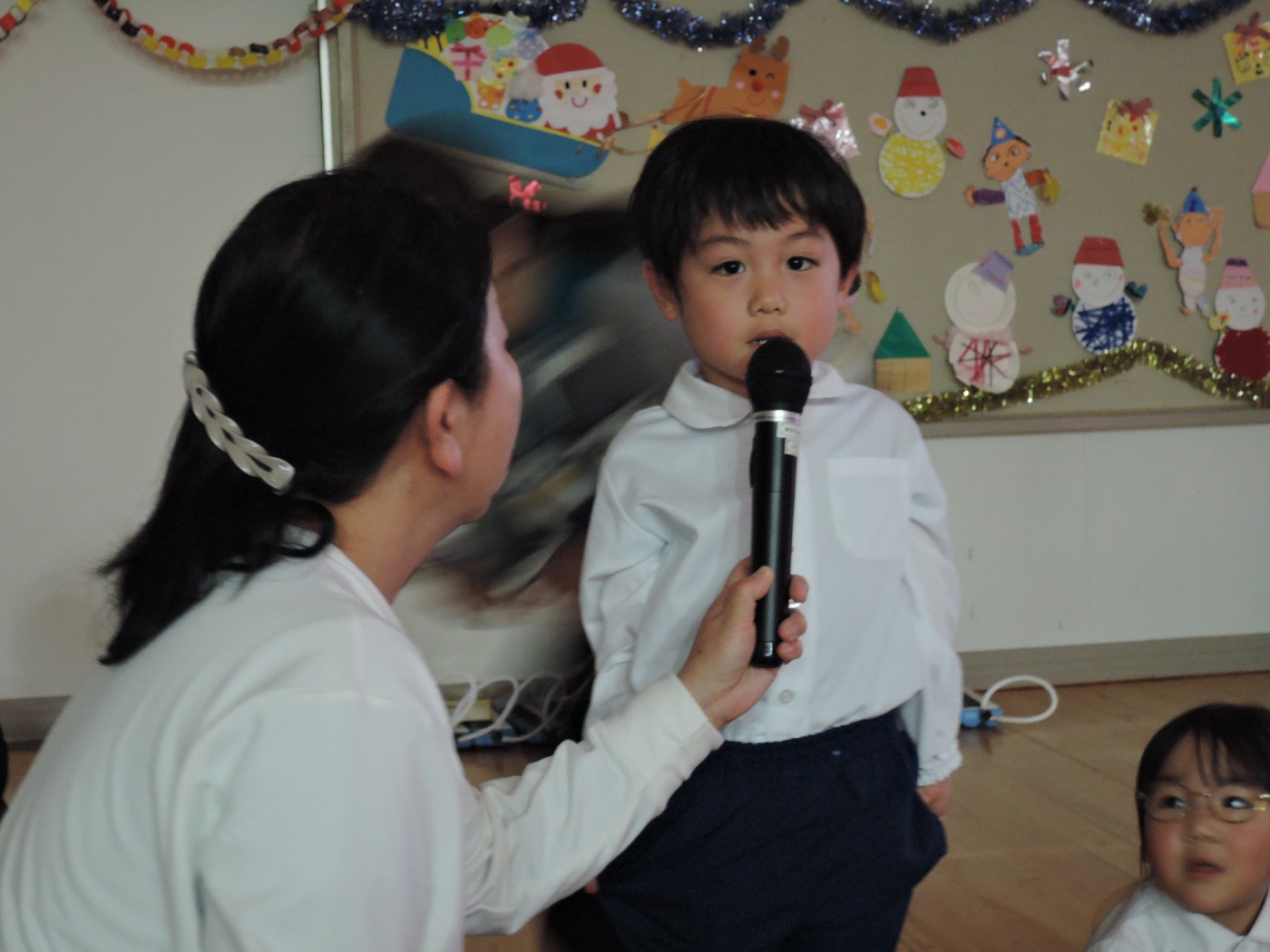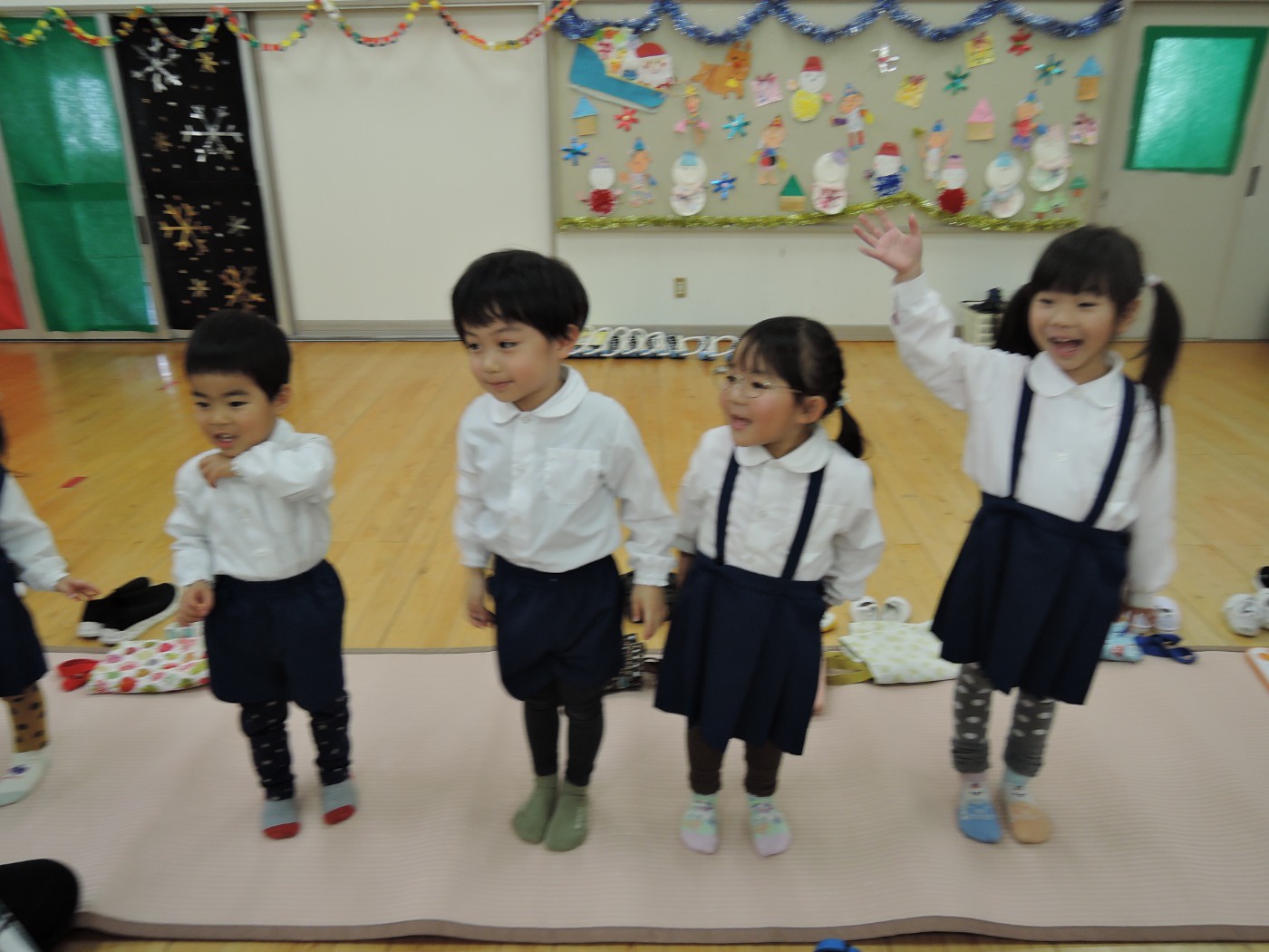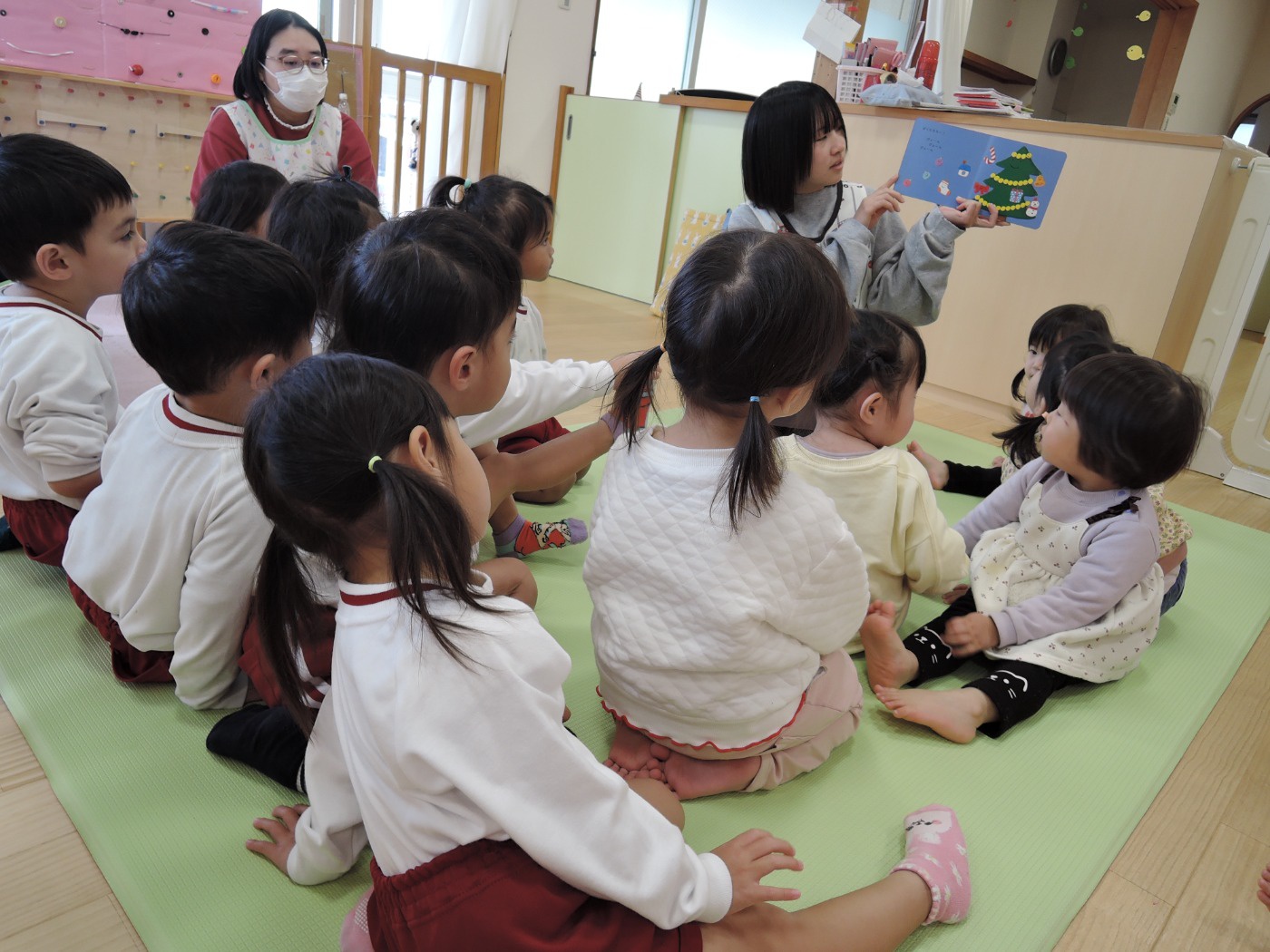 サンタさんからのお手紙が届いた次の日、小さいお友だちと大きいお友だちに分かれて、クリスマス会をしました。小さいお友だちがひよこ組のお部屋に集まって、クリスマスの絵本を読んでもらったりクイズを楽しんだりしていると、プレゼントを持ったサンタさんが登場。びっくりして泣き出したり、お口がポカンと空いたり、大喜びしたりして、いろいろな顔が入り混じっていました。ホールでは大きいお友だちが集まって、うそほんとゲームで大盛り上がり。先生からのトーンチャイムの音楽のプレゼントはとても美しかったです。クリスマスの歌を元気よく歌っていると、遠くから鈴の音。約束通り、サンタさんがプレゼントを持って来てくれました。「どうして赤い服を着ているの?」「いつもメガネをかけているのはなぜ?」子どもたちの質問にも丁寧に答えてくれたサンタさん。来年もまた来てくださいね。ホールに飾られたクリスマスのリースやお人形、とっても素敵です。お家に持って帰って飾ってくださいね。