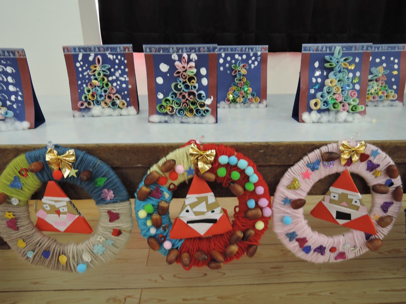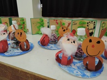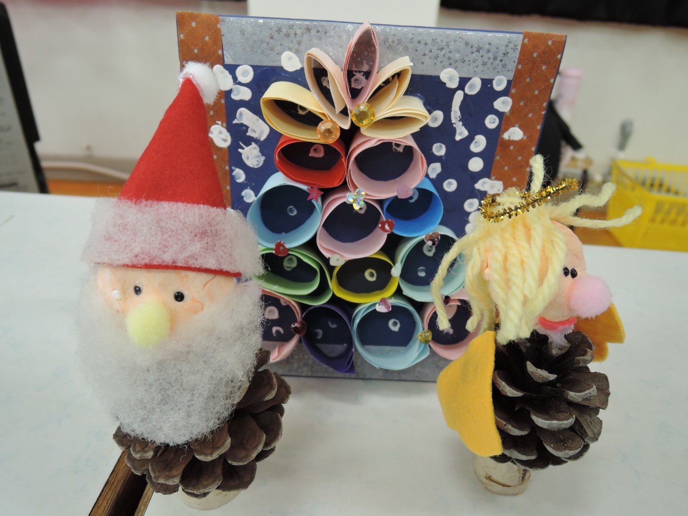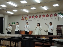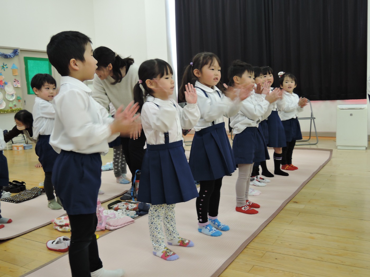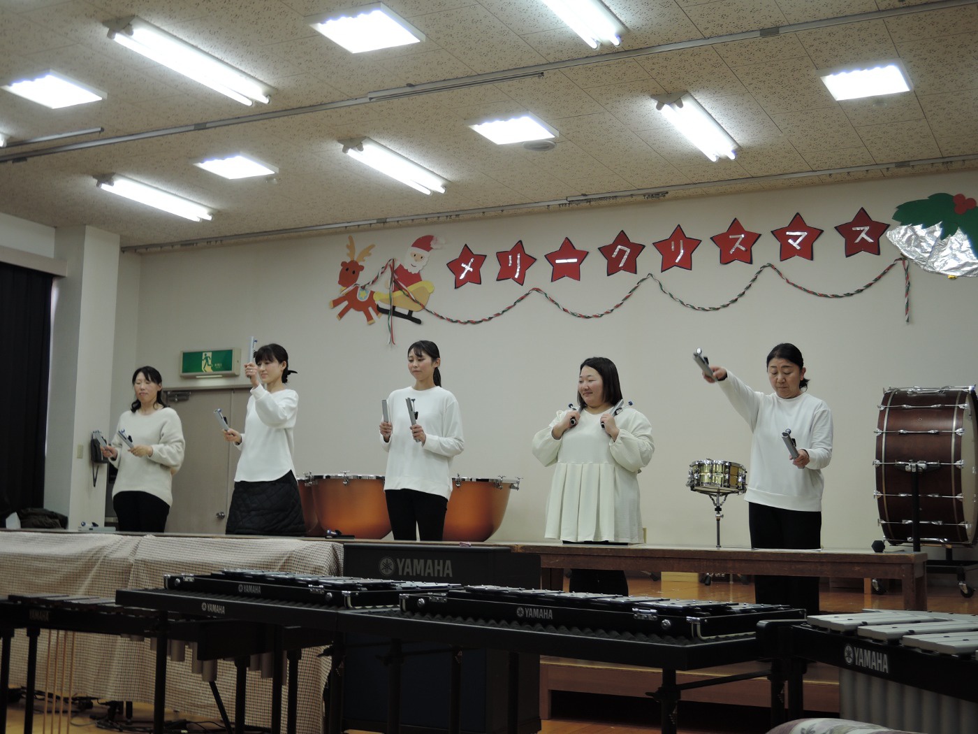 サンタさんからのお手紙が届いた次の日、小さいお友だちと大きいお友だちに分かれて、クリスマス会をしました。小さいお友だちがひよこ組のお部屋に集まって、クリスマスの絵本を読んでもらったりクイズを楽しんだりしていると、プレゼントを持ったサンタさんが登場。びっくりして泣き出したり、お口がポカンと空いたり、大喜びしたりして、いろいろな顔が入り混じっていました。ホールでは大きいお友だちが集まって、うそほんとゲームで大盛り上がり。先生からのトーンチャイムの音楽のプレゼントはとても美しかったです。クリスマスの歌を元気よく歌っていると、遠くから鈴の音。約束通り、サンタさんがプレゼントを持って来てくれました。「どうして赤い服を着ているの?」「いつもメガネをかけているのはなぜ?」子どもたちの質問にも丁寧に答えてくれたサンタさん。来年もまた来てくださいね。ホールに飾られたクリスマスのリースやお人形、とっても素敵です。お家に持って帰って飾ってくださいね。