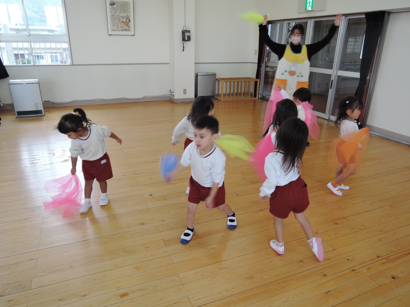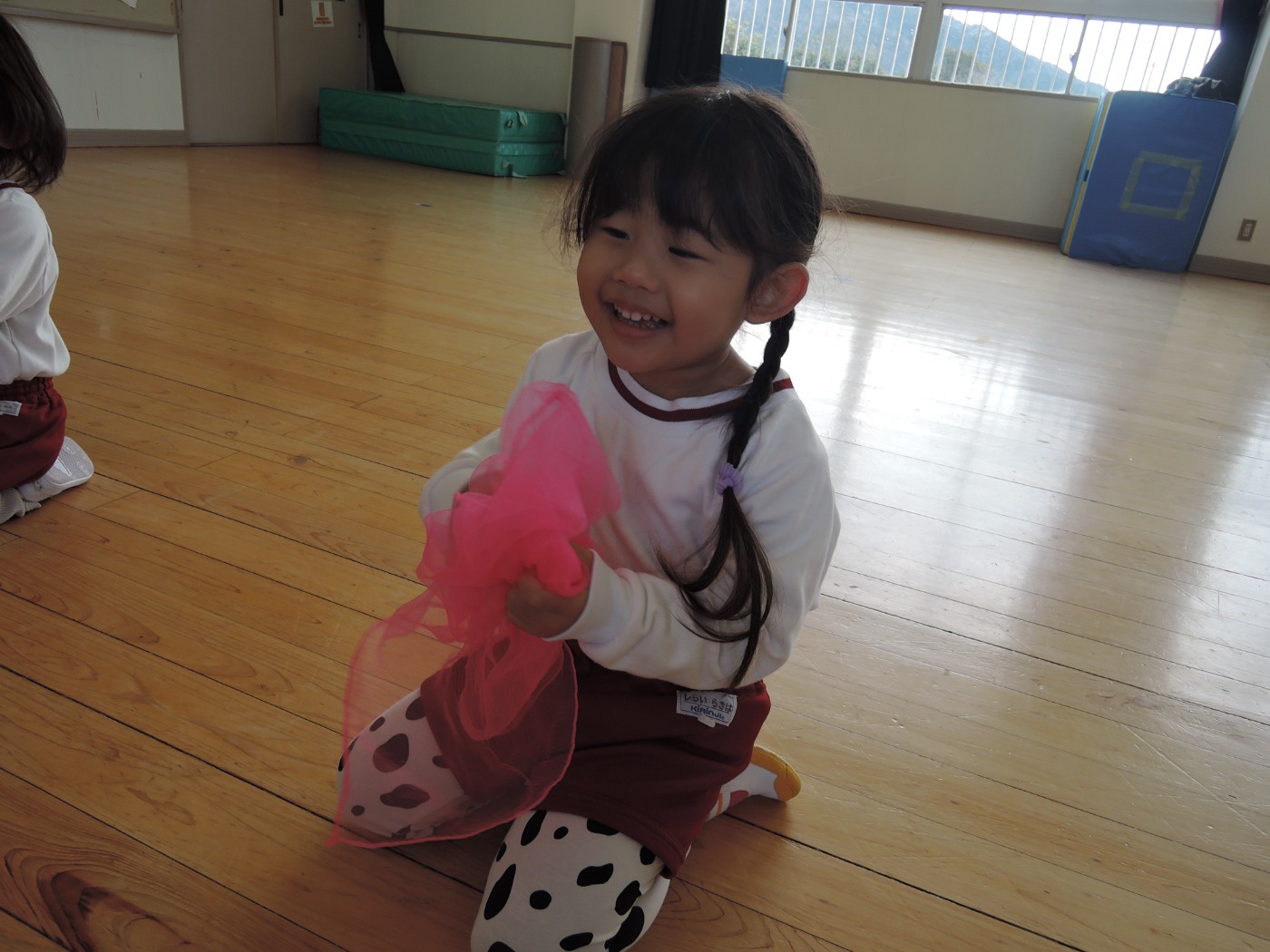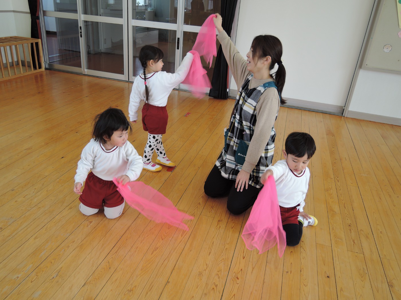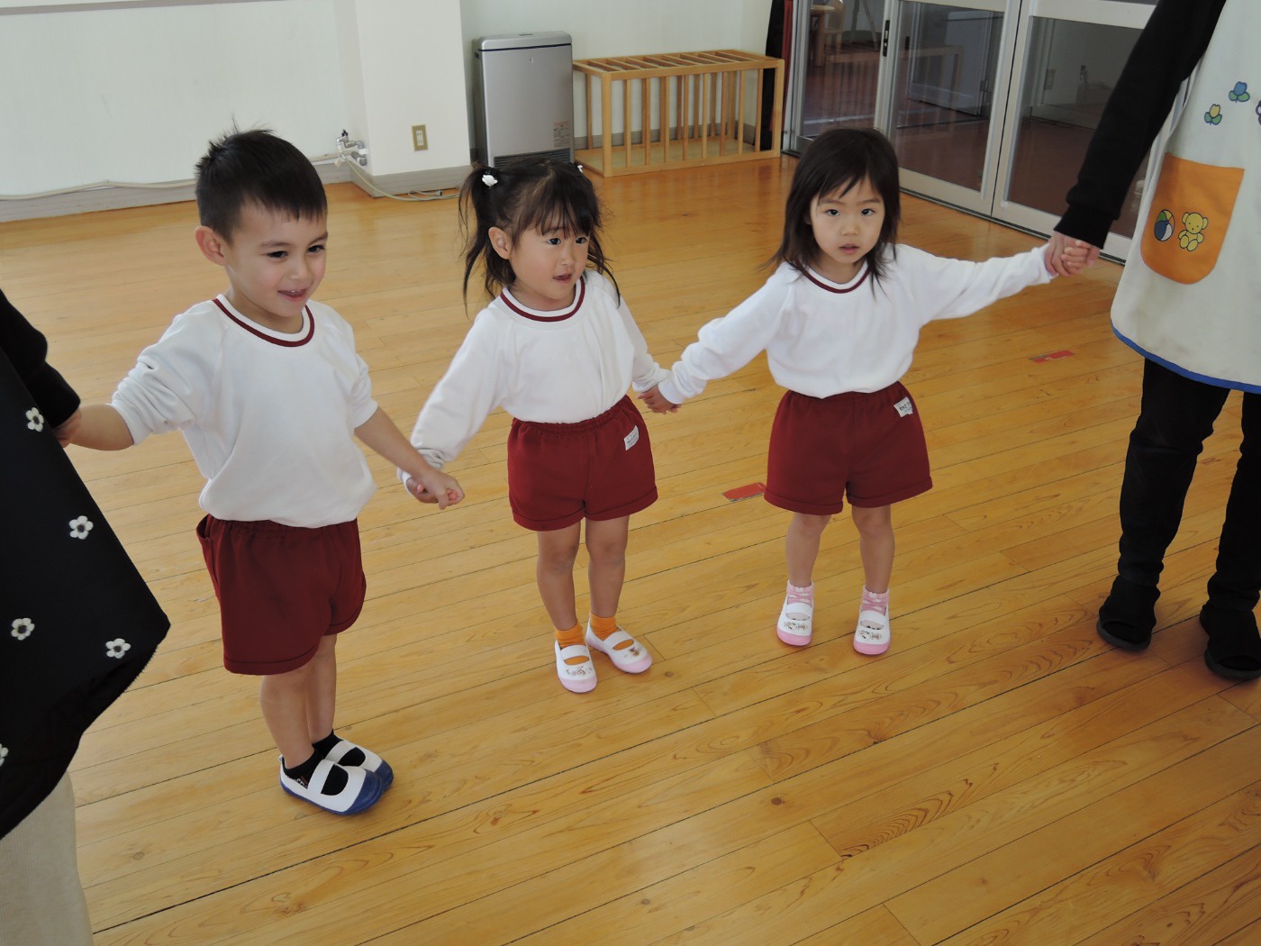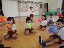 コスモス組、小さいアイリス組のリトミック教室がありました。先生の弾く音楽に合わせて、身体をゆらゆらしたり、止まったり、自由に動き回ったりして気持ちよさそうです。先生がかごを持ってきました。きれいな色のスカーフがたくさん入っています。「ピンク色がいいです」「ありがとうございました」しっかりとお話ができて感心です。自分の好きな色のスカーフをひらひらさせて、チョウチョに変身。お花も咲かせることができました。最後は輪になって、音楽に合わせてボール送りをしました。リトミックは音楽に合わせて体を動かすことで、基本的な音楽能力だけでなく、身体的、感覚的、知的な潜在能力の発達を促し,心身の調和を目指す教育です。毎日の朝の会でも、リトミックを取り入れた活動を行っています。