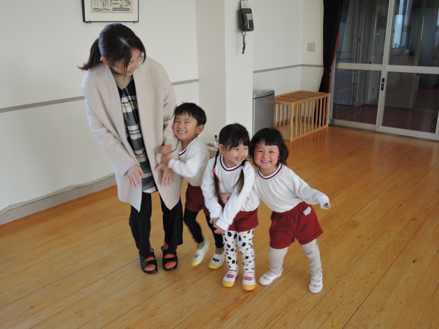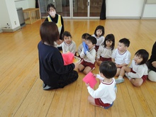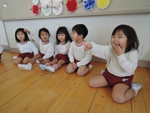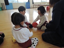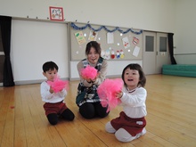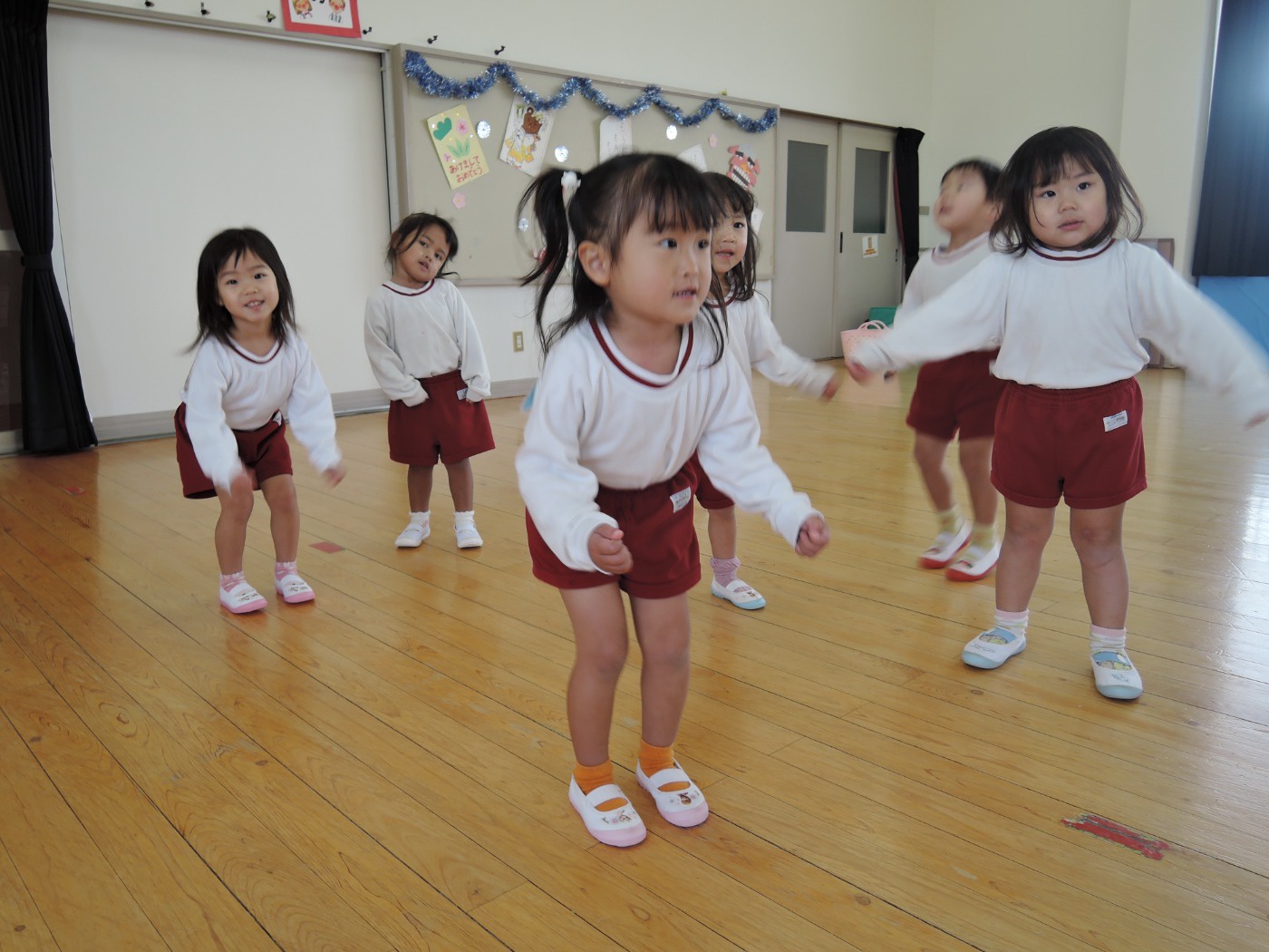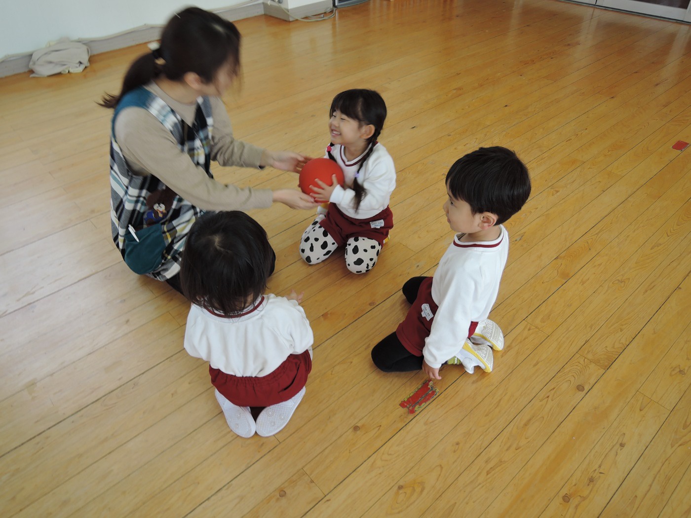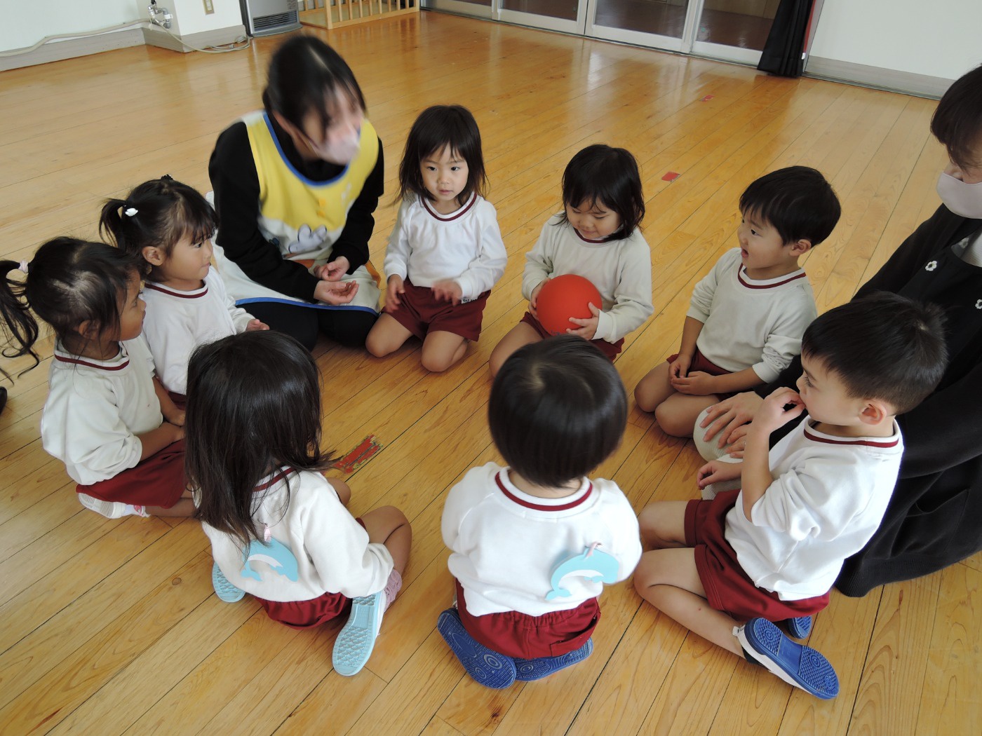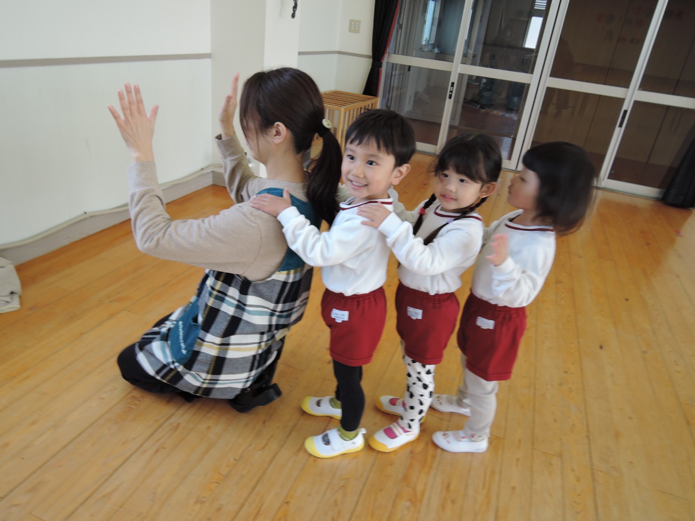 コスモス組、小さいアイリス組のリトミック教室がありました。先生の弾く音楽に合わせて、身体をゆらゆらしたり、止まったり、自由に動き回ったりして気持ちよさそうです。先生がかごを持ってきました。きれいな色のスカーフがたくさん入っています。「ピンク色がいいです」「ありがとうございました」しっかりとお話ができて感心です。自分の好きな色のスカーフをひらひらさせて、チョウチョに変身。お花も咲かせることができました。最後は輪になって、音楽に合わせてボール送りをしました。リトミックは音楽に合わせて体を動かすことで、基本的な音楽能力だけでなく、身体的、感覚的、知的な潜在能力の発達を促し,心身の調和を目指す教育です。毎日の朝の会でも、リトミックを取り入れた活動を行っています。