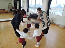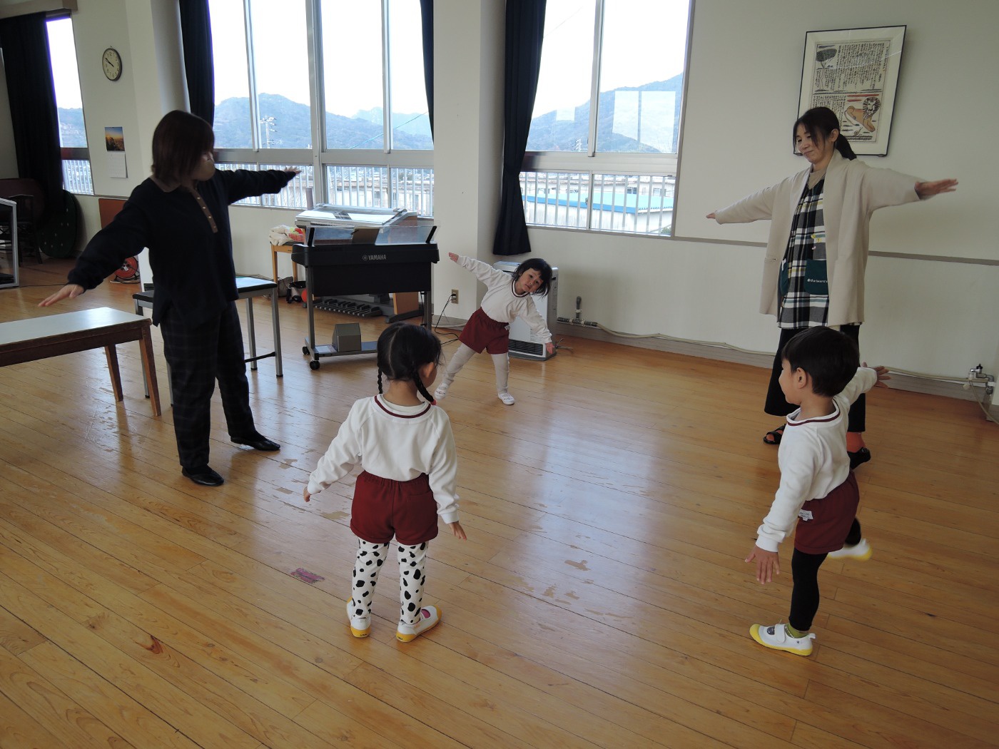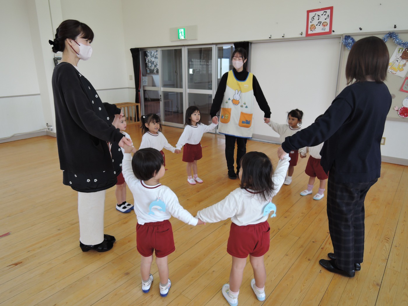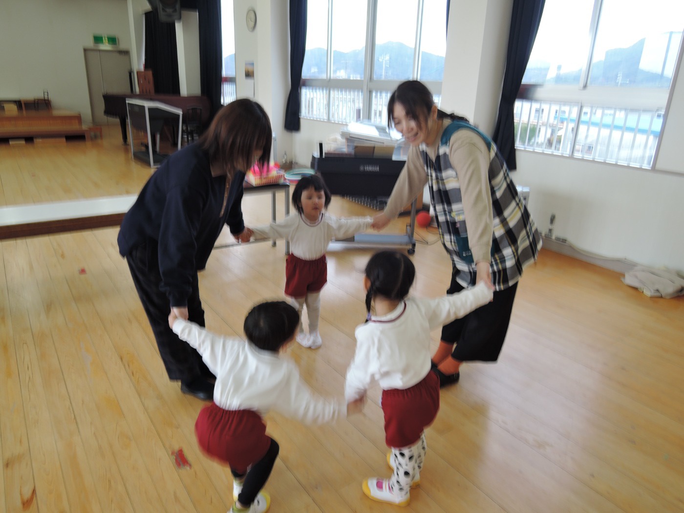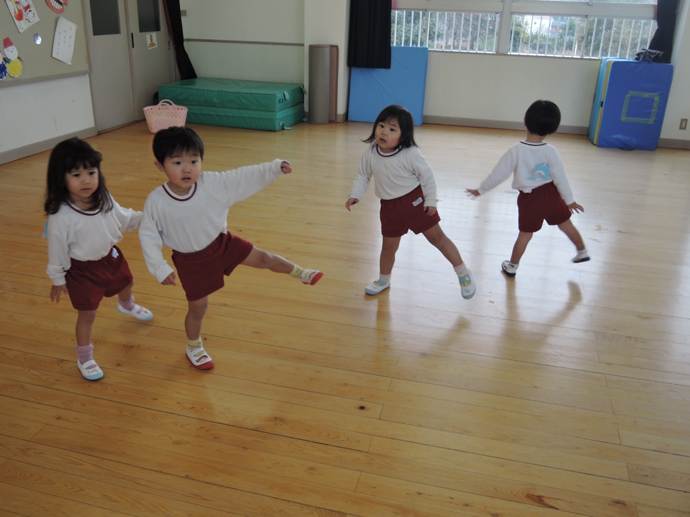 コスモス組、小さいアイリス組のリトミック教室がありました。先生の弾く音楽に合わせて、身体をゆらゆらしたり、止まったり、自由に動き回ったりして気持ちよさそうです。先生がかごを持ってきました。きれいな色のスカーフがたくさん入っています。「ピンク色がいいです」「ありがとうございました」しっかりとお話ができて感心です。自分の好きな色のスカーフをひらひらさせて、チョウチョに変身。お花も咲かせることができました。最後は輪になって、音楽に合わせてボール送りをしました。リトミックは音楽に合わせて体を動かすことで、基本的な音楽能力だけでなく、身体的、感覚的、知的な潜在能力の発達を促し,心身の調和を目指す教育です。毎日の朝の会でも、リトミックを取り入れた活動を行っています。