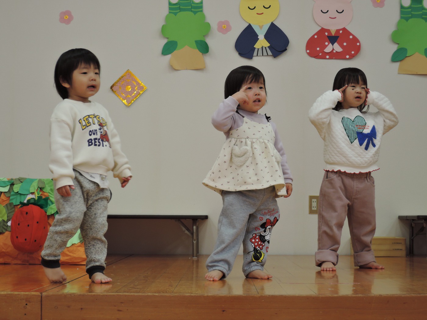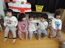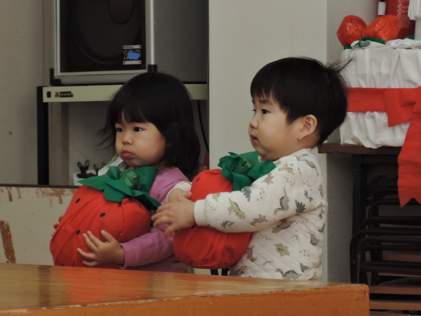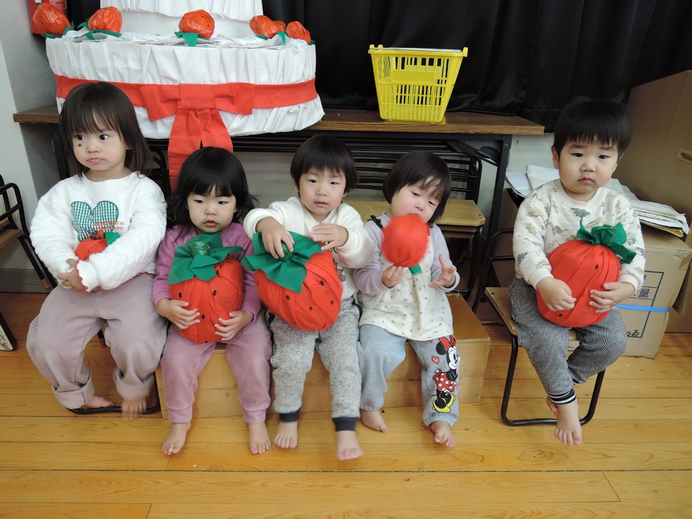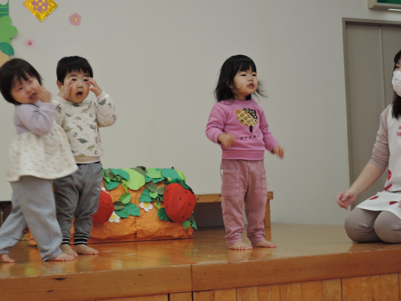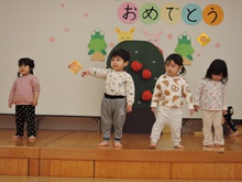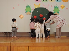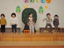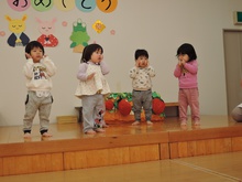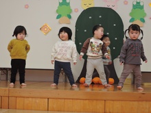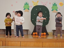 生活発表会に向けて毎日練習に励んでいる東園のお友だち。れんげ組さんがホールで練習をしました。だるまさんに変身してステージに登場!にらめっこの顔がとってもかわいいれんげ組さん。大きな果物を見つけて持って帰りました。何に使うのかな? 楽しいパーティーになるといいですね。とっても寒い日が続いています。風邪をひかないように気をつけて、練習を頑張ってくださいね。