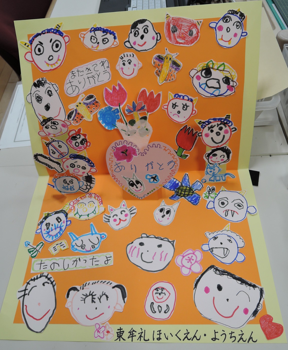 2月3日に牟礼小4年生のみなさんが豆まき集会に来てくださいました。とても楽しい一日を一緒に過ごすことができて、お礼のカードを作りました。年中さんが絵を、年長さんがメッセージを書いてくれました。これからも小学校との交流が広がっていくといいなと思います。よろしくお願いします。