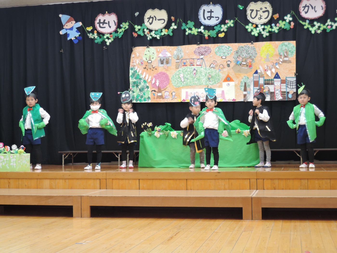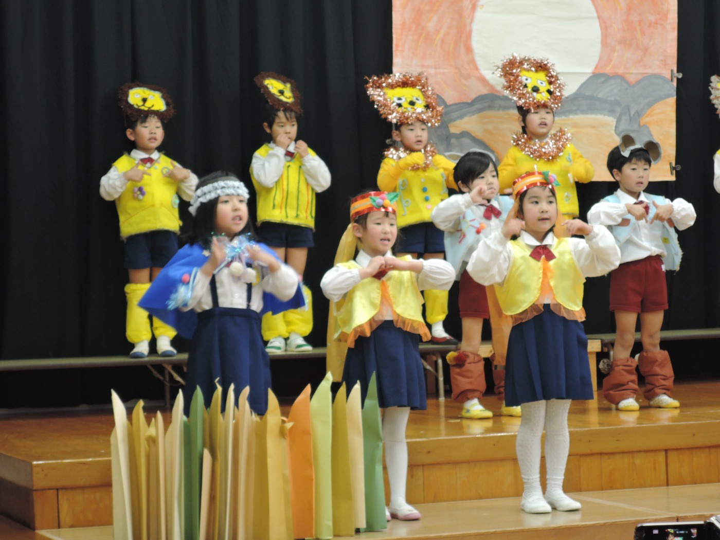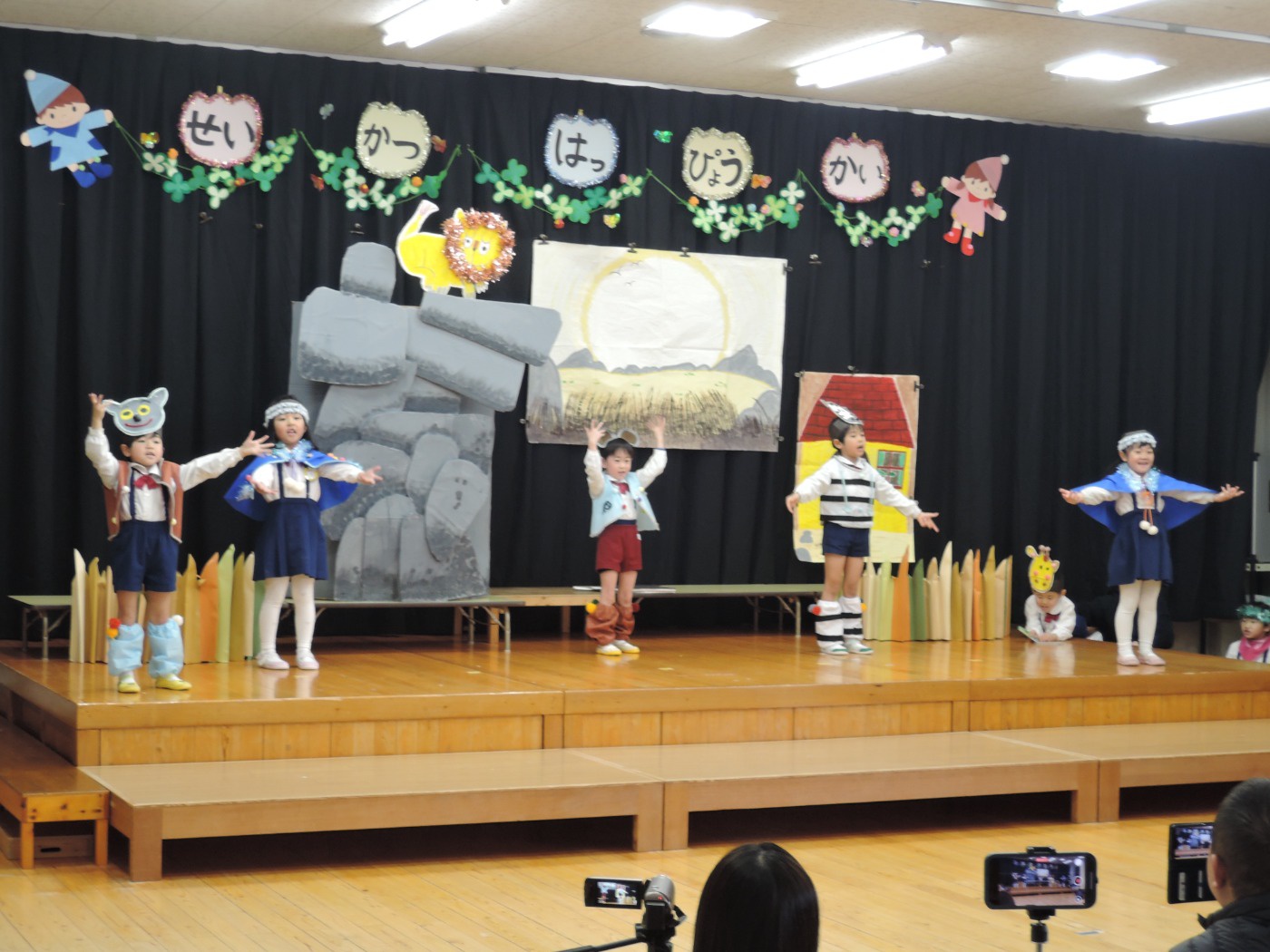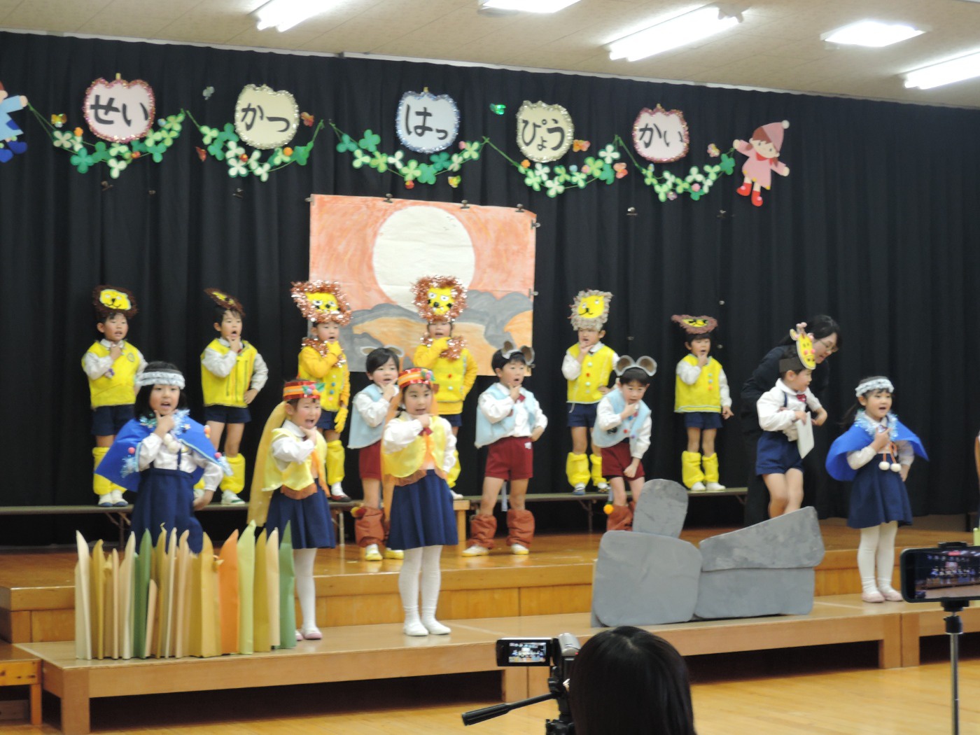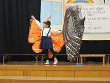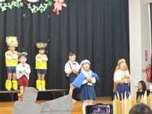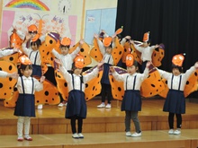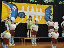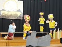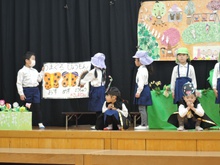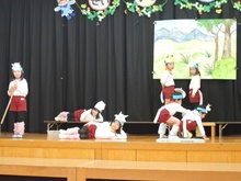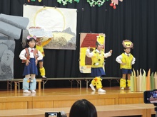生活発表会に向けて長い間練習に励みました。「家でも練習をしているんですよ」という声を何度も耳にしました。子どもたちはどんどん劇の世界に入り、役になりきって劇遊びを楽しむようになりました。今までの練習の成果を、たくさんの保護者の方、地域の方に観ていただくことができて幸せでした。ありがとうございました。