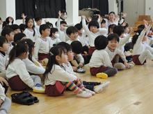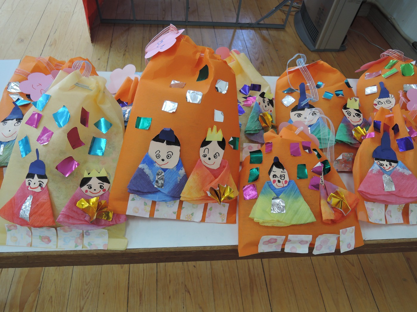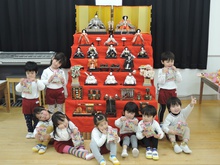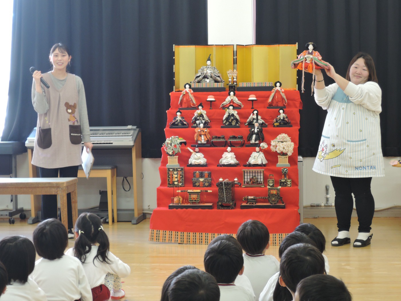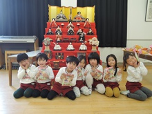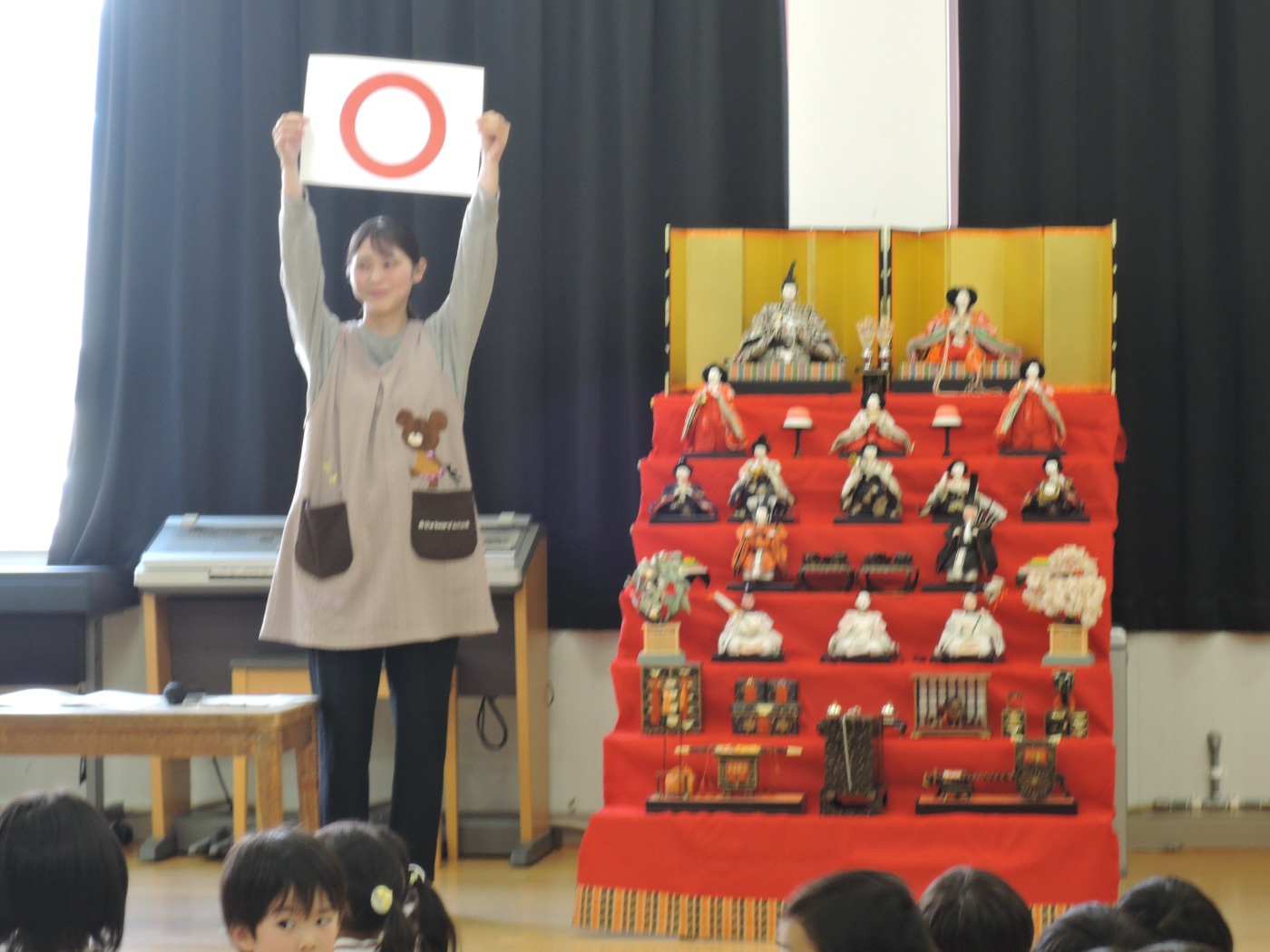 3月3日は桃の節句、みんなでホールに集まって、ひなまつり会を開きました。ホールにはきれいな七段のおひな様が飾ってあります。先生から、桃の節句やおひな様についてお話を聞いた後、○×クイズ大会で盛り上がりました。「うれしいひなまつり」「うぐいす」が元気よく歌えましたね。最後に先生から、ひなあられをもらいました。赤いあられは桃の花、白は雪、緑は若草を表し、それぞれ『魔除け』『清浄』『邪気払い』の願いが込められています。ご家族の皆さんで、ひなあられを食べてくださいね。