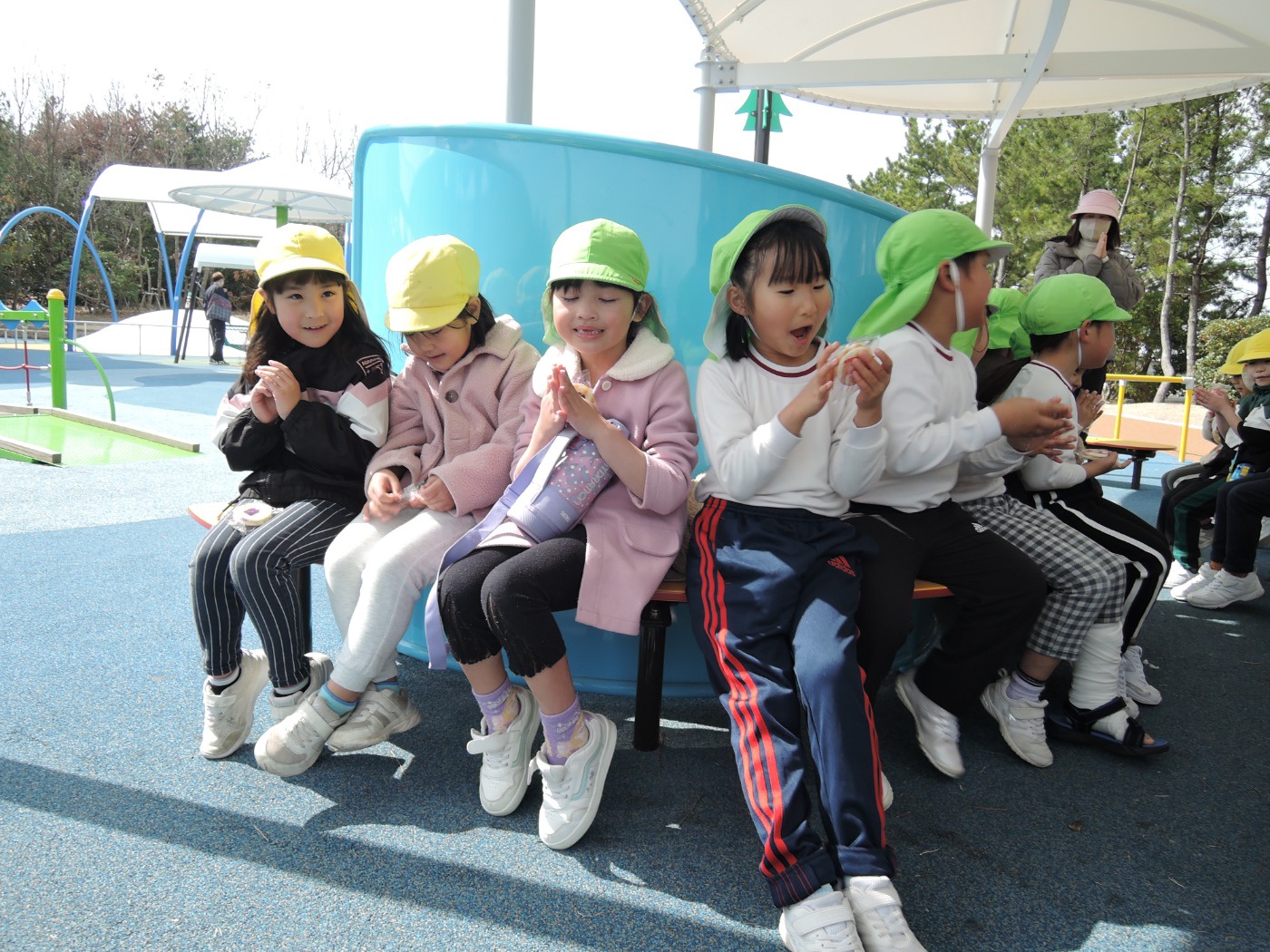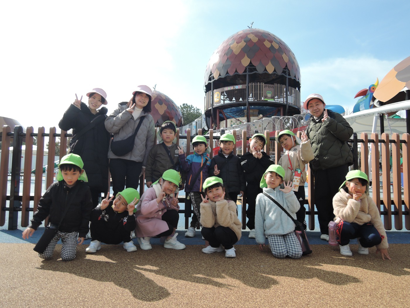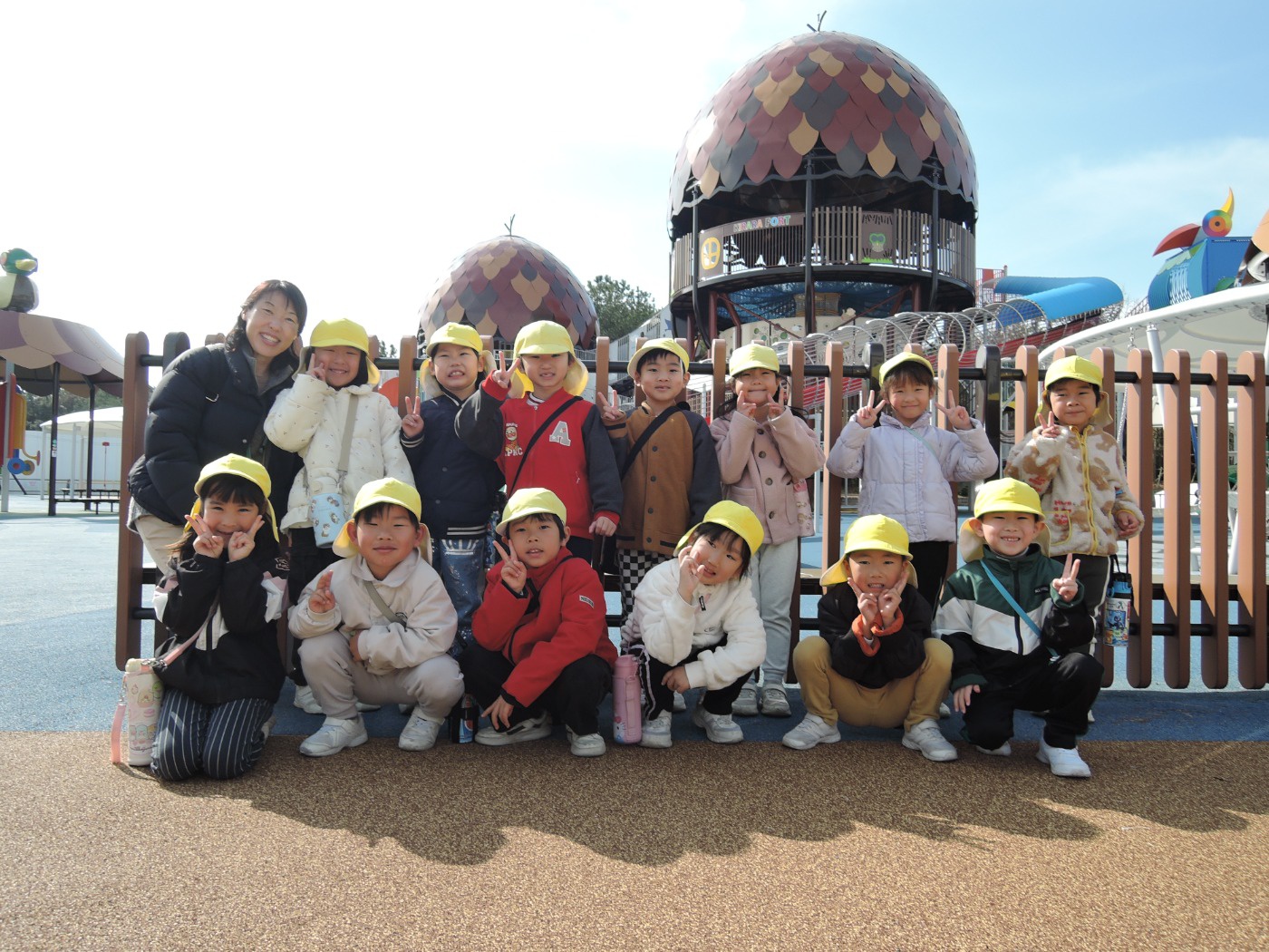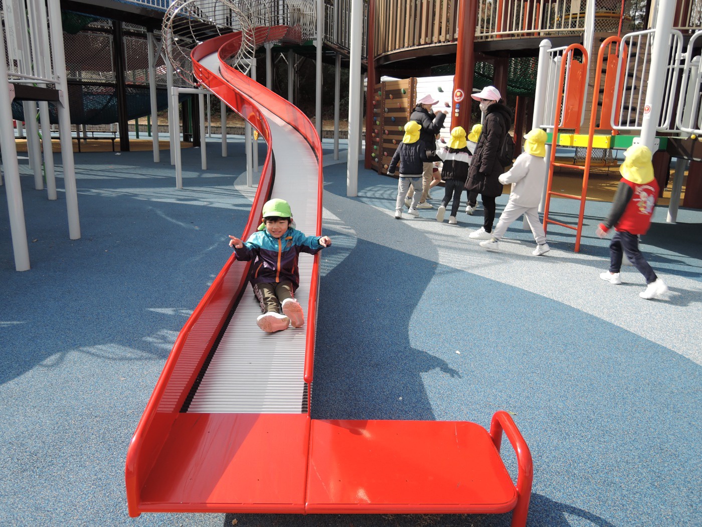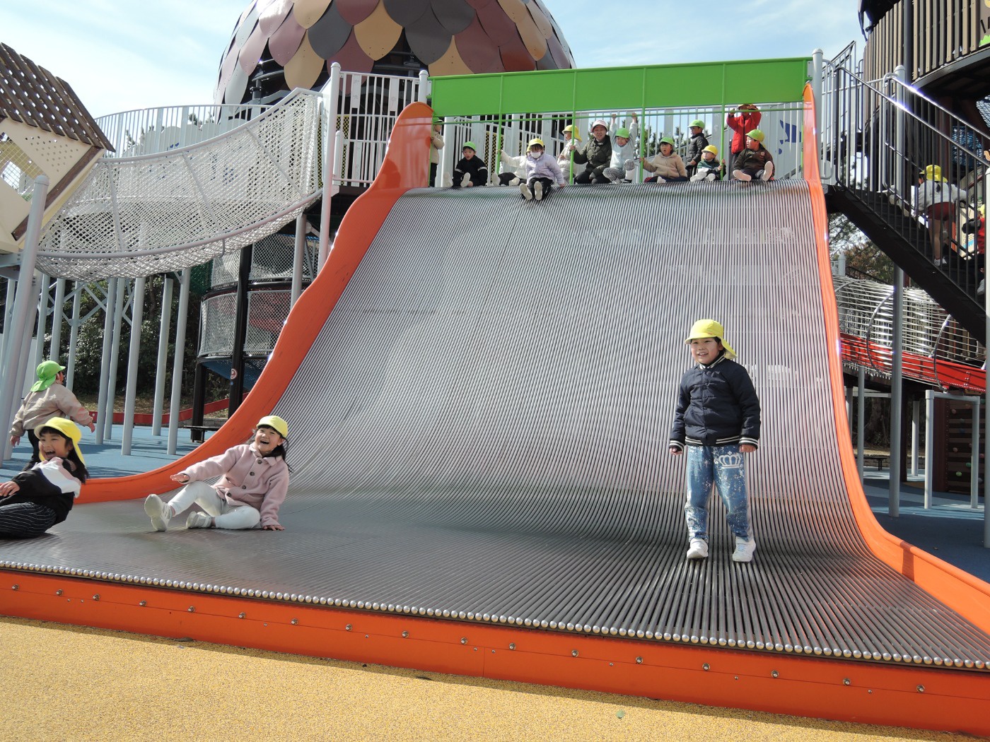 年長のすずらん組・ゆり組が山口きらら博記念公園内にある大型複合遊具広場『きららんど』に出かけました。バスの中では、なぞなぞやクイズで盛り上がっていましたが、きららドームが見えると歓声があがりました。到着するとクラスごとに記念写真を撮ってから、「ぼうけんエリア」でダイナミックに遊びました。どの遊具も魅力たっぷり。気に入った遊具は何度も繰り返し遊んでいました。東園にもどると、すずらん組のお部屋で一緒に美味しい給食をいただきました。卒園まで2週間、また1つ、楽しい思い出が増えました。すずらん組・ゆり組の絆は深まっています。