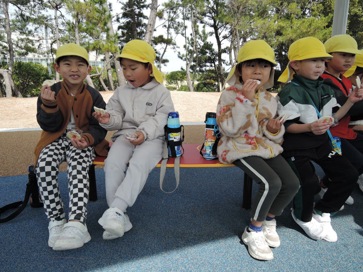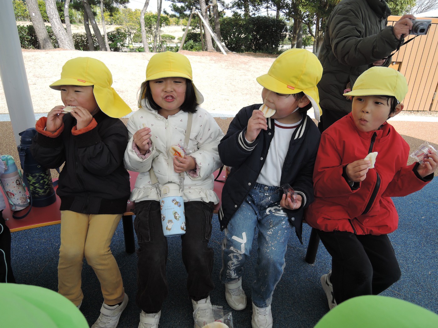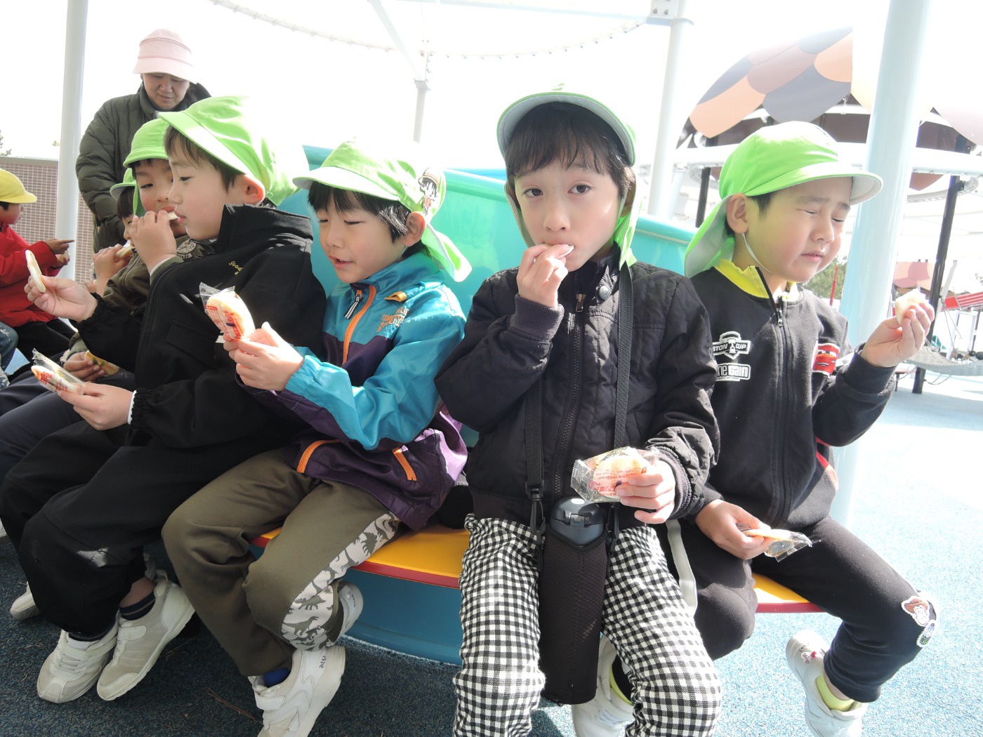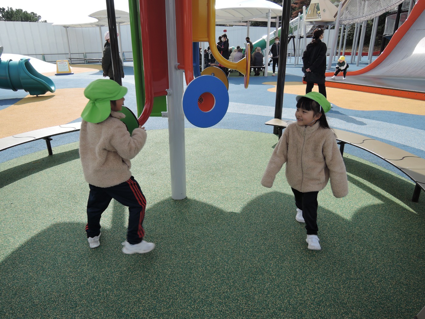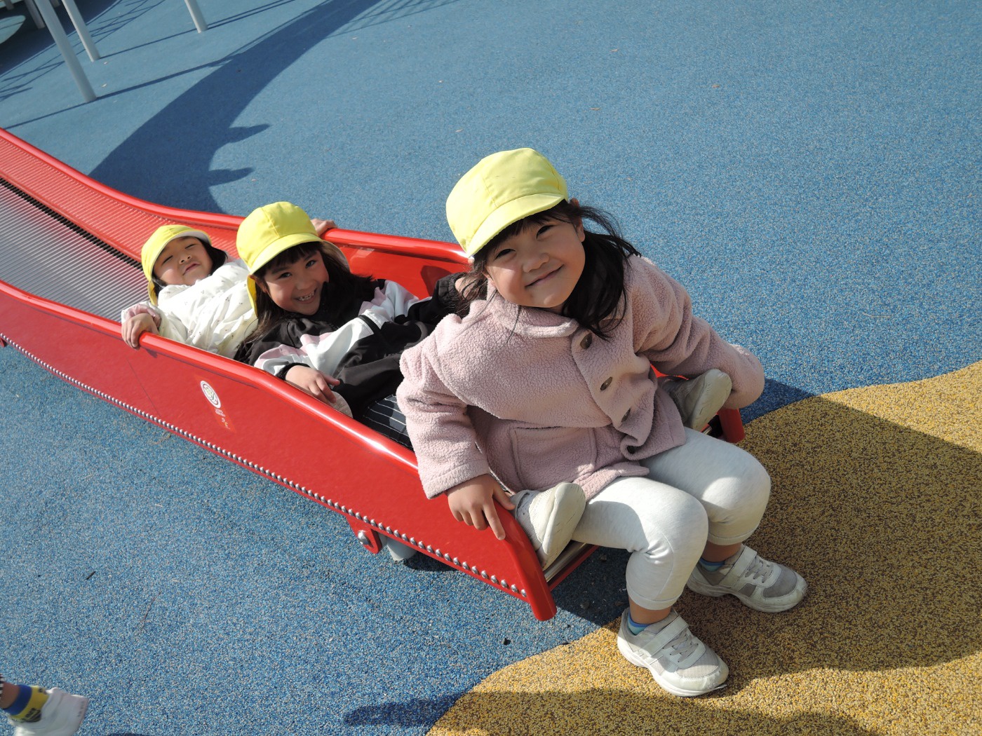 年長のすずらん組・ゆり組が山口きらら博記念公園内にある大型複合遊具広場『きららんど』に出かけました。バスの中では、なぞなぞやクイズで盛り上がっていましたが、きららドームが見えると歓声があがりました。到着するとクラスごとに記念写真を撮ってから、「ぼうけんエリア」でダイナミックに遊びました。どの遊具も魅力たっぷり。気に入った遊具は何度も繰り返し遊んでいました。東園にもどると、すずらん組のお部屋で一緒に美味しい給食をいただきました。卒園まで2週間、また1つ、楽しい思い出が増えました。すずらん組・ゆり組の絆は深まっています。