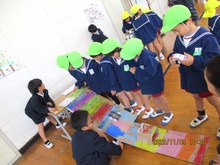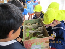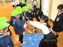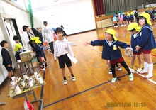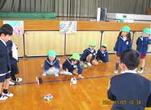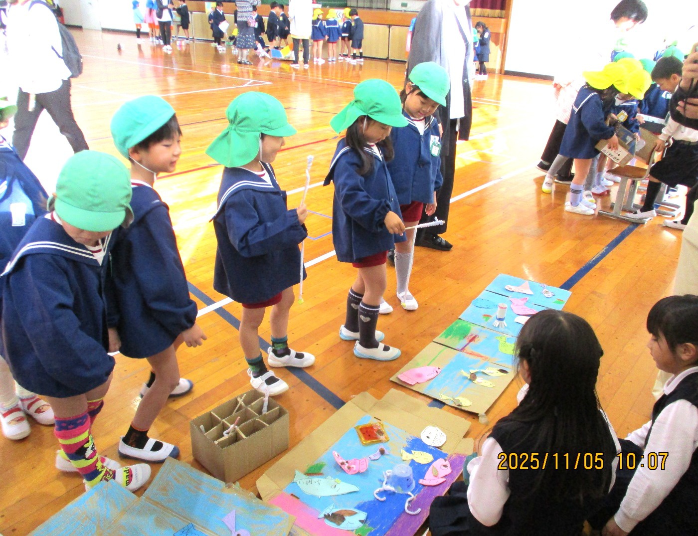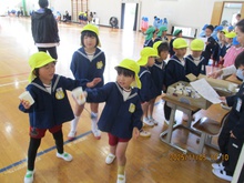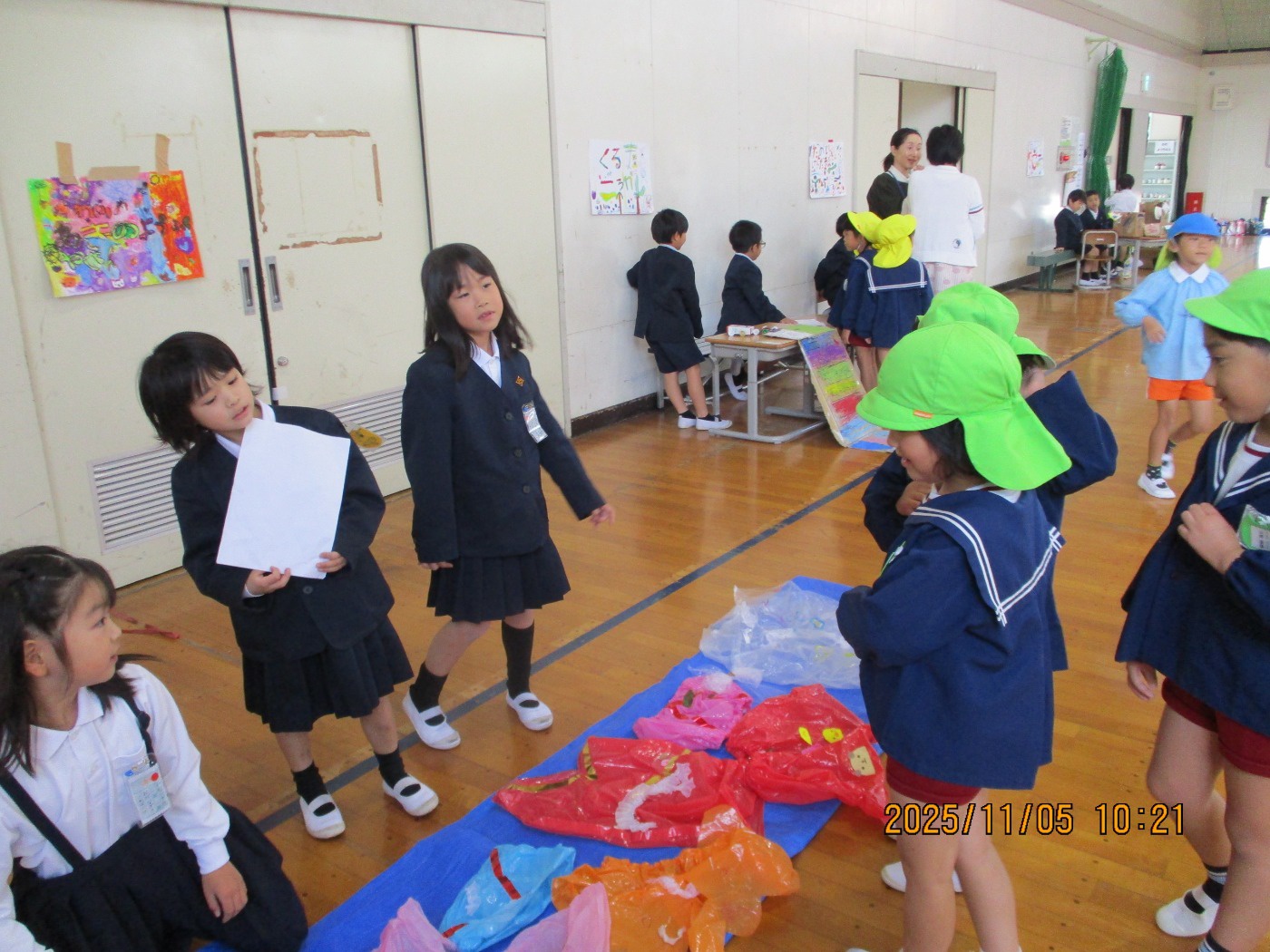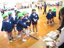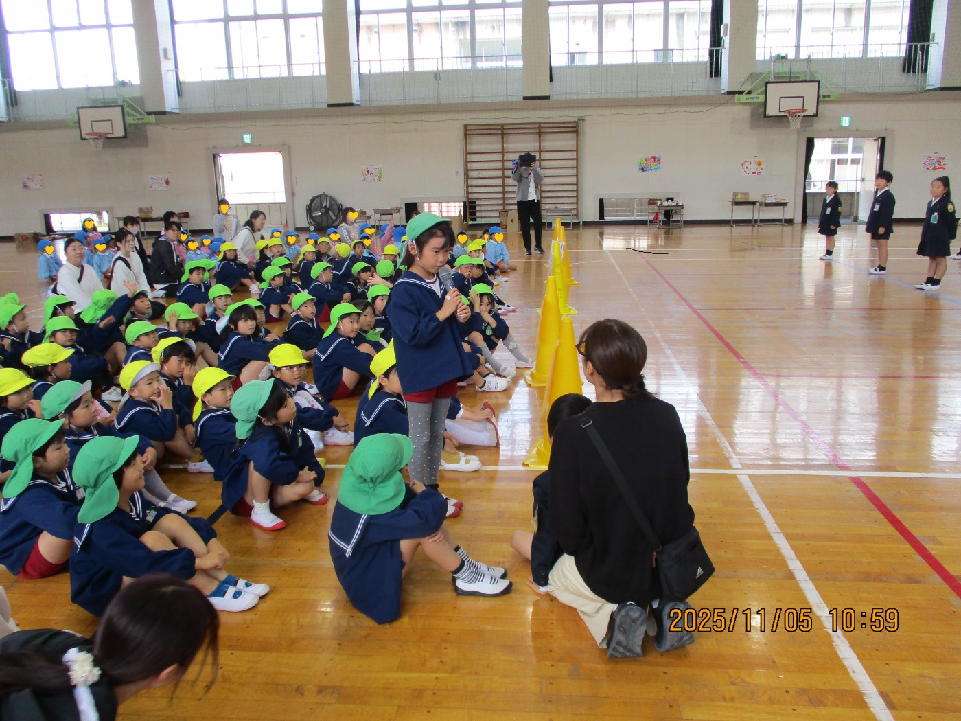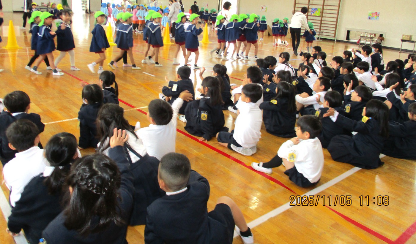 牟礼小学校1年生からご招待を受け、牟礼地区の幼稚園・保育園の年長組さんが、11月5日(水)「秋まつり」に参加しました。牟礼園の年長組さんは、牟礼小学校をめざして徒歩で向かいました。