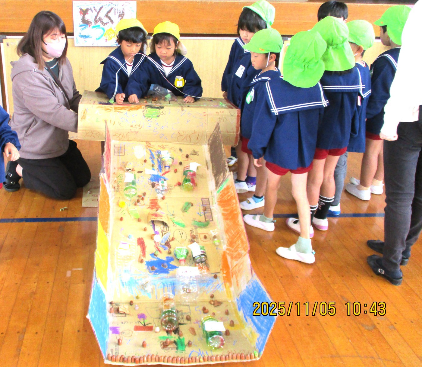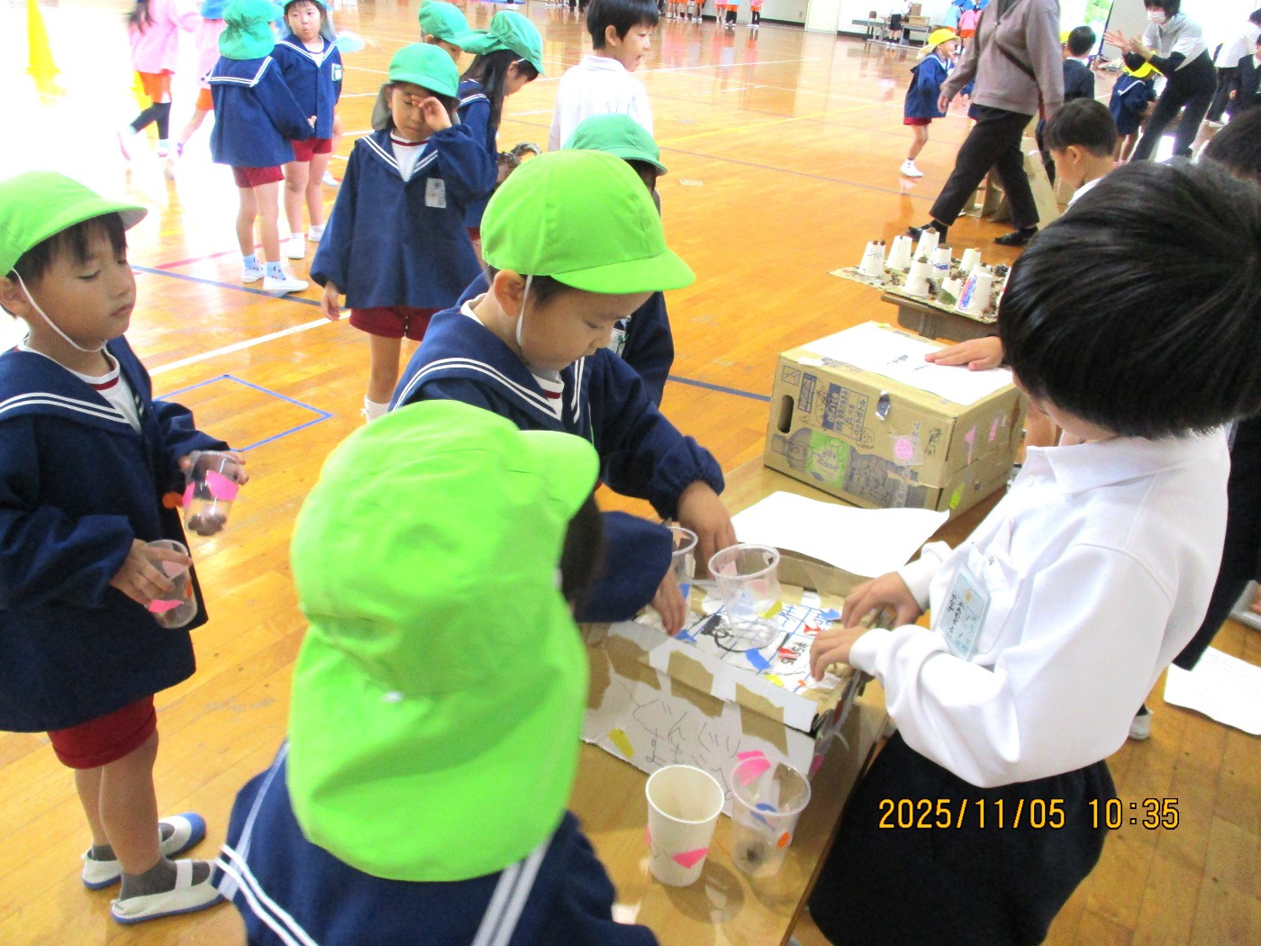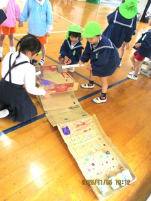 広い体育館には、秋の木の実等を活用したコーナーが26もセッティングされ、時間いっぱい楽しむことができました。今春、卒園し小学校に入学した卒園児さんが、開閉会のセレモニーであいさつをし、コーナーの説明をしっかり伝える姿に感動しました。例年以上にアイディア満載のコーナー・ワクワクするネーミングのポスター・工夫を凝らしたルール・クオリティーの高い手作りおもちゃ…年長組さんの〝小学校入学の憧れと期待″がますます膨らんだようです。
