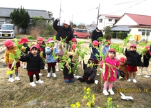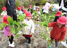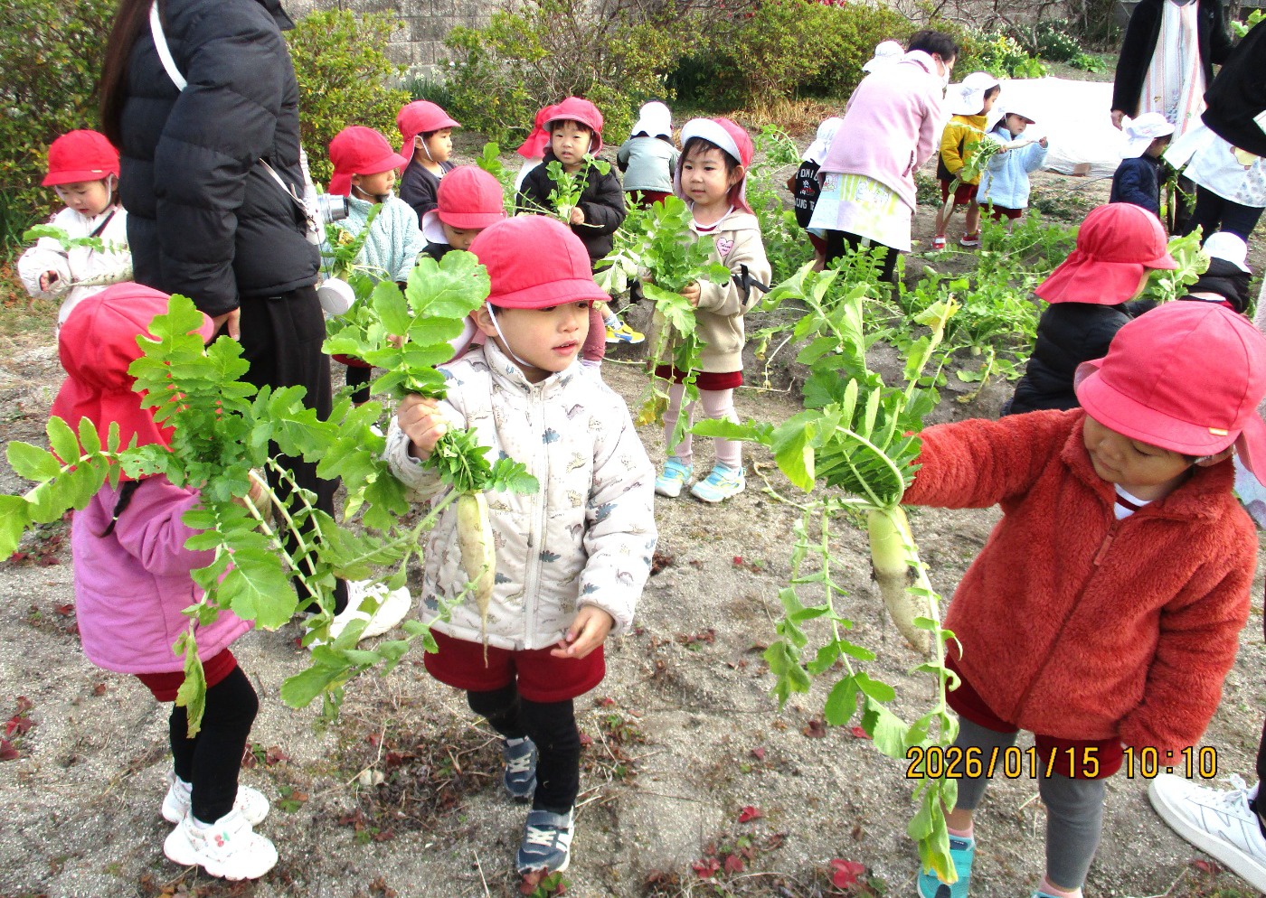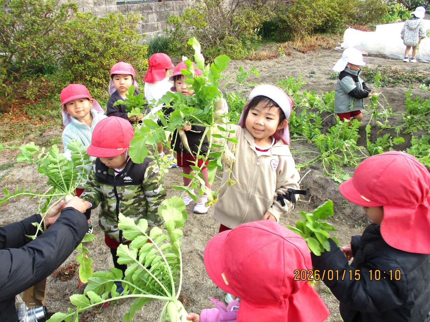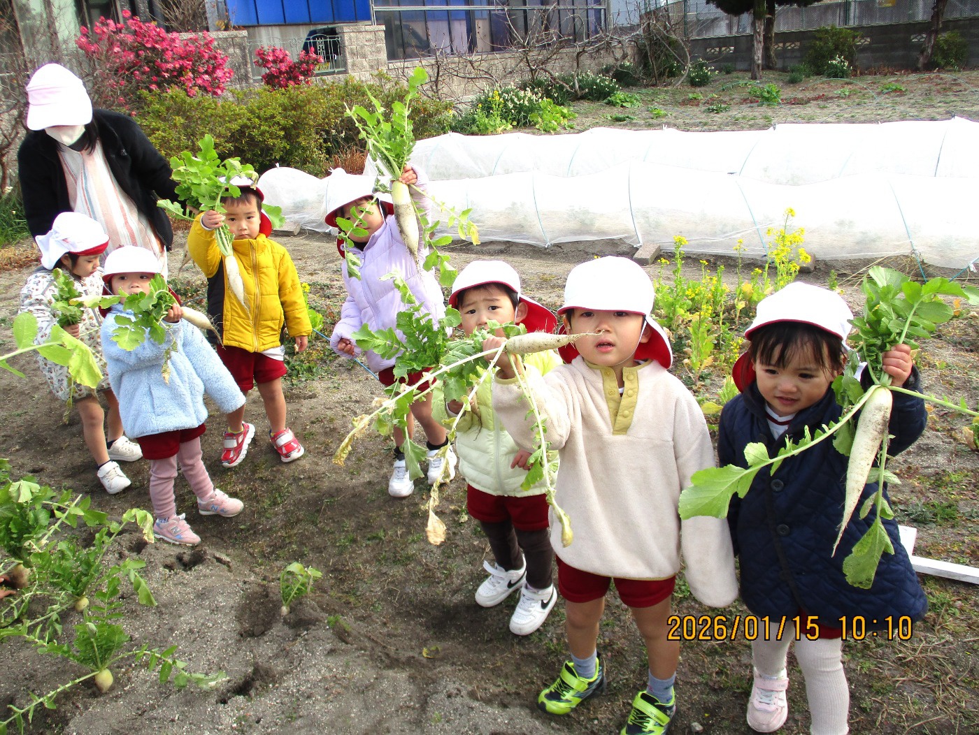 2学期の終わりに年少・年中組さんが収穫した大根。「大きく育つまで待ってみよう。」と残りの小さな大根が育つのを期待して年明けまで待ち、どんど焼きの後に4年保育さんが収穫しました。期待通りの大きさ・・・とまではいきませんでしたが、子どもたちは張り切って力いっぱい引き抜くことができました!