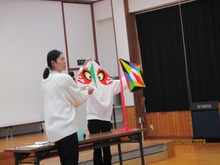 先生からのお話は「お正月の遊び」。凧揚げ・羽子板つき・けん玉あそびを実演を交えて紹介してもらいました。