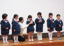 園の合言葉『太陽のように あかるく たくましく やさしく かしこく』を振り返り、年中・年長組の担任ががんばった子どもたちのエピソードを発表すると、感激して涙ぐむお友だちも!
