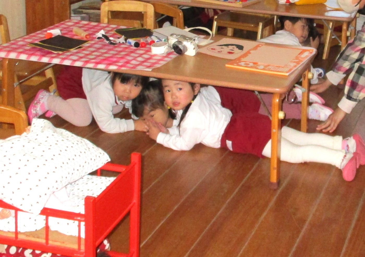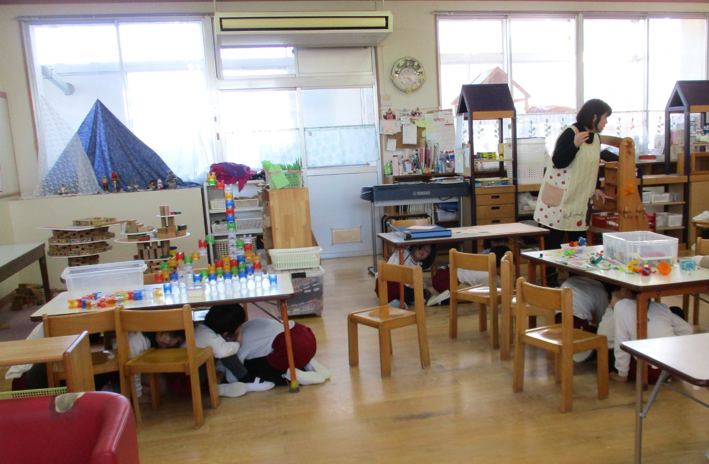 「訓練。訓練。地震です。先生方は出口を確保してください。子どもたちを落下物のないところに集めて座らせてください。大きいクラスの子は机の下に入りましょう。頭の出ている子はいませんか?揺れがおさまるまで動かないでください。子どもを落ち着かせるように声をかけましょう。」というアナウンスを聞いて避難します。