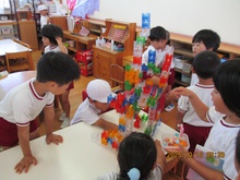 久しぶりに会う卒園生の立派な姿に感心しきり。手作りおもちゃの遊び方の実演を交え、堂々と挨拶をする姿に、年長組さんは憧れのまなざしを送っていました。