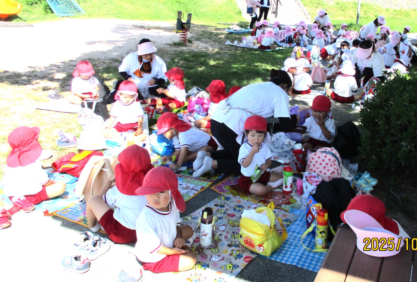 朝から気になるのは愛情たっぷり『手作りお弁当』!目的地の遊具はもちろんのこと、避難車やバスでの移動・お弁当タイム…とウキウキが止まらない一日となりました。