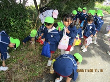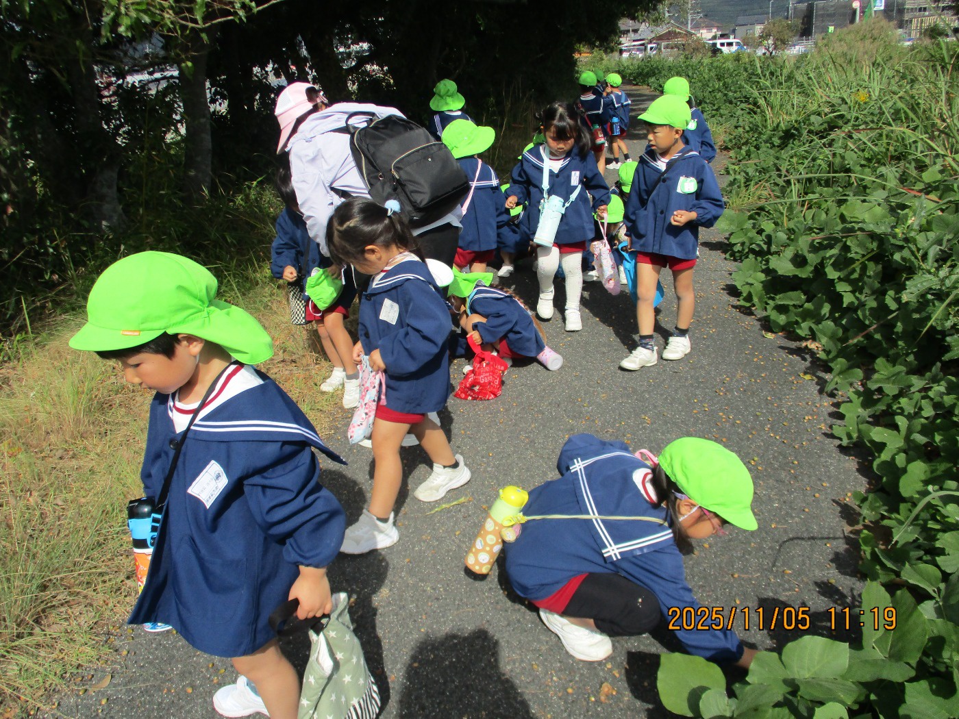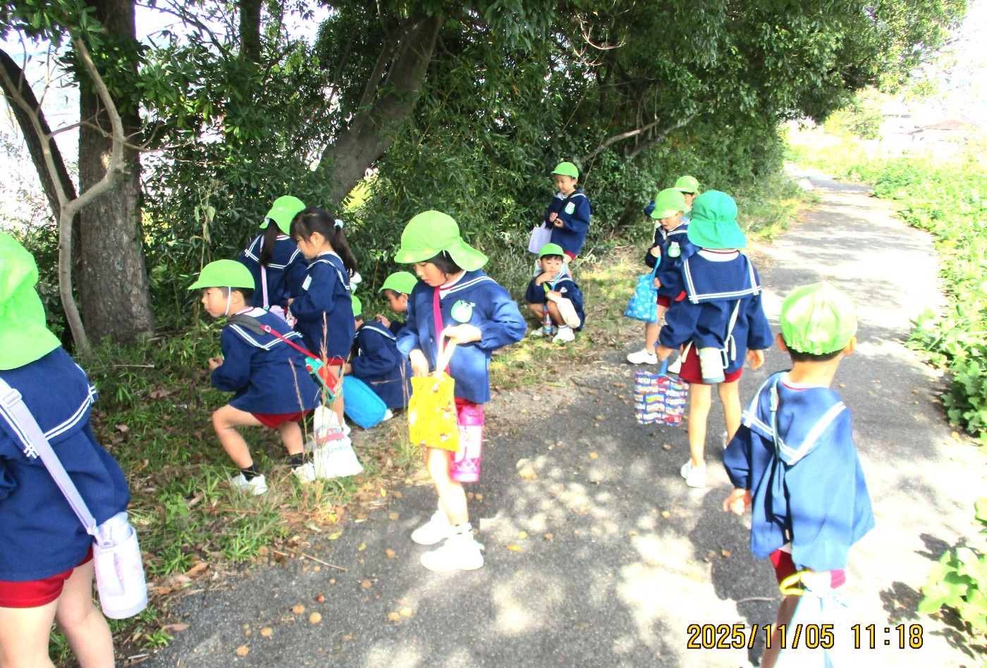 「牟礼小 秋まつり」の帰路は、どんぐり小路を通って、どんぐり拾いを楽しみました。大きい「くぬぎ」やかわいい「あらかし」…夢中になって秋の自然に親しみました。「こまを作ろうかなあ」…拾ったどんぐりは、どんなおもちゃや作品に変身するのでしょうか?
