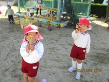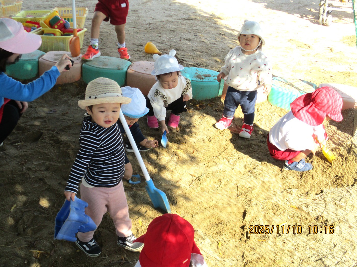 0歳児クラスのさくらんぼ組さん。小さなどんぐりを見つけたようですよ!
