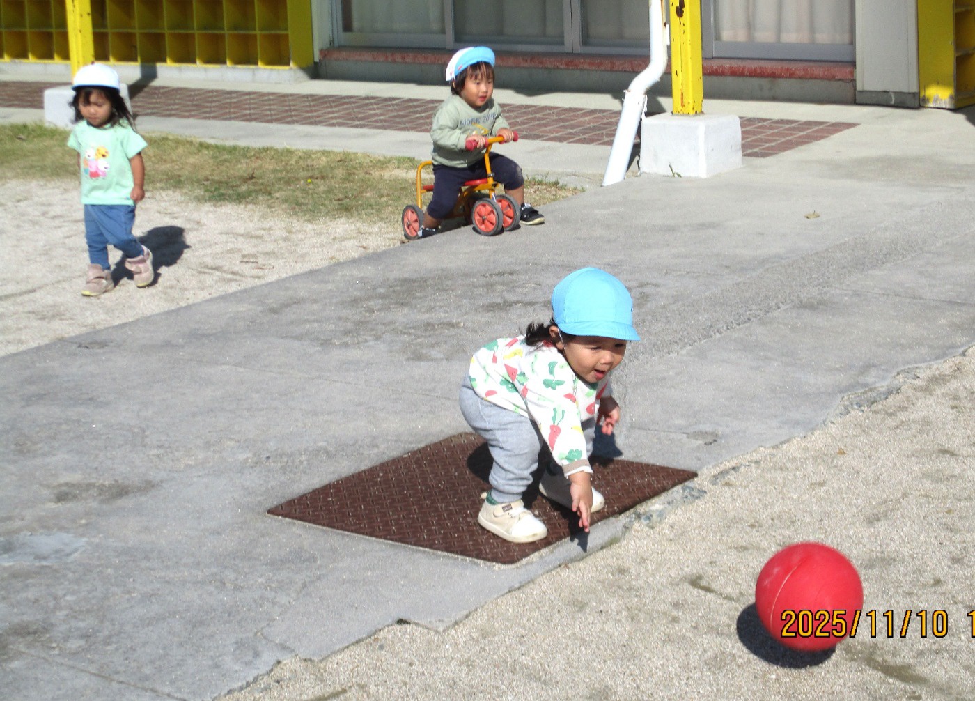 ボールをコロコロ~。目でしっかりボールを追って先生にエイヤ~!中腰の動作で体幹も鍛えられます。