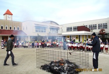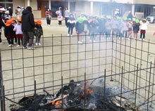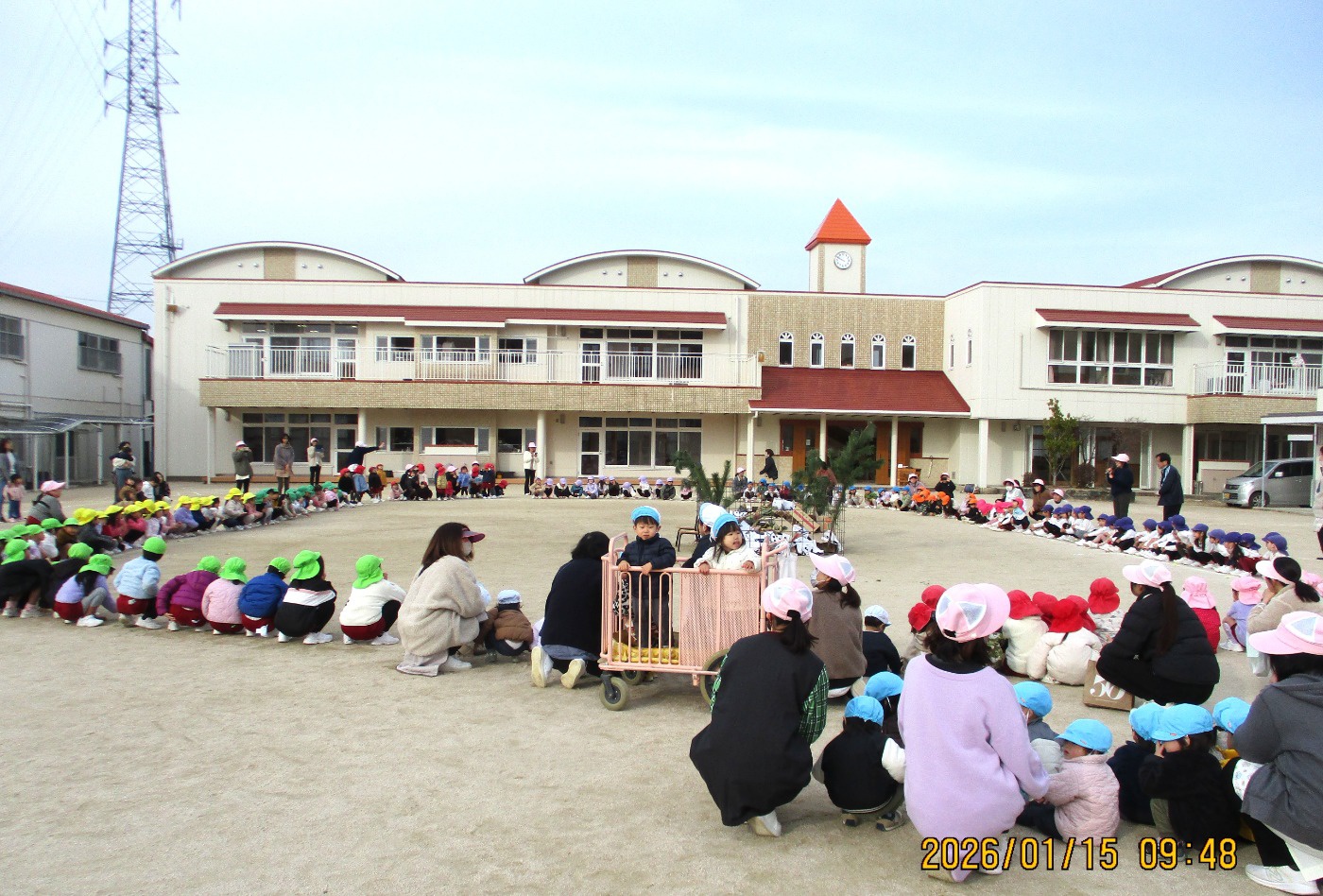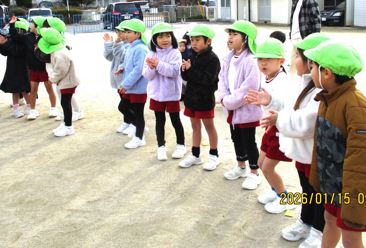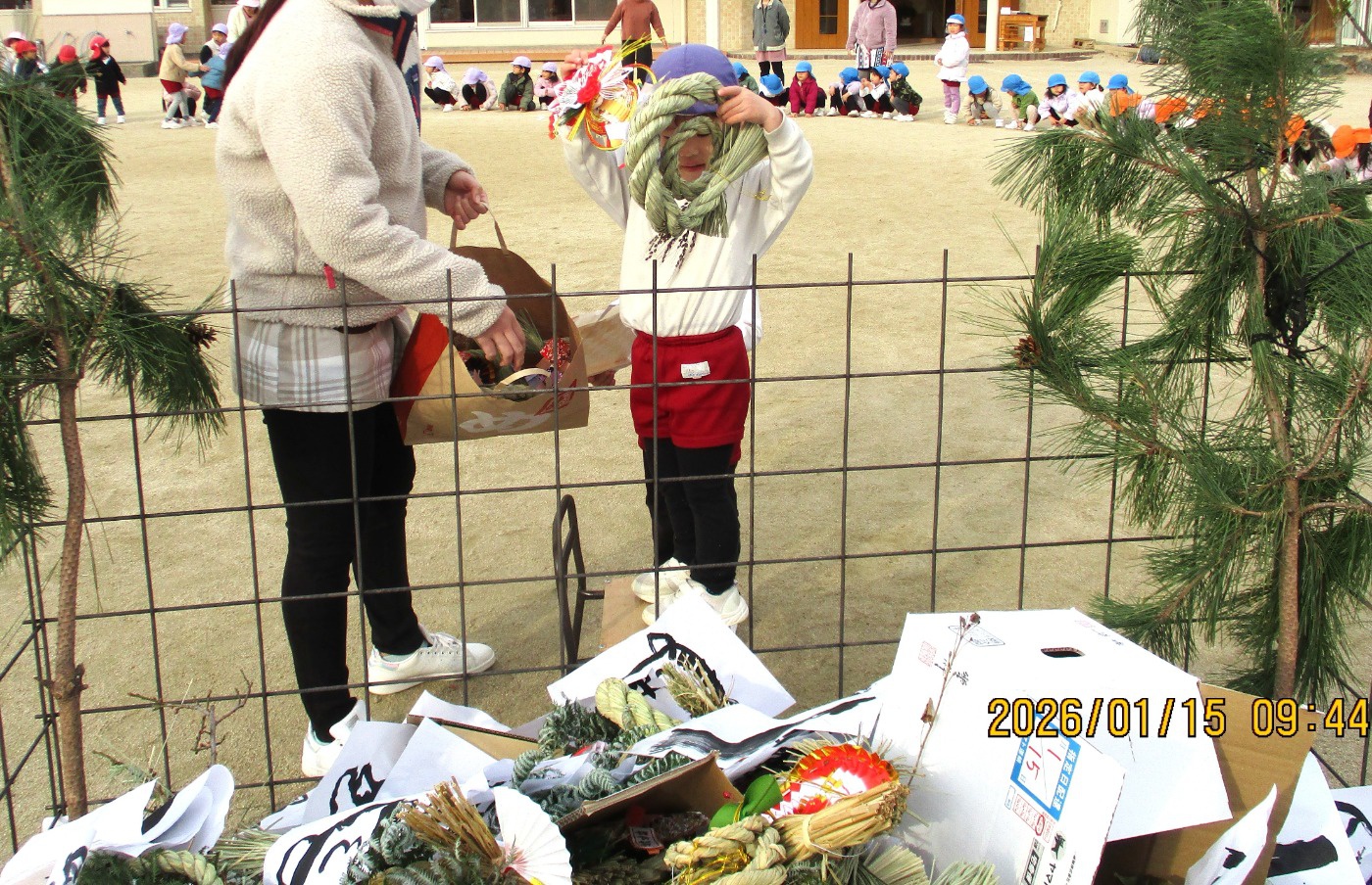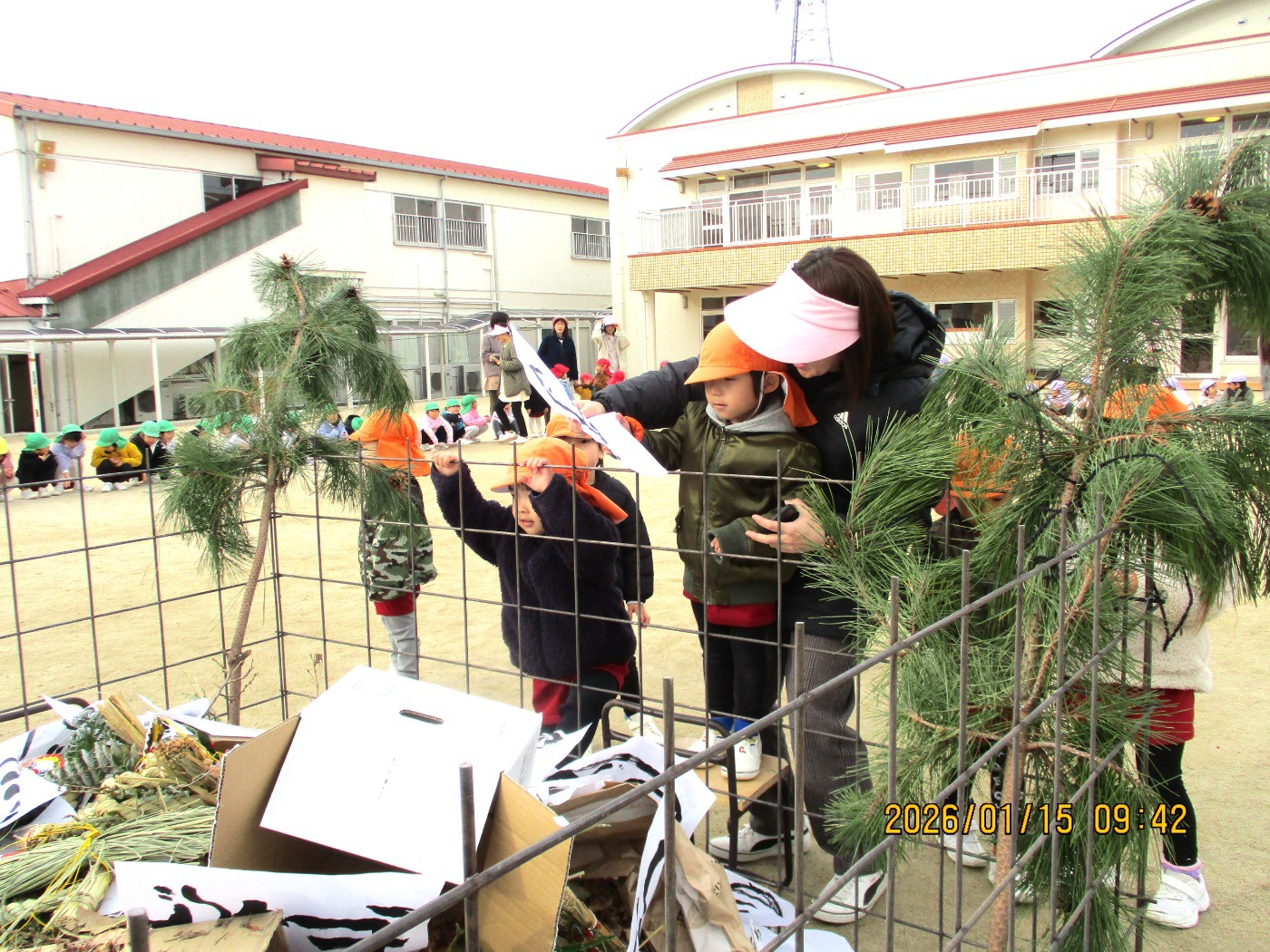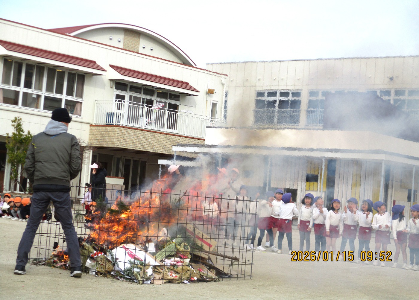 小正月の15日(木)園庭で「どんど焼き」を行いました。お正月飾りや門松の竹等に子どもたちの書初め(描初め)を加え点火すると、燃え上がる炎とともに立ち昇る煙。年神様の帰り道で人々の祈りの道ともいわれる煙が高く昇るほど〝願いが天に届く″そうです。火がつなぐ感謝と祈りの文化に触れる事ができた貴重なひと時でした。
