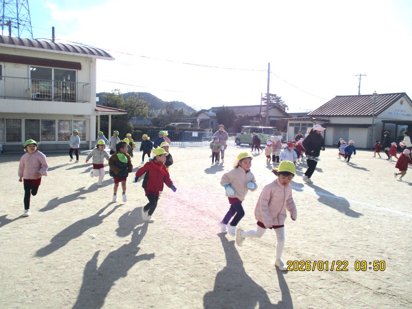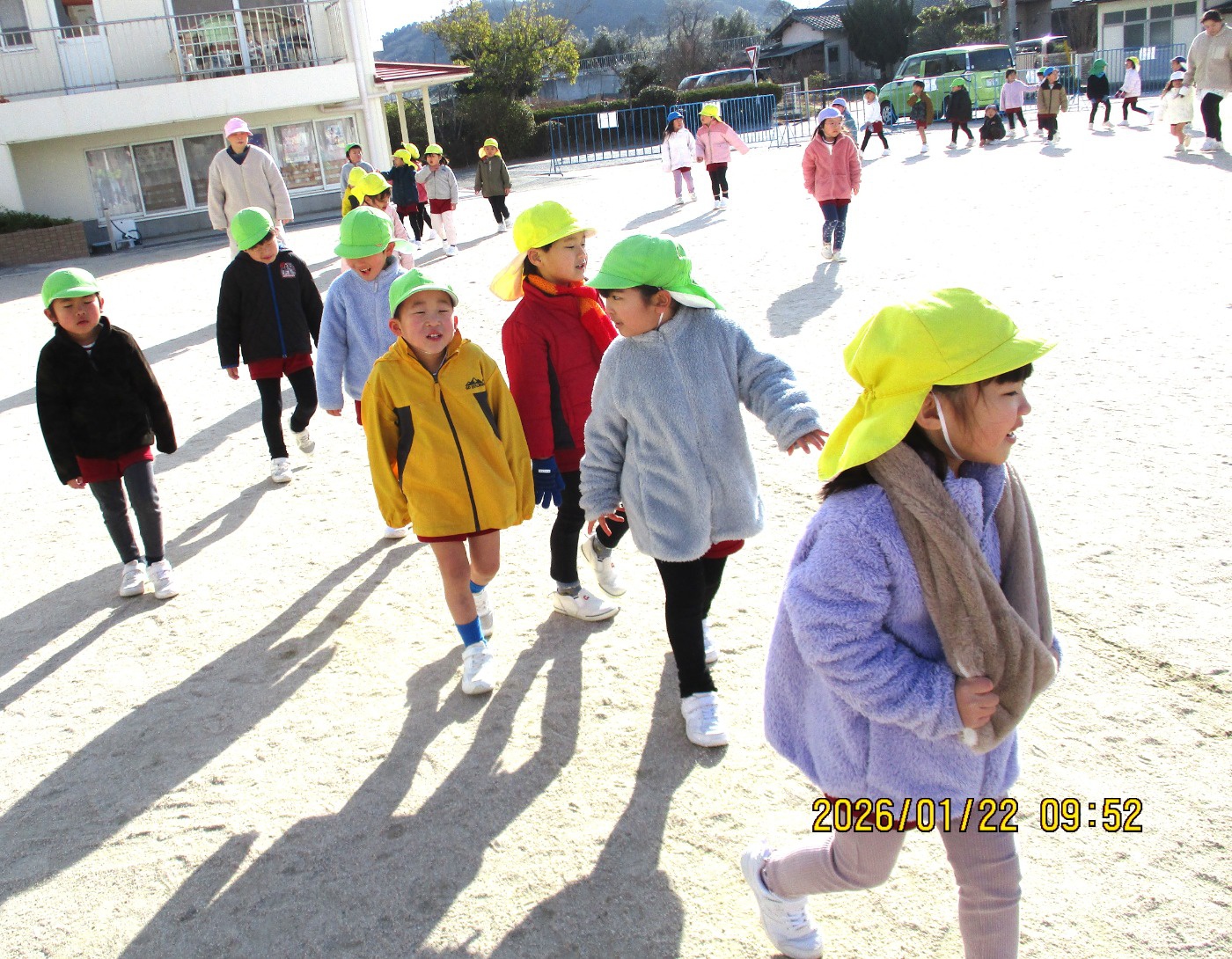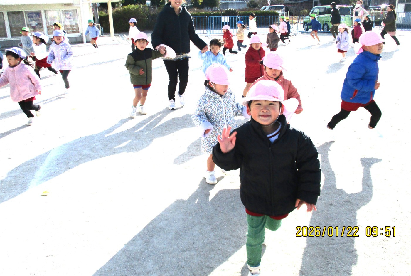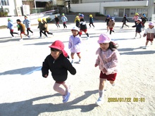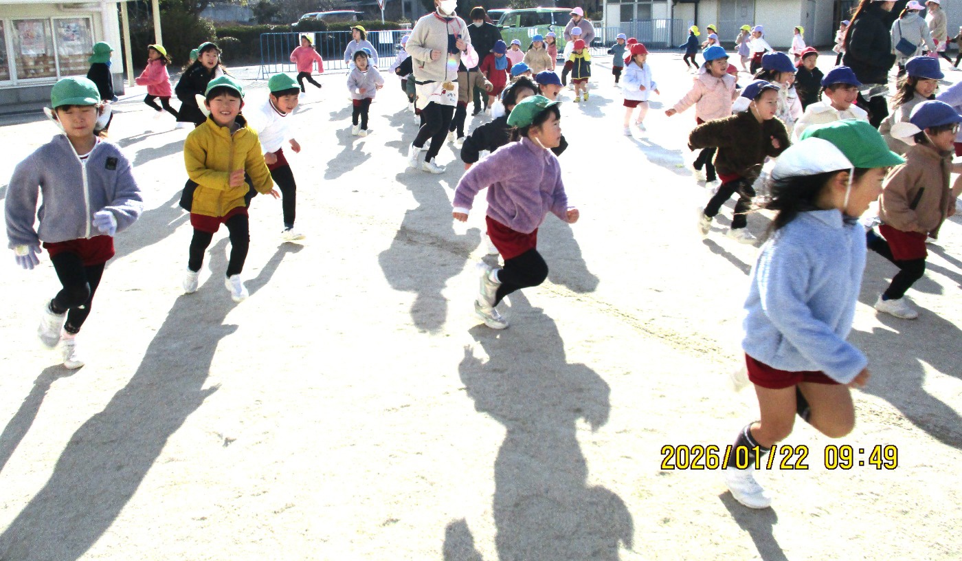 2026年01月26日 子どもは風の子 元気な子!♫走る~走る~ぼくたち~♫ 今年一番の寒波もものともせず、元気いっぱいの子どもたち! 北風を身体で受け止め、持久走あそびを楽しんでいます。 クールダウンできるように、最後はゆっくり歩いて呼吸を整えます。 かけっこや鬼ごっこ等〝全力で走る・追いかける・逃げる″あそびを通して「速く走る意識や身体の使い方を覚える」ことも保障しながら、ゆっくり自分のリズムで長い距離を走る持久走にも挑戦しています。 「ぽかぽかしてきた~!」寒い日も身体を動かすと温まることにも気づけますね。