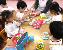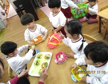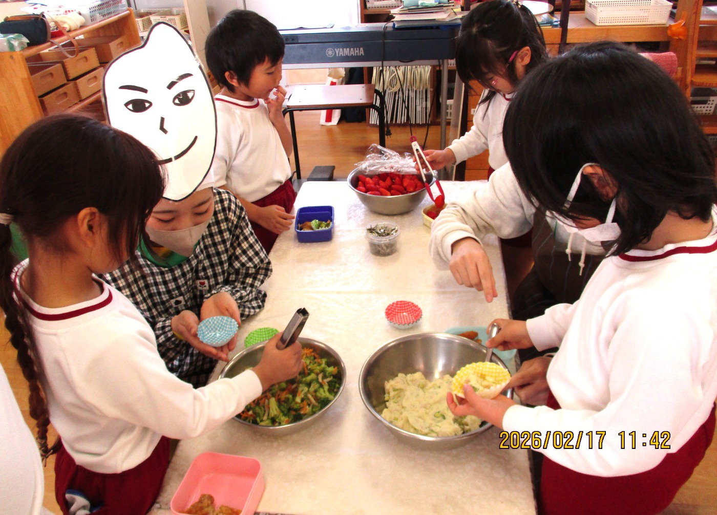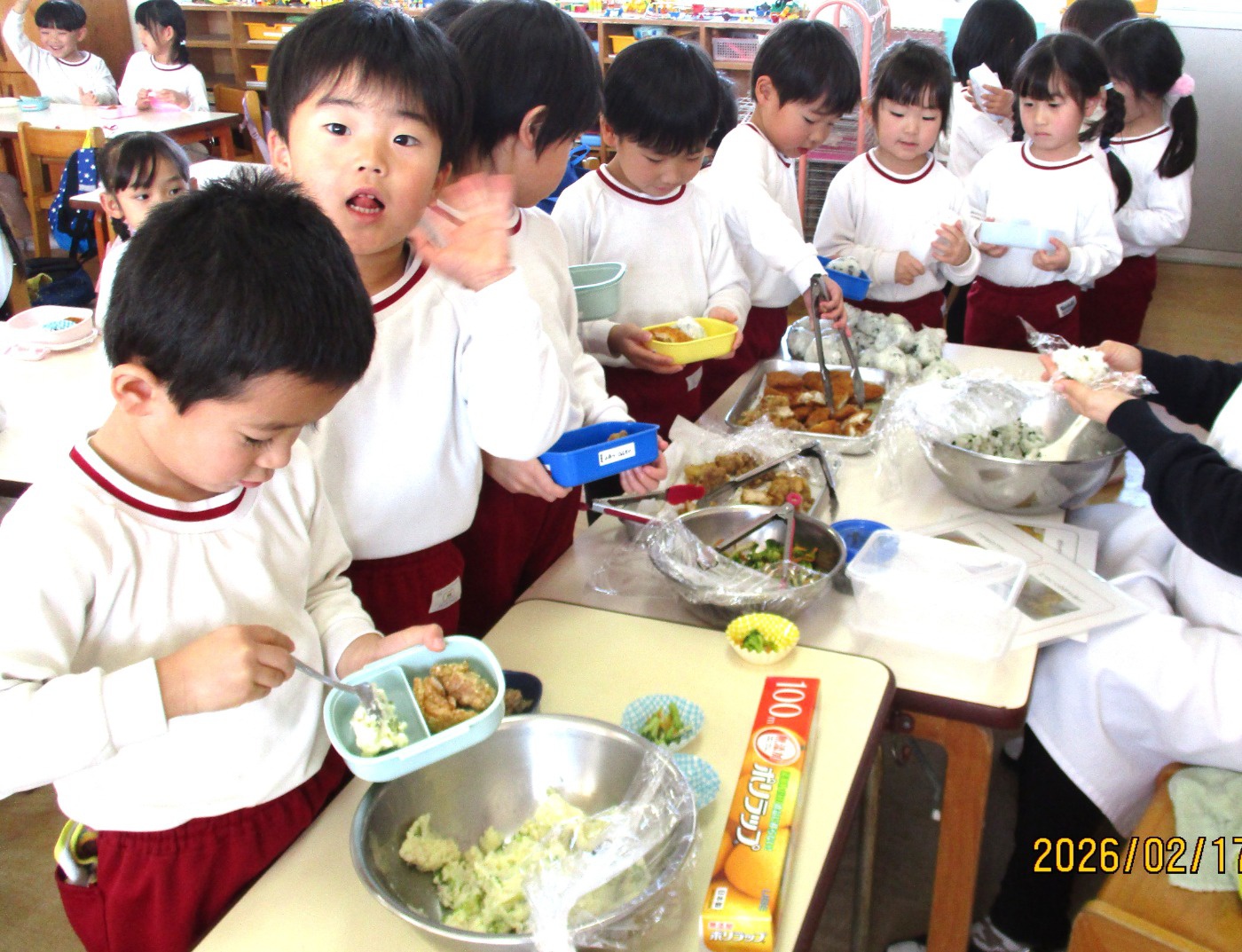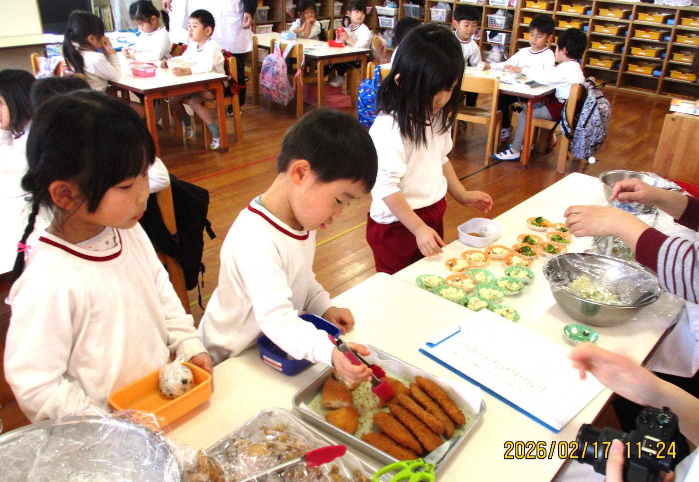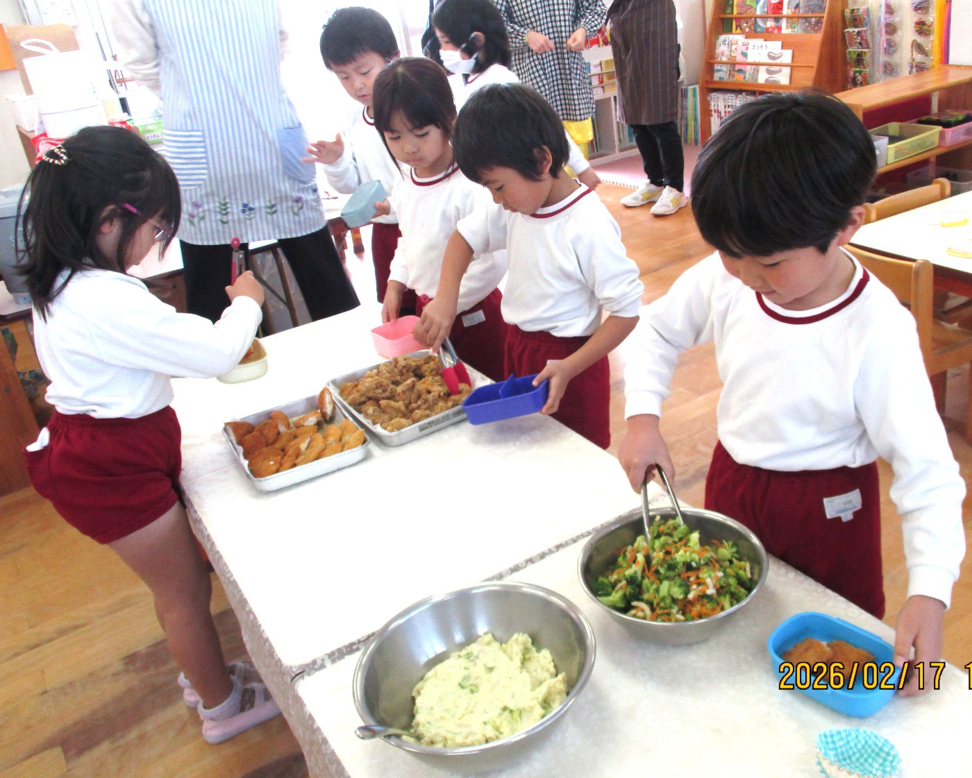 そうです!今日は、みんなが心待ちにしている「空弁当の日」!しかも4年保育さん以上は、主菜(唐揚げ・白身魚のフライ)と副菜(ポテトサラダ・ブロッコリーのサラダ)からセレクトできるように、初めて「セレクト空弁当の日」を試みてみました。