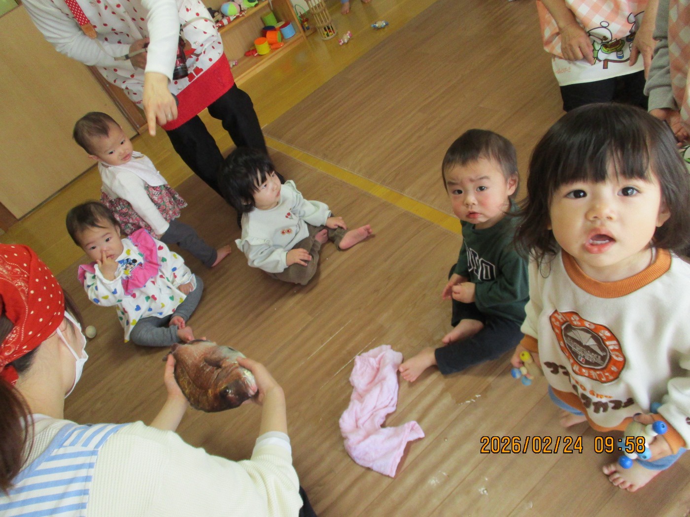 管理栄養士の先生に鯛を持ち上げ、近づけてもらうと、恐る恐るチョンチョン!ファーストペンギン気質のお友だちが先陣を切って触りに来ることができました。