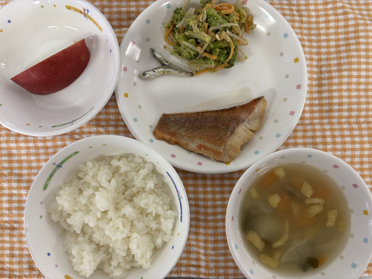 2026年01月20日(火) 給食ブログ 2026/1/20 【給食】・パン ・鶏肉のマーマレード焼き ・ほうれん草のソテー ・ミネストローネ ・オレンジ・いりこ 【おやつ】・お茶・菜飯おむすび 今日のおやつは、つくし・もも組さんが収穫してくれた大根の葉を使用しました!