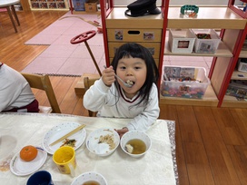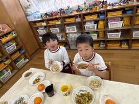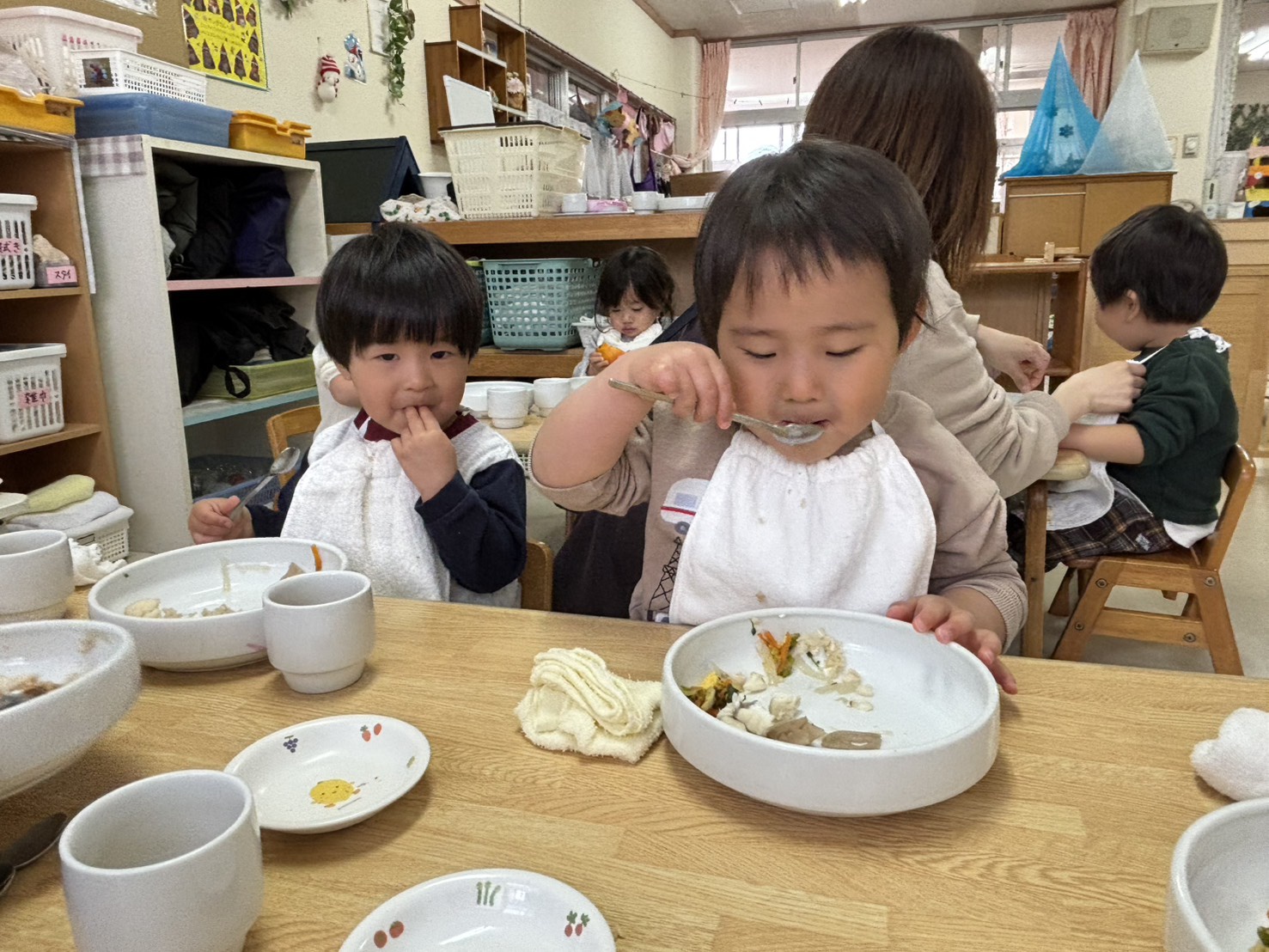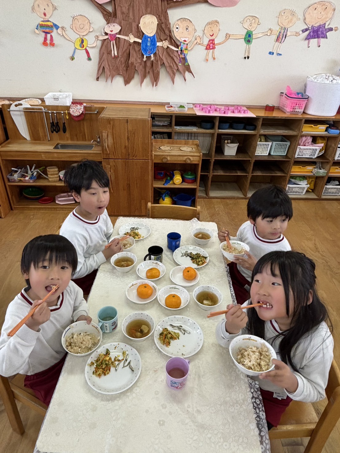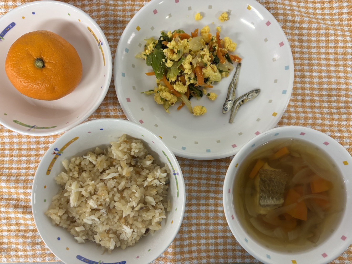 2026年02月27日(金) 給食ブログ NEW 2026/2/24 漁協さんからいただいた鯛を使った給食です! 【給食】・炊き込み鯛めし ・はなっこりーの卵炒め ・鯛のすまし汁 ・みかん・いりこ 【おやつ】・お茶・塩昆布おむすび 鯛おいしいね 鯛めしおいしい~! 鯛めしも鯛のすまし汁もどっちも好き! 鯛をぱくっ!