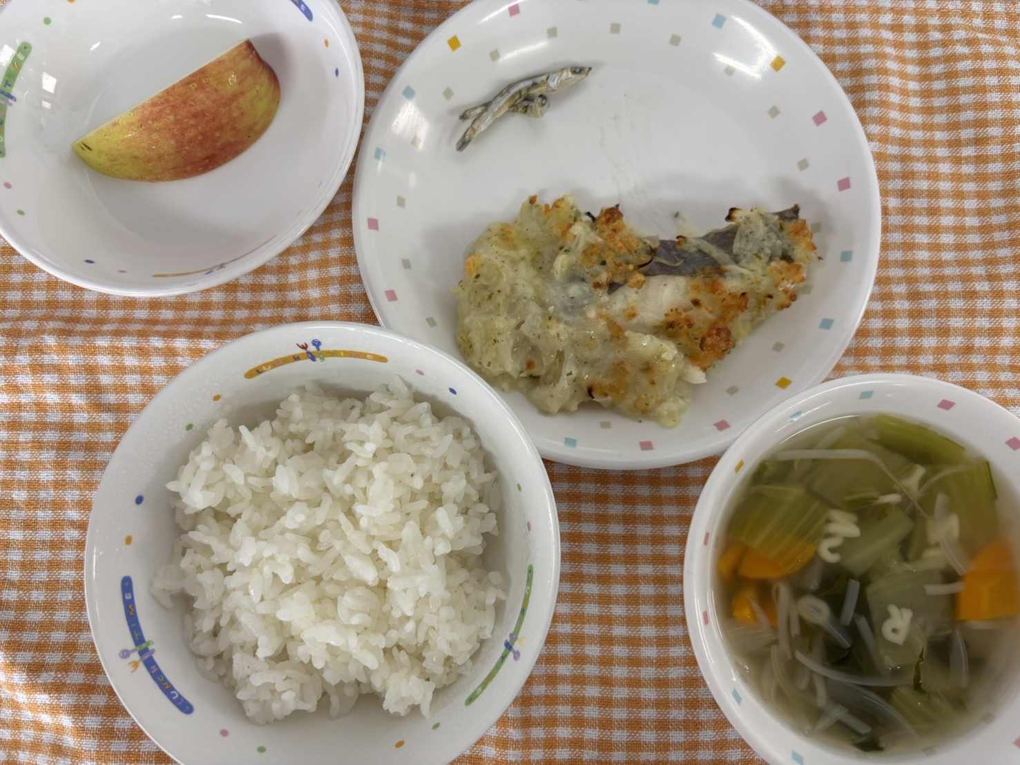 【給食】 ・ごはん ・ホキのチーズ焼き ・マカロニスープ ・りんご・いりこ 【おやつ】 ・牛乳 ・カルピスケーキ