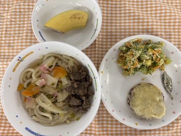 【給食】 ・肉うどん ・さつま芋の天ぷら ・ブロッコリーのチキンサラダ ・バナナ・いりこ 【おやつ】 ・お茶 ・ツナ塩昆布おにぎり