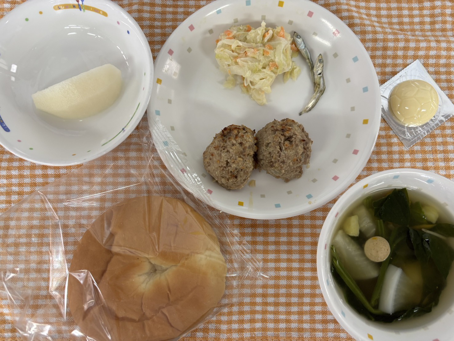 【給食】・パン ・照り焼きハンバーグ ・コールスローサラダ ・秋野菜ポトフ ・なし・いりこ 【おやつ】・お茶 ・わかめしらすおにぎり