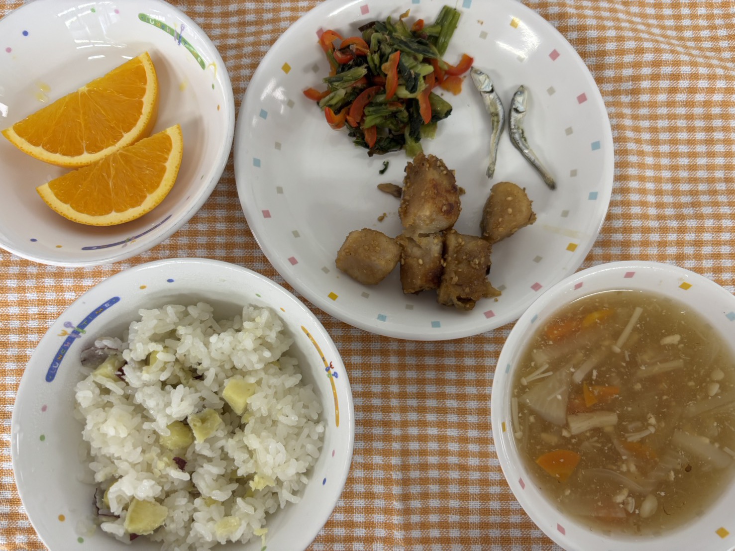 2025年10月27日(月) 給食ブログ 2025/10/27 【給食】・さつま芋ごはん ・かつおのごまがらめ ・小松菜の塩昆布和え ・かぶのそぼろ汁 ・オレンジ・いりこ 【おやつ】・牛乳 ・きな粉フレンチトースト