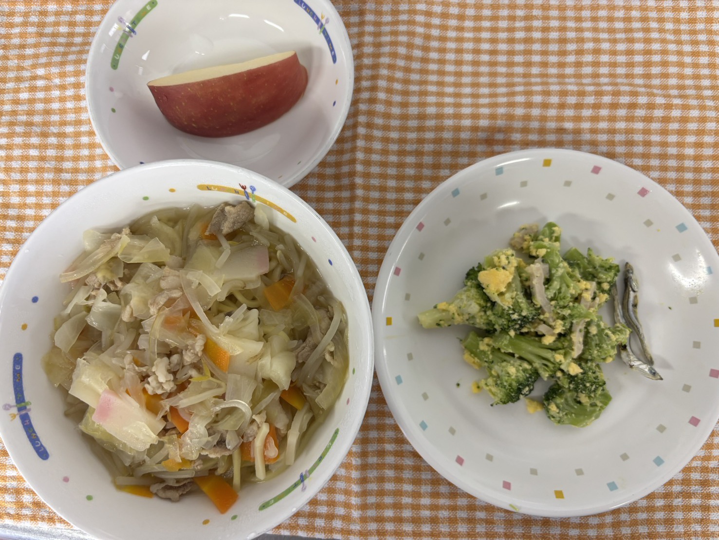 【給食】・ちゃんぽん ・ブロッコリーのミモザサラダ ・りんご・いりこ 【おやつ】・お茶 ・とうもろこしとウインナーの ぱくぱくおにぎり