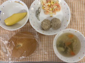 【給食】・パン ・豆腐ハンバーグ ・コールスローサラダ ・マカロニスープ ・バナナ・いりこ 【おやつ】・お茶・菜飯おむすび