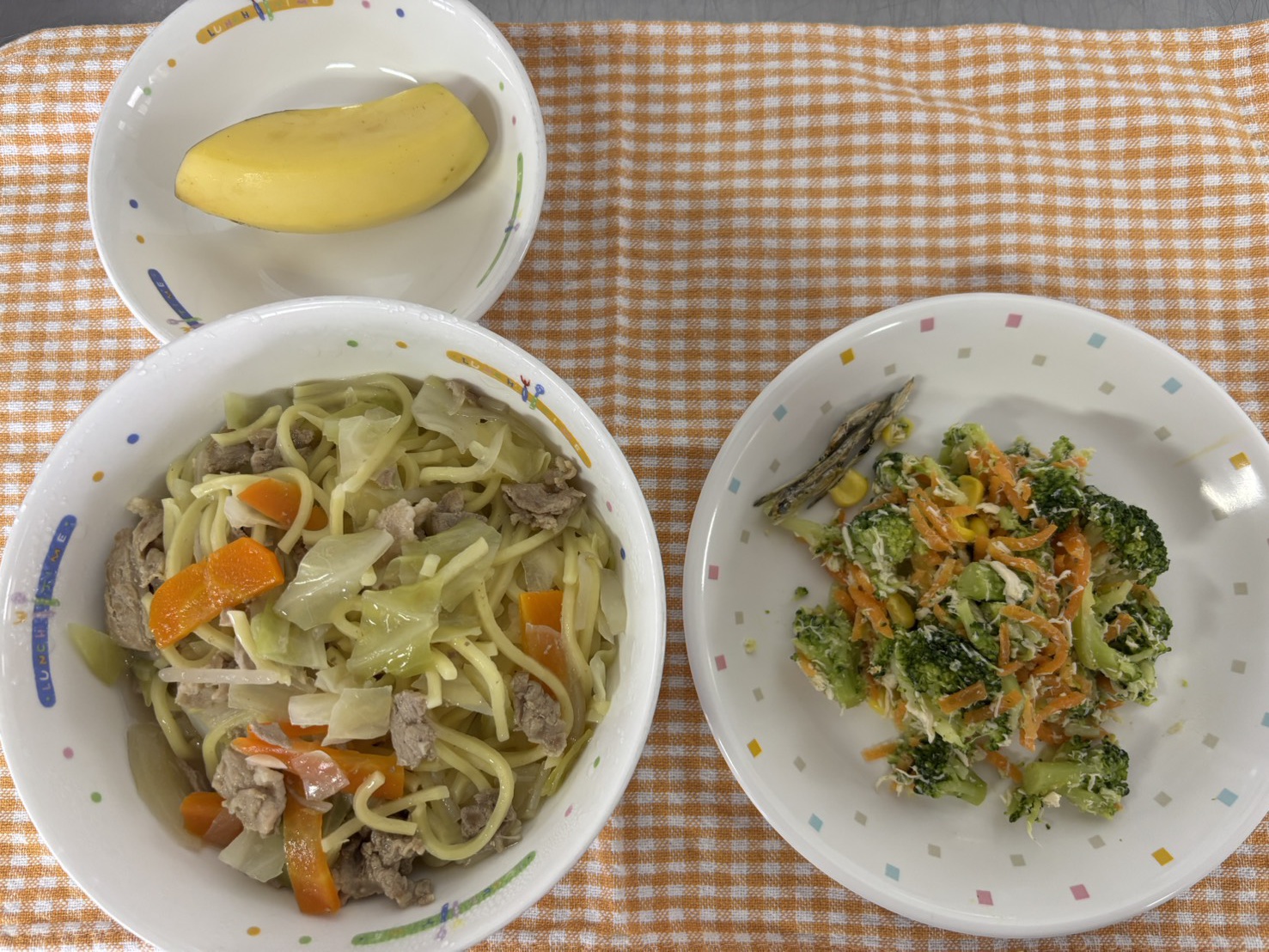 【給食】・ちゃんぽん ・ブロッコリーのチキンサラダ ・バナナ・いりこ 【おやつ】・お茶・ゆかりおむすび